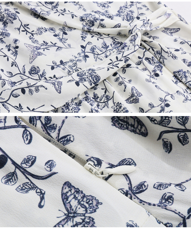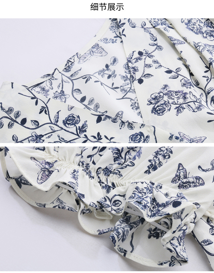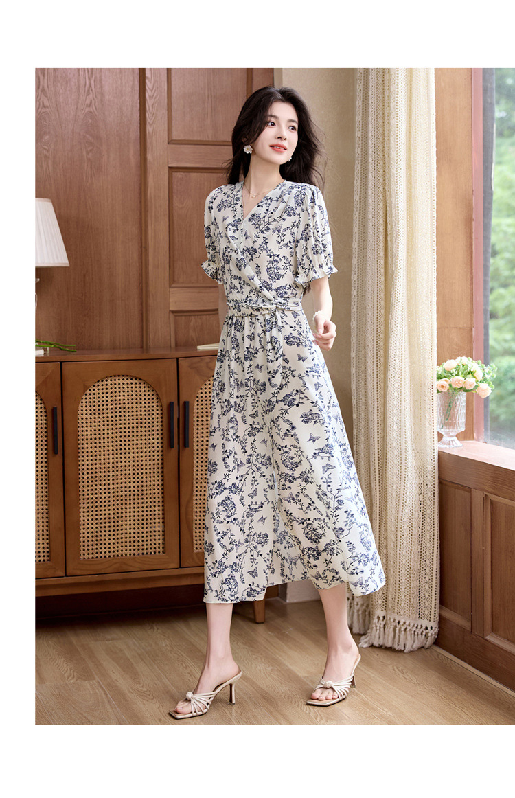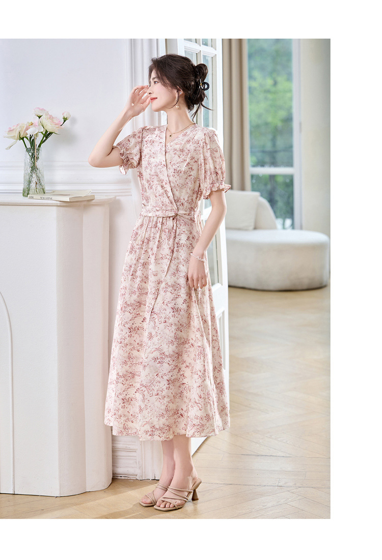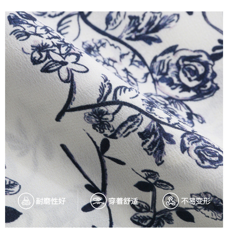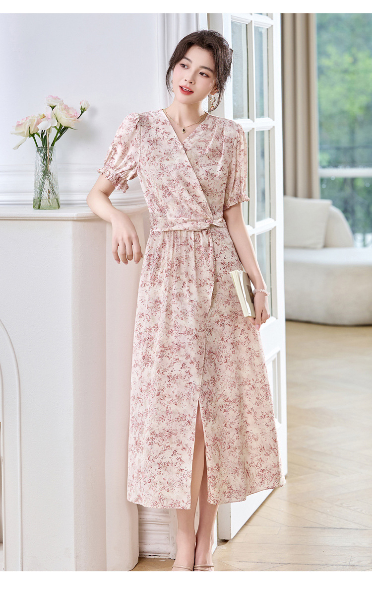 ASE夏季新款V领褶皱收腰印花桑蚕丝连衣裙小清新甜美时尚女士裙