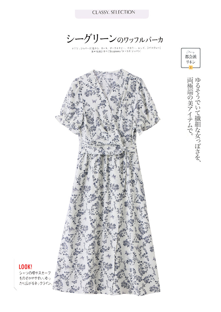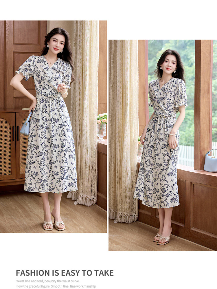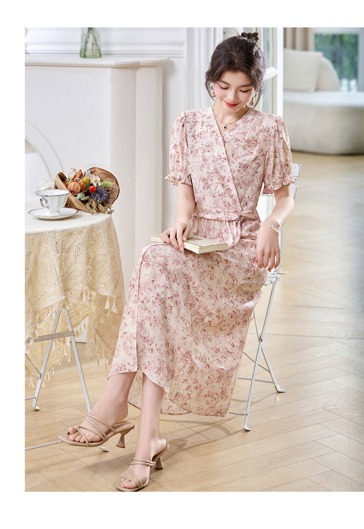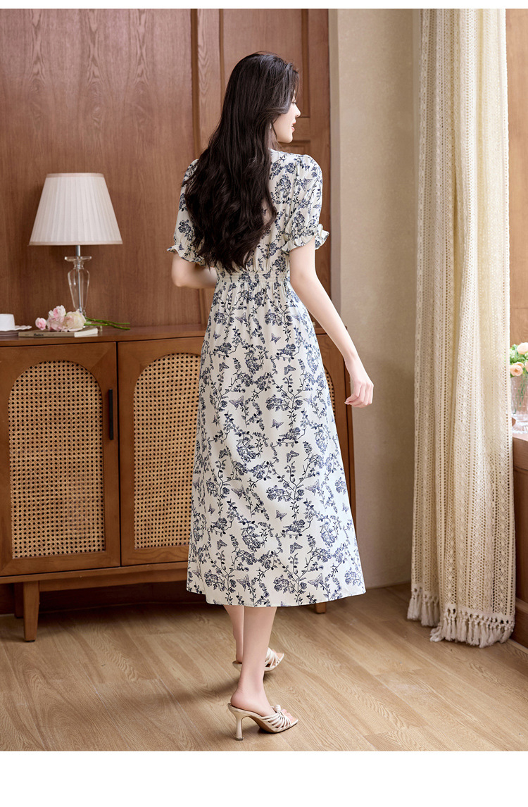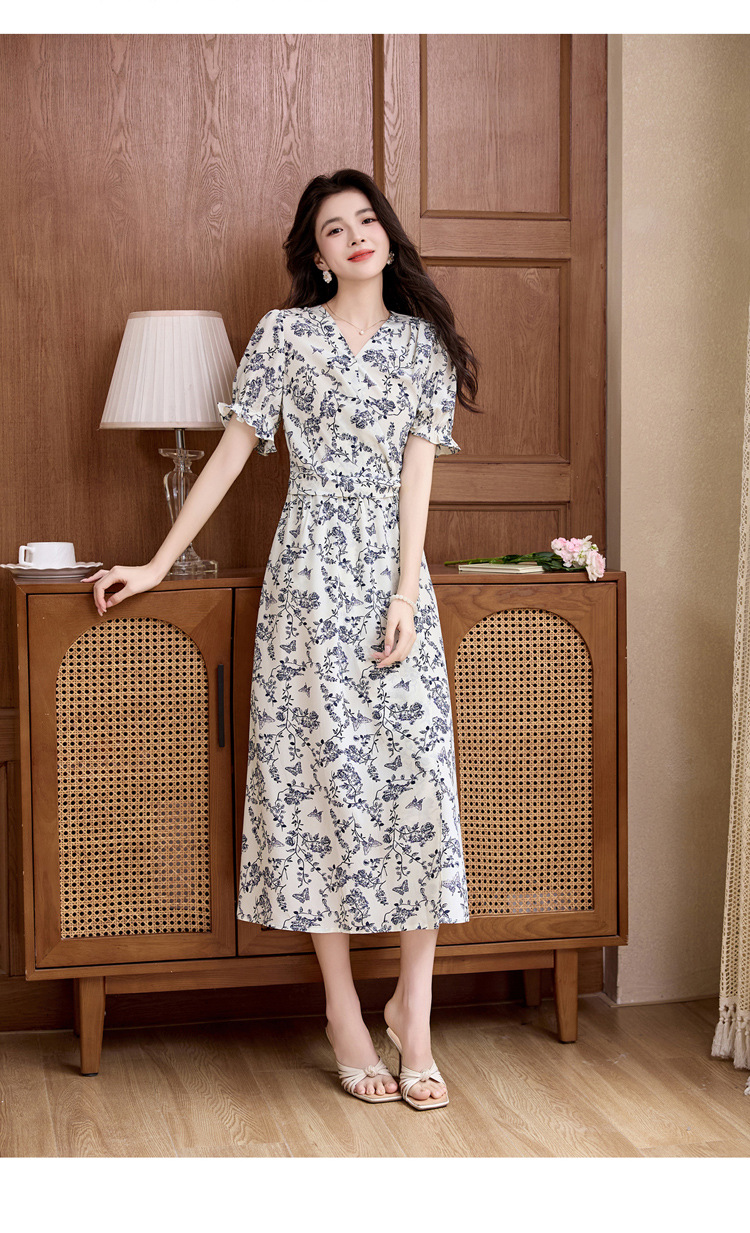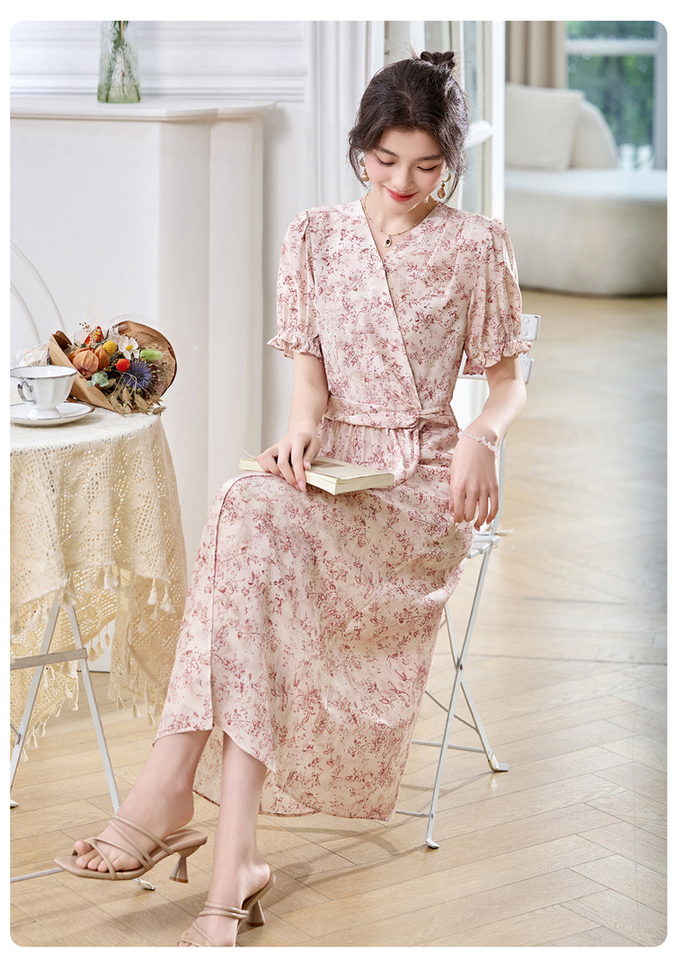 ASE夏季新款V领褶皱收腰印花桑蚕丝连衣裙小清新甜美时尚女士裙