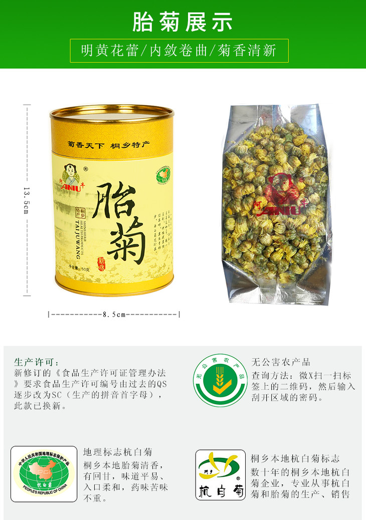 阿牛菊花茶胎菊 正宗桐乡胎菊王特级杭白菊花蕾 50g*2罐 包邮