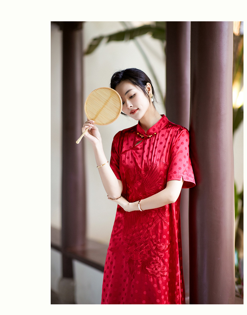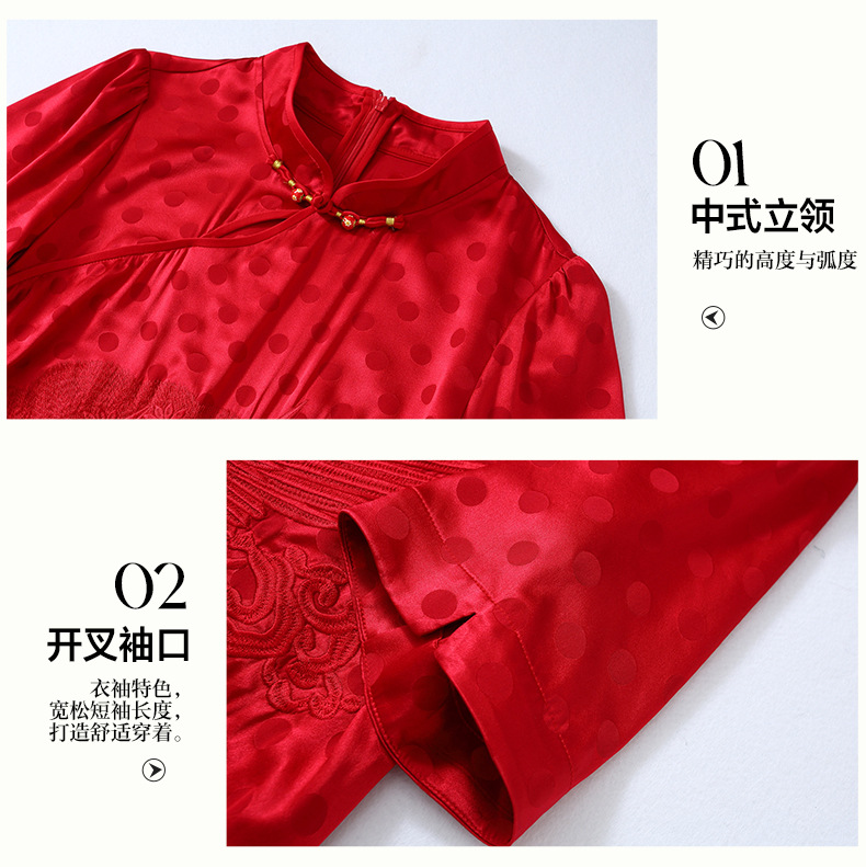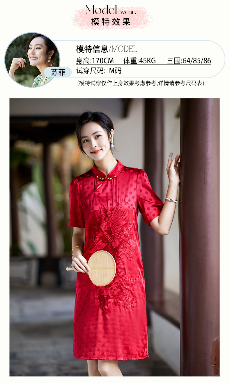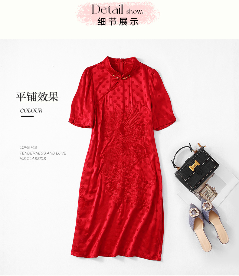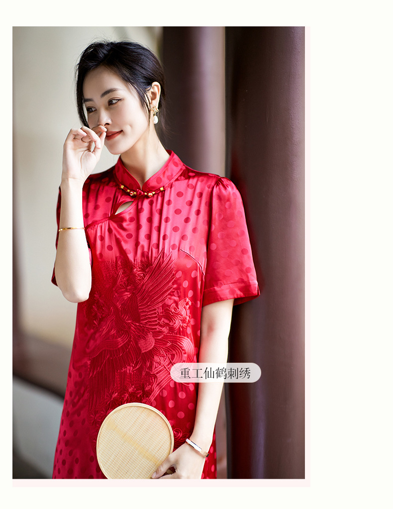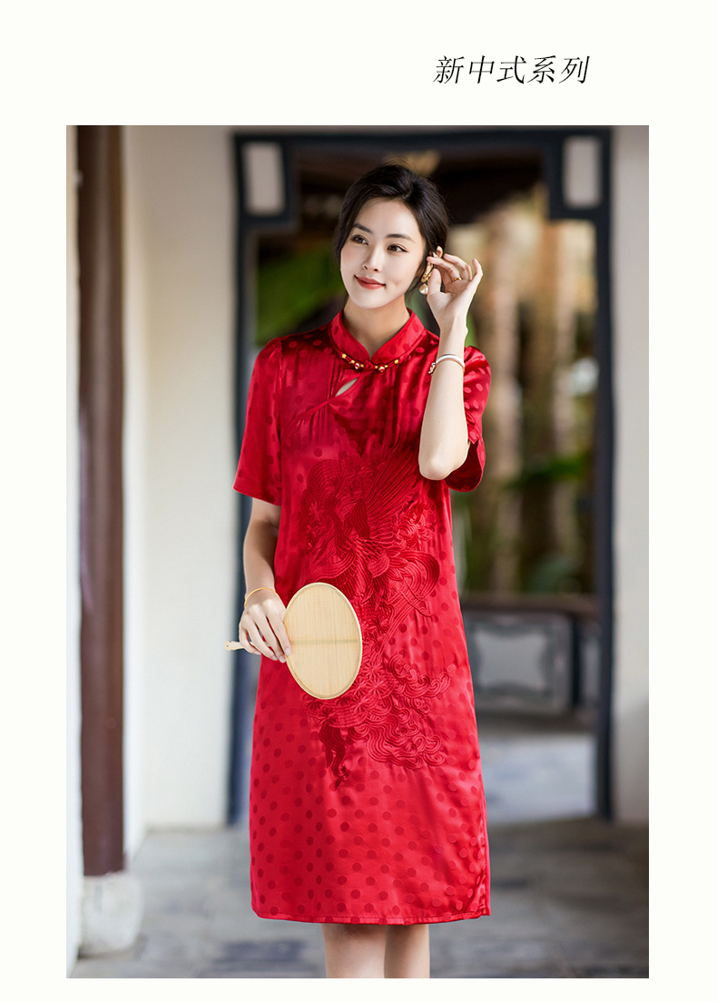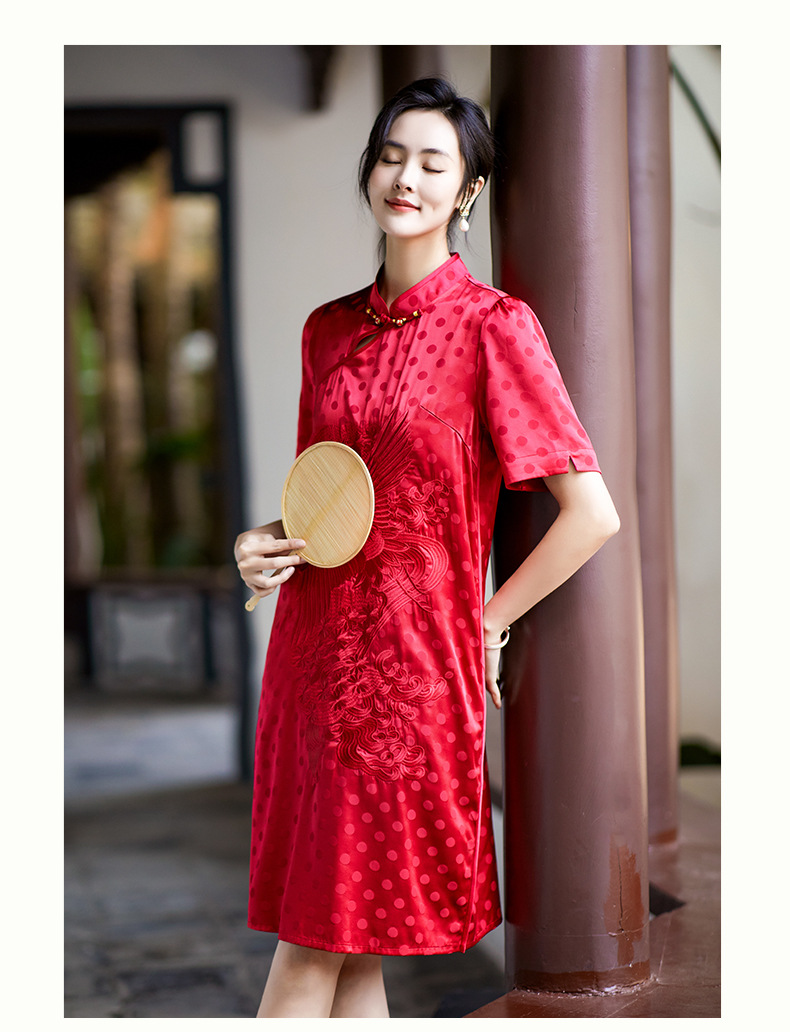 丁摩 夏季新品女装国风旗袍波点提花凤凰刺绣A字版双乔真丝连衣裙5ZF-75214
