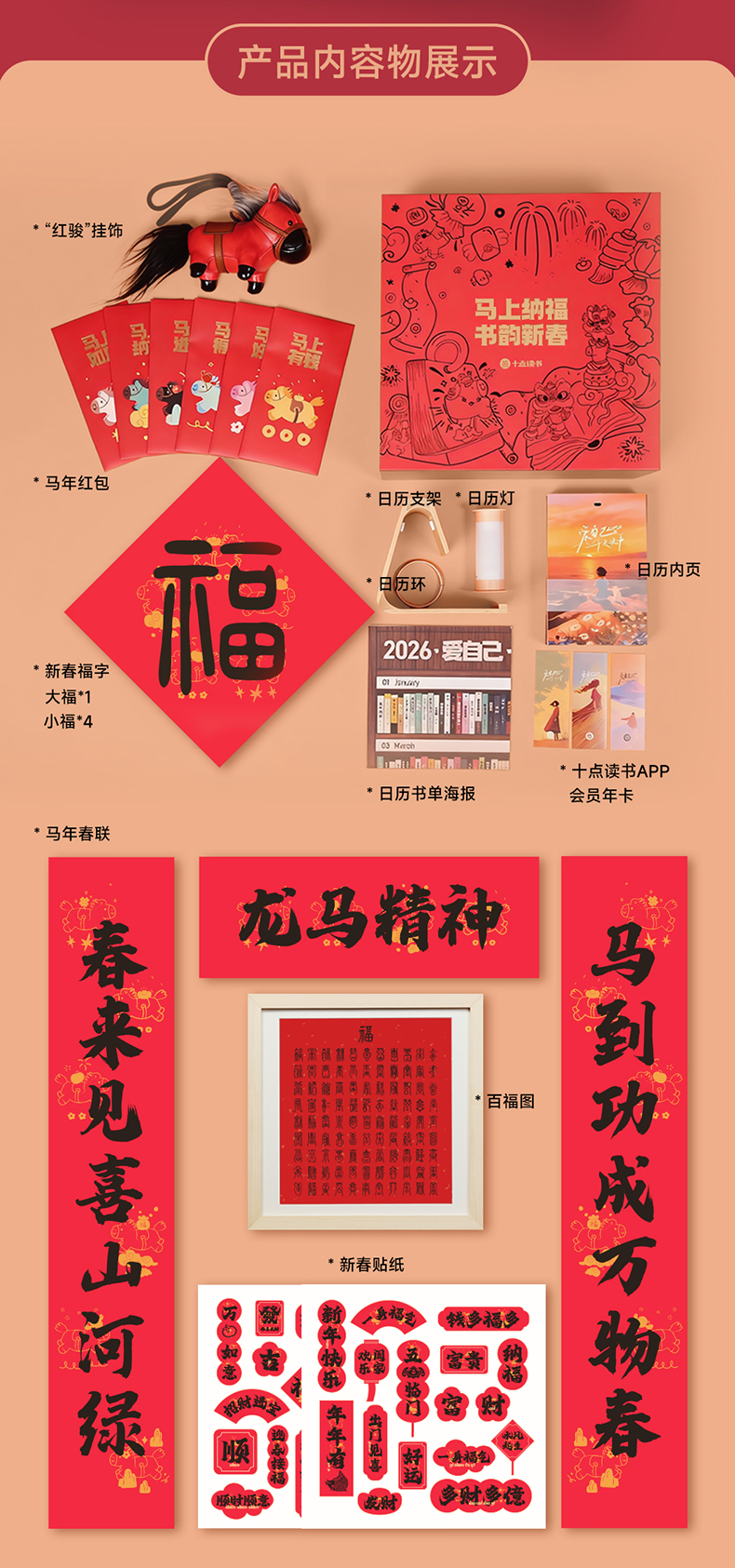 【春晚同款马,拍1发18】《十点读书·夜灯听书日历》新年礼盒,皮革马+日历+红包+春联+门神+大福小福+3张听书会员年卡,人民日报联合出版