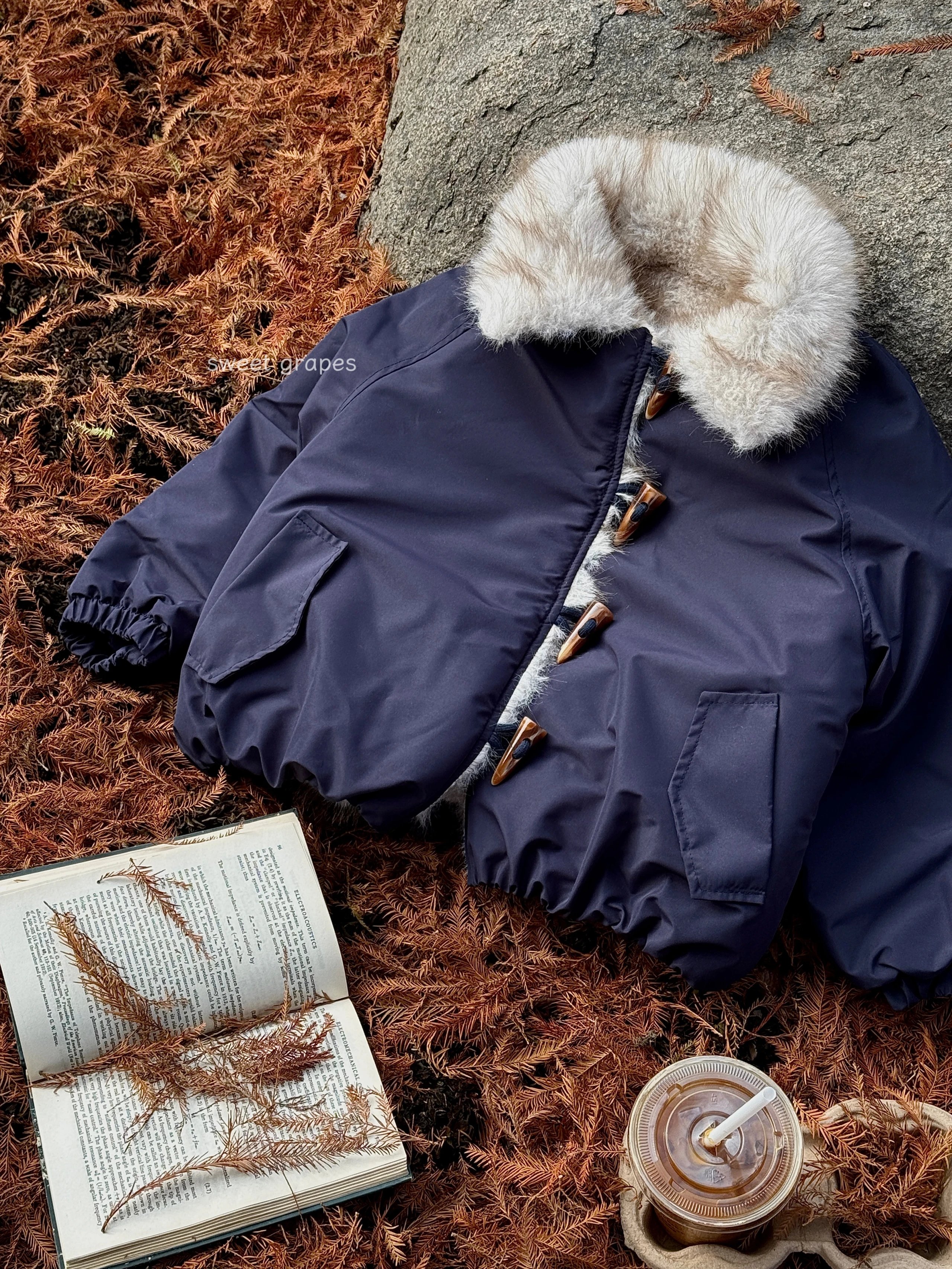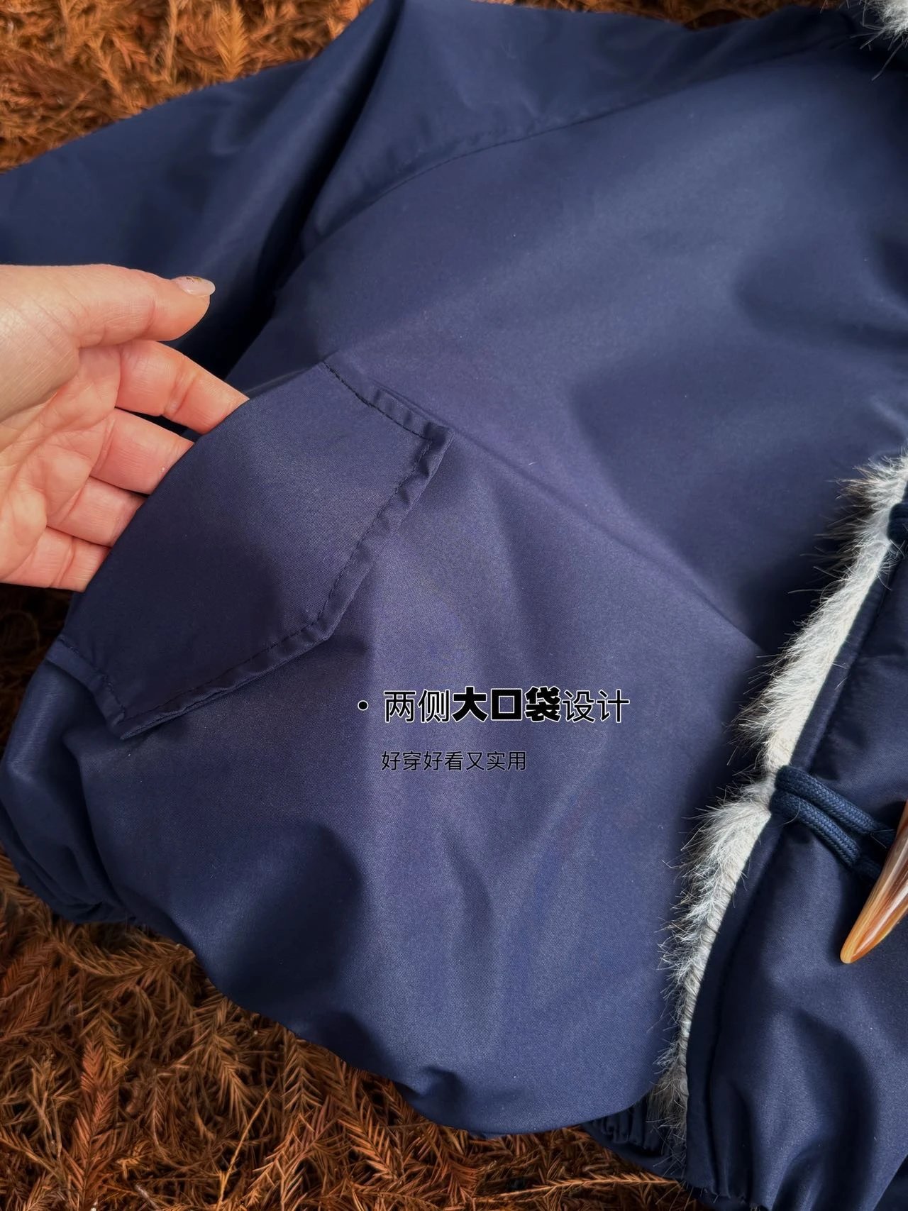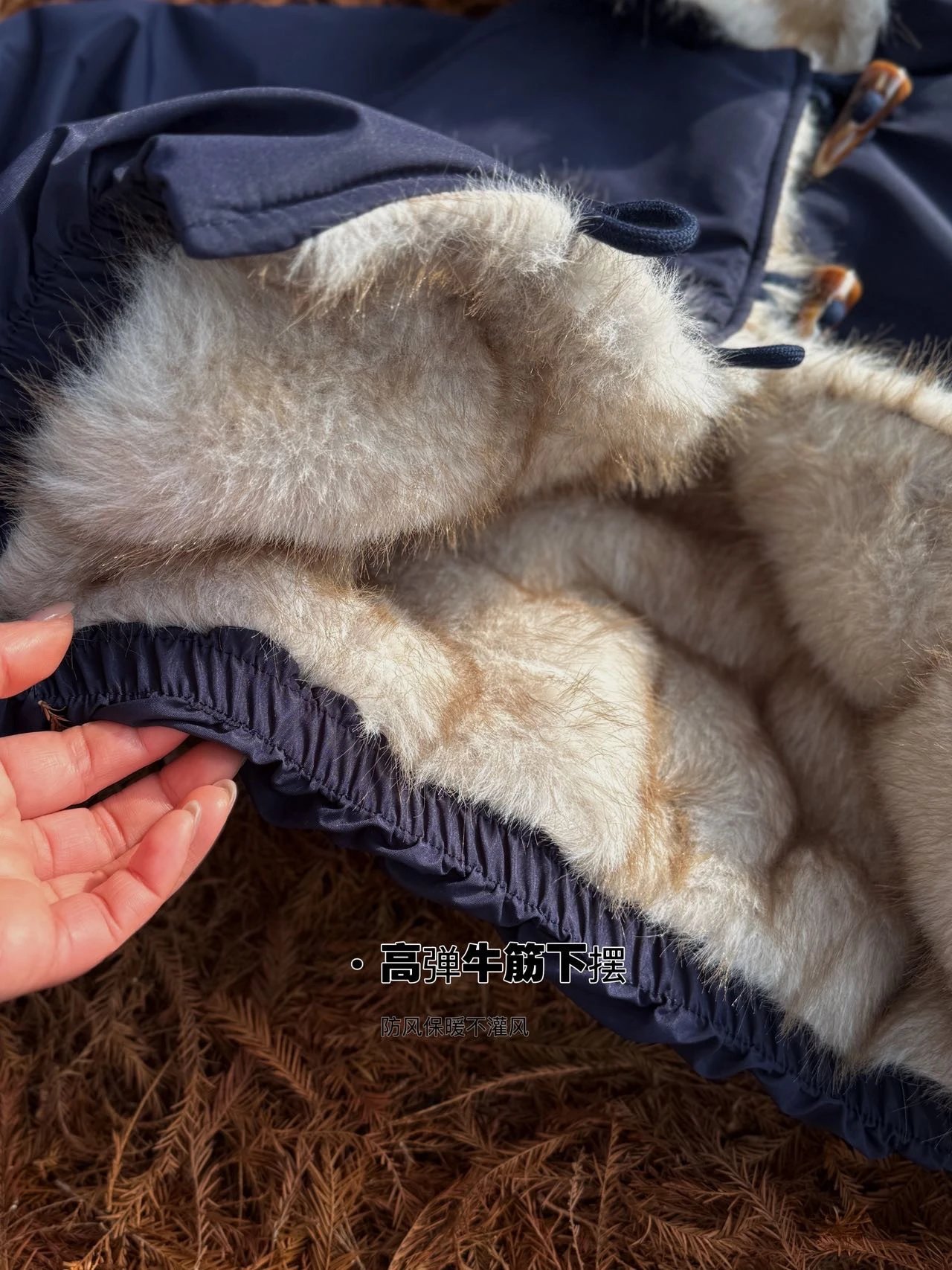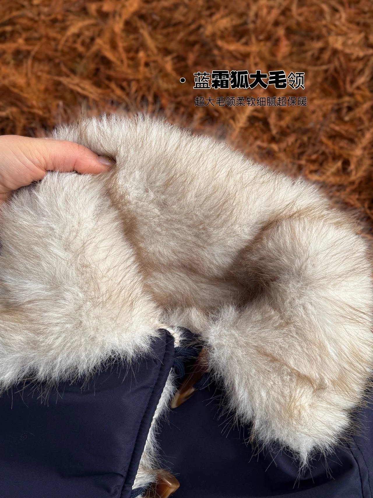 ✔️藏青色三防面料+仿真狐狸毛,蓝霜狐质感超赞,上身自带高级滤镜,oversize轮廓藏肉,气场全开!