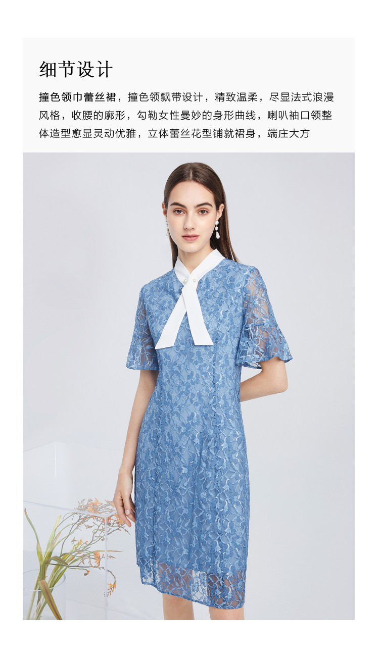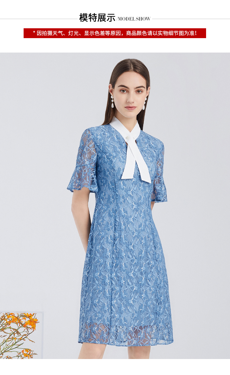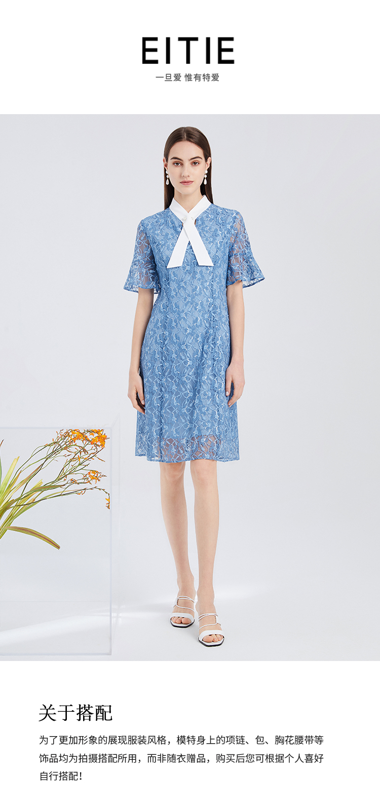 EITIE爱特爱夏季新款优雅洋气V领飘带收腰显瘦通勤蕾丝连衣裙B2107716