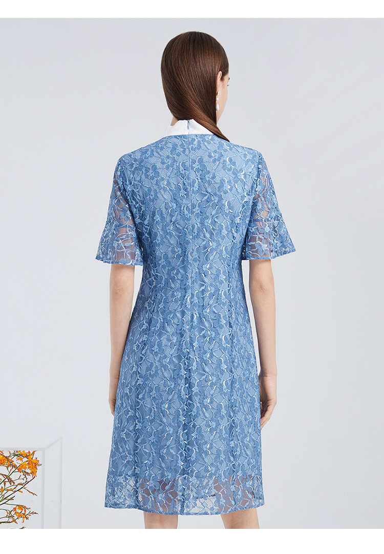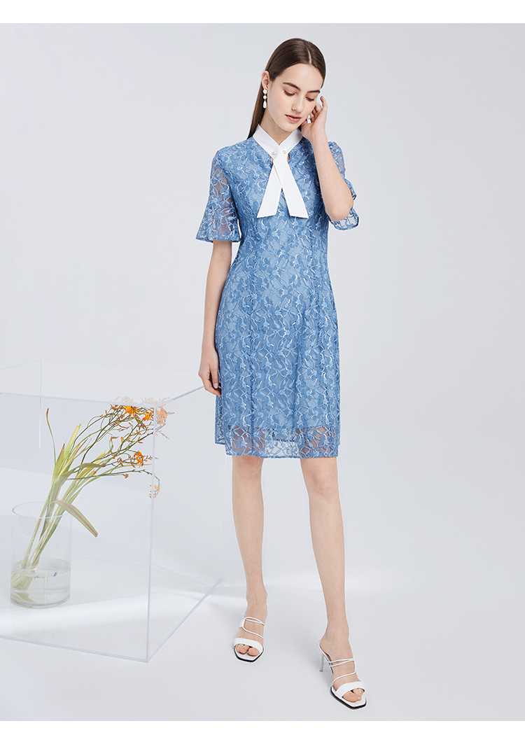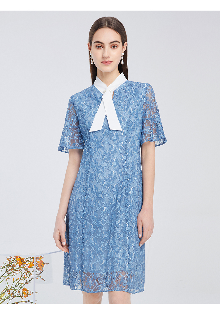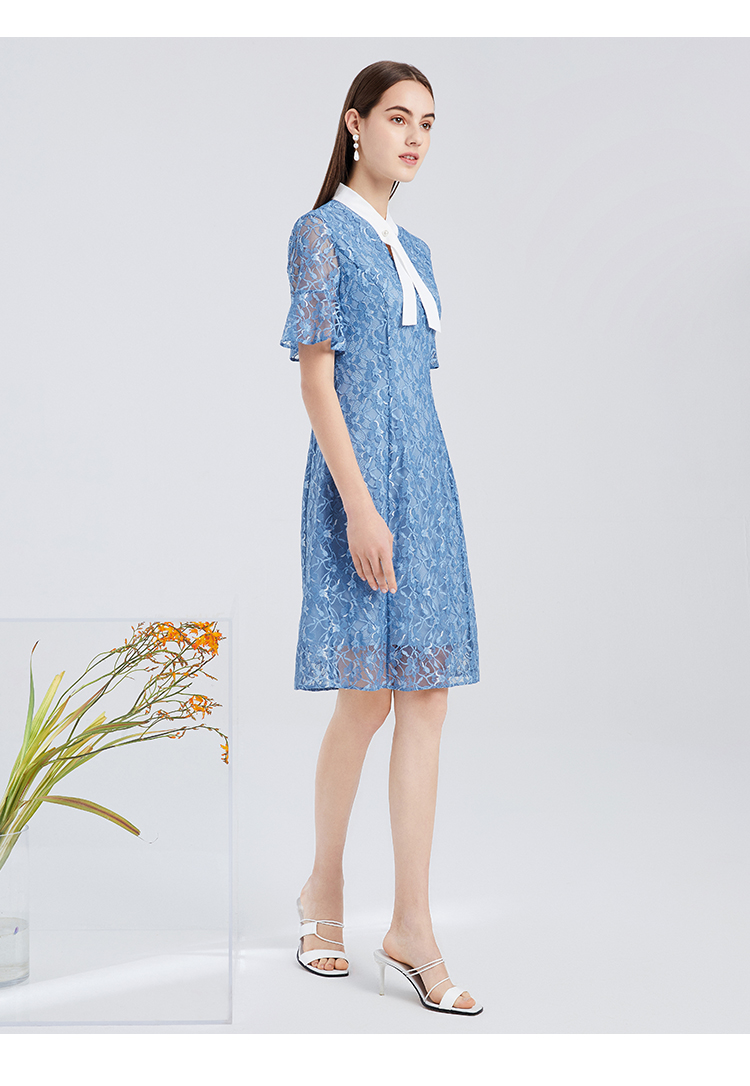 EITIE爱特爱夏季新款优雅洋气V领飘带收腰显瘦通勤蕾丝连衣裙B2107716