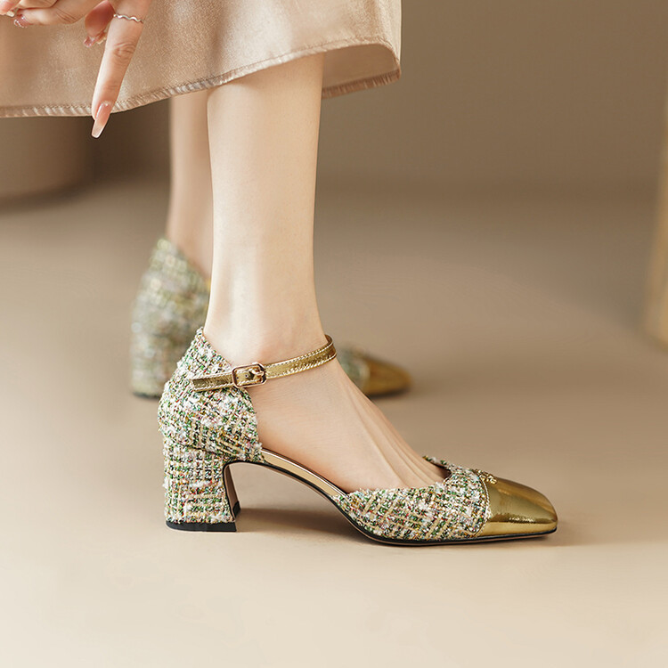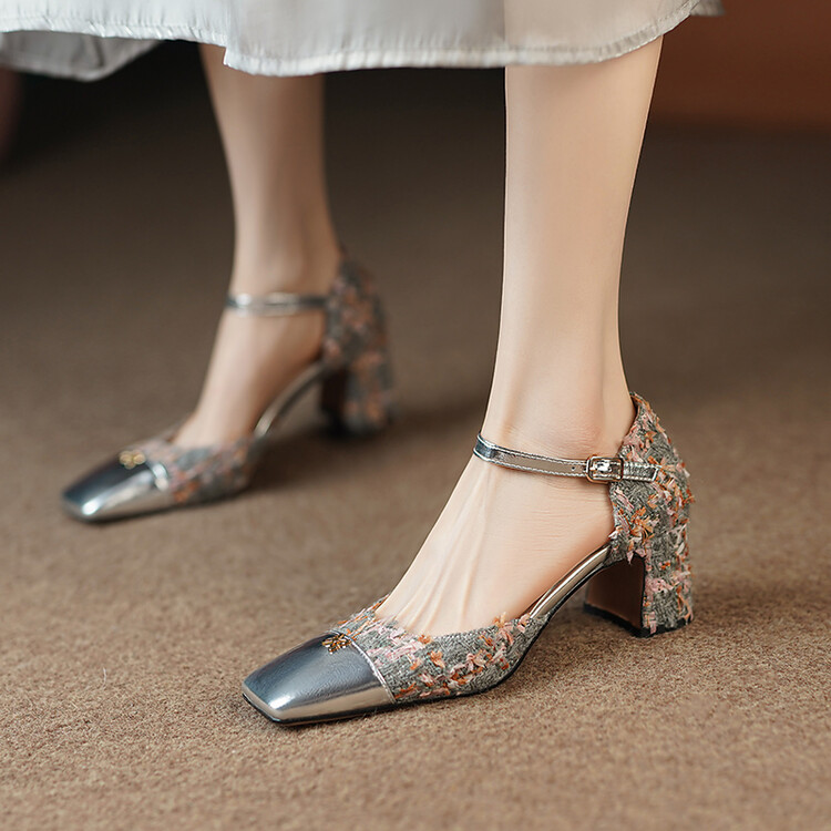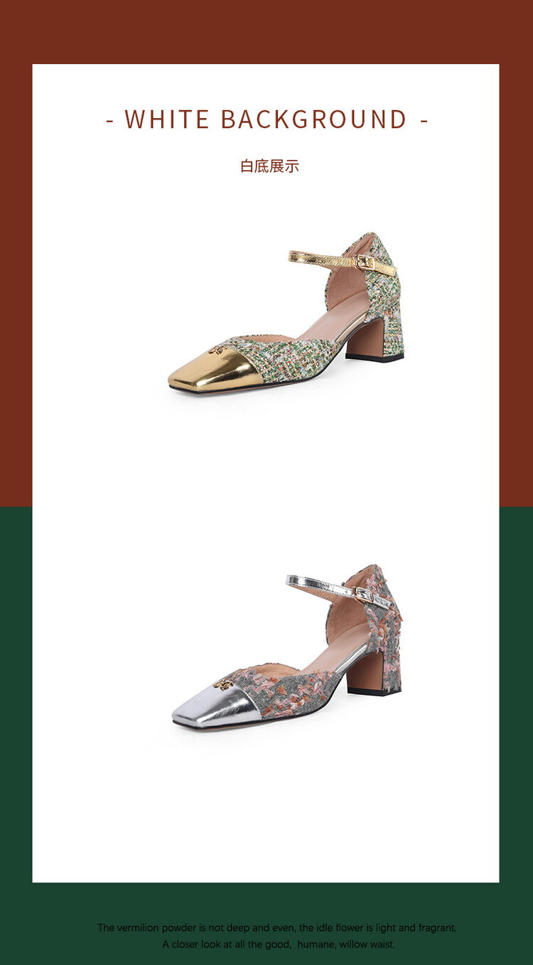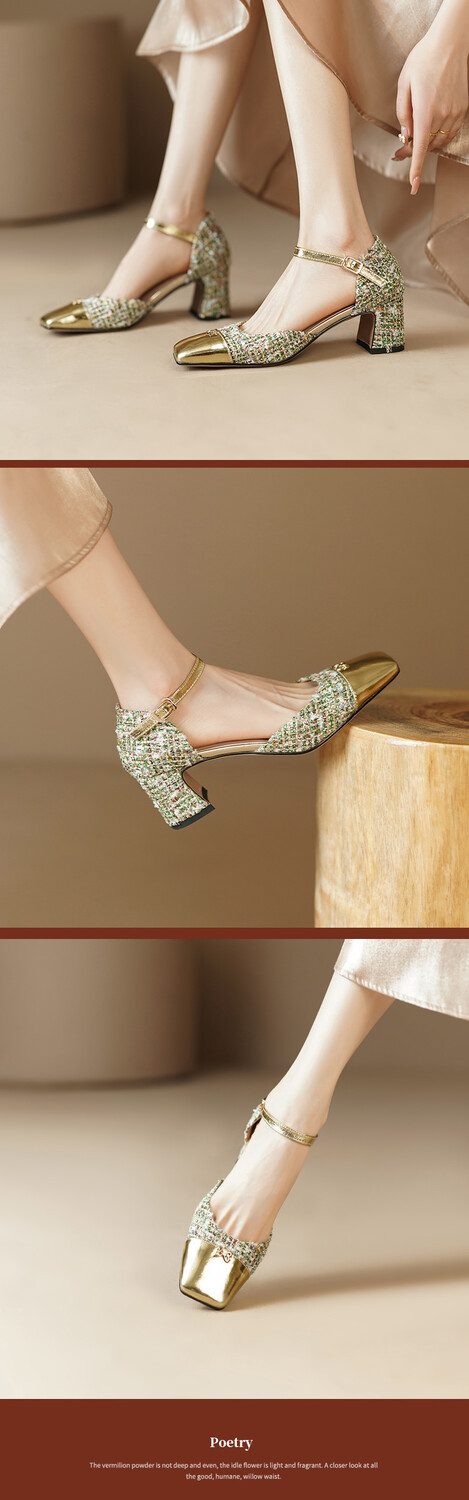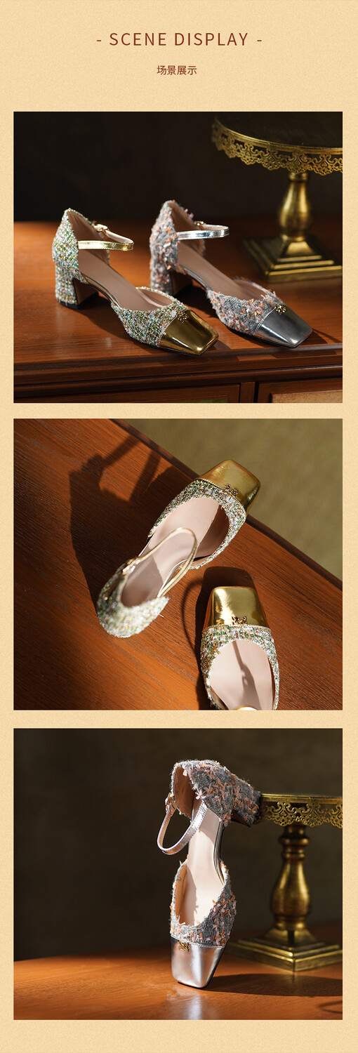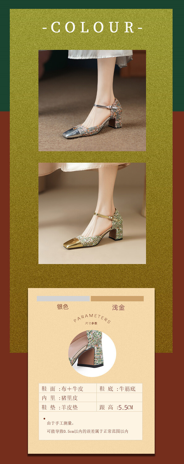 【预售5天】小香风方头粗跟包头凉鞋,法式真皮拼色中跟玛丽珍一字带高跟鞋SLK&Y320
