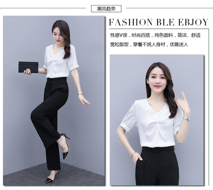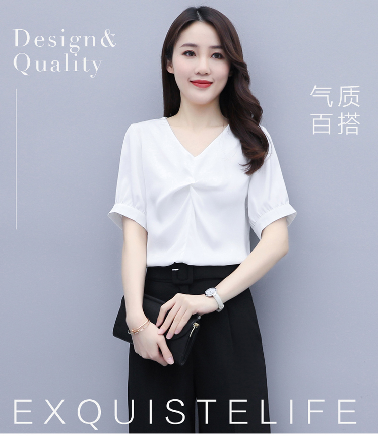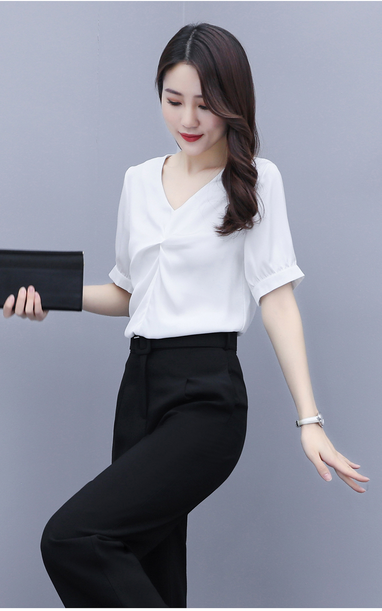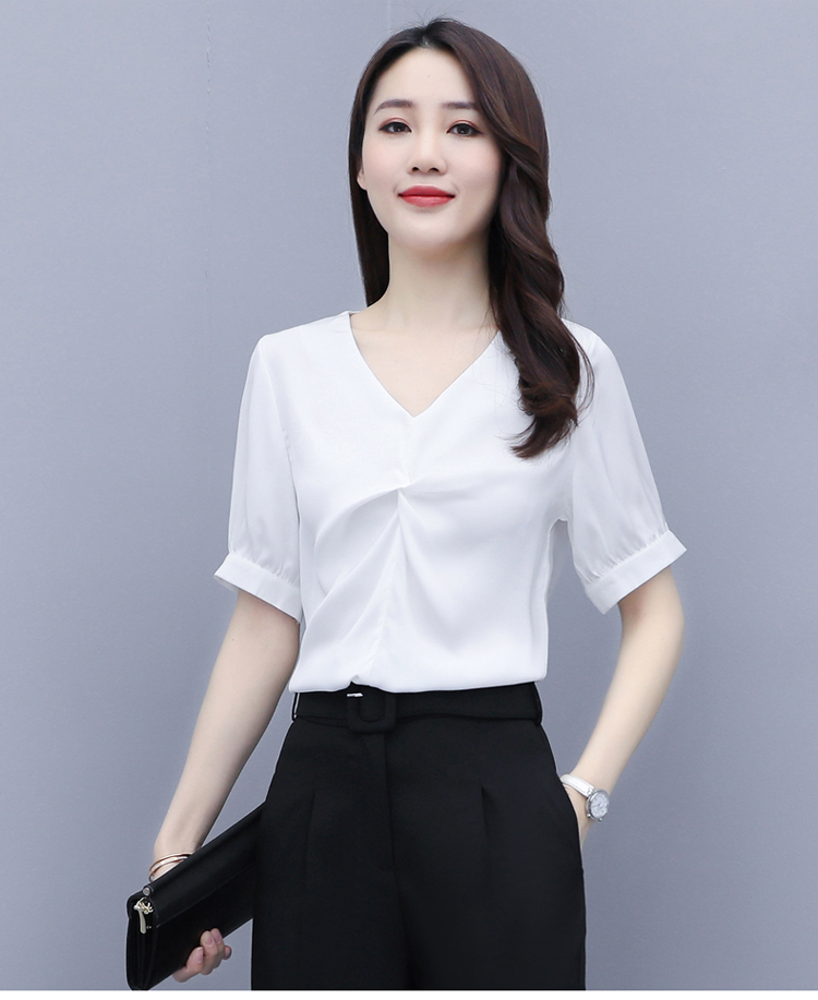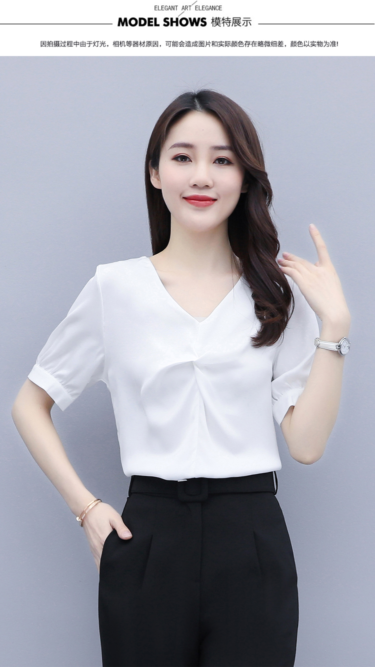 WZNH-XYFS6876夏装新款纯色百搭短袖V领气质白衬衫
