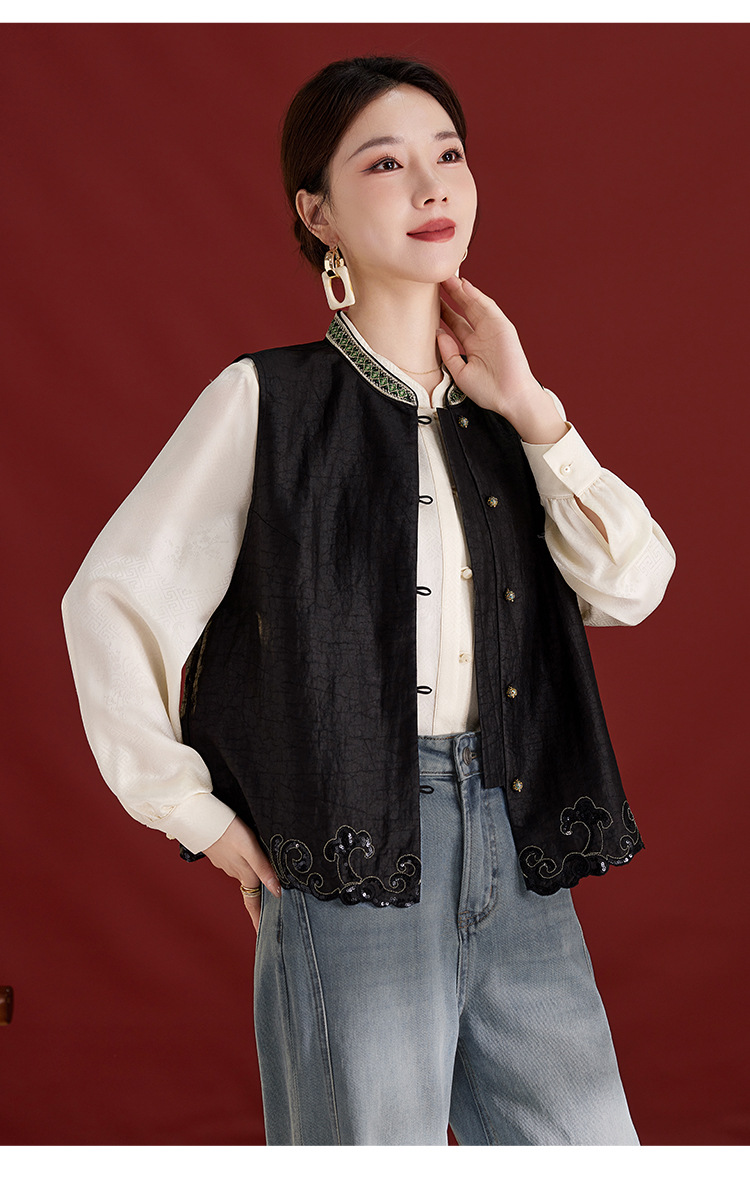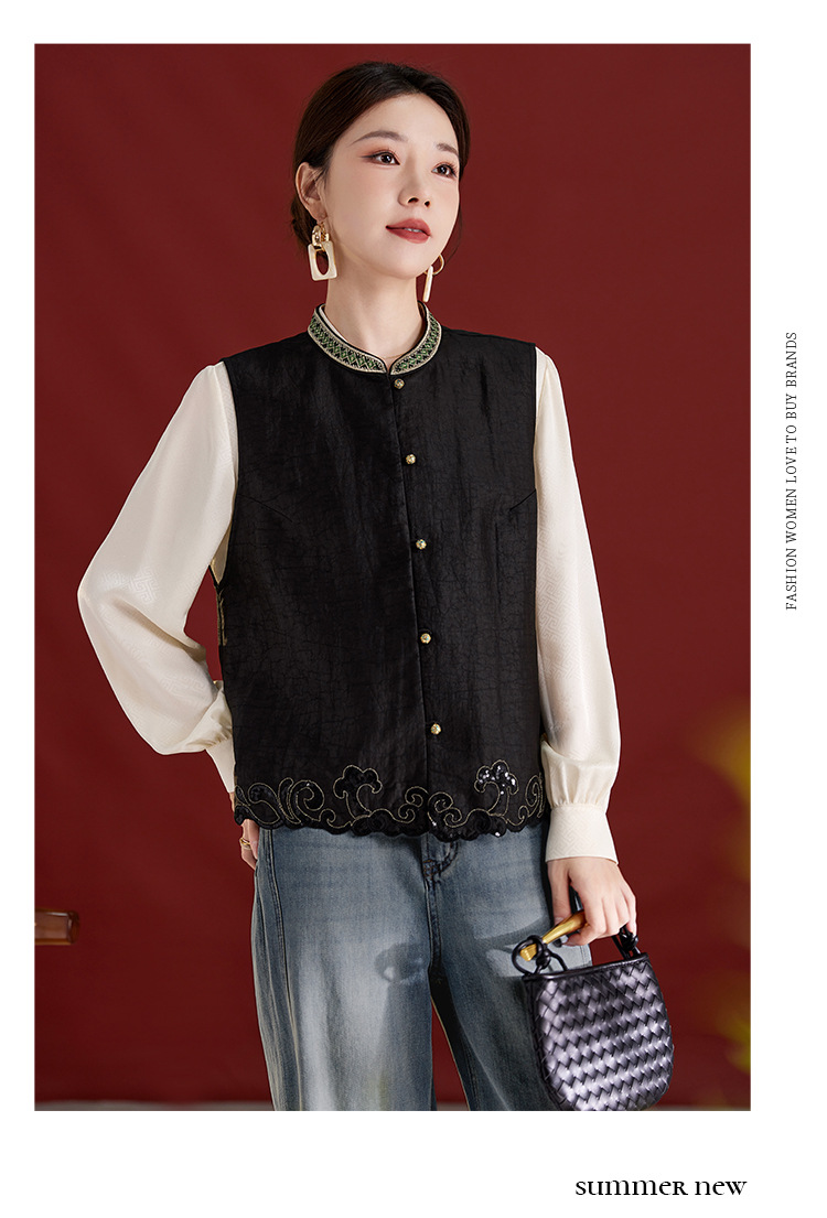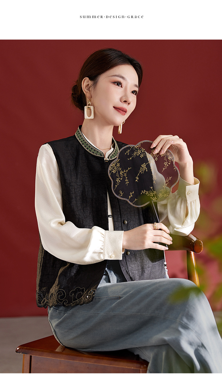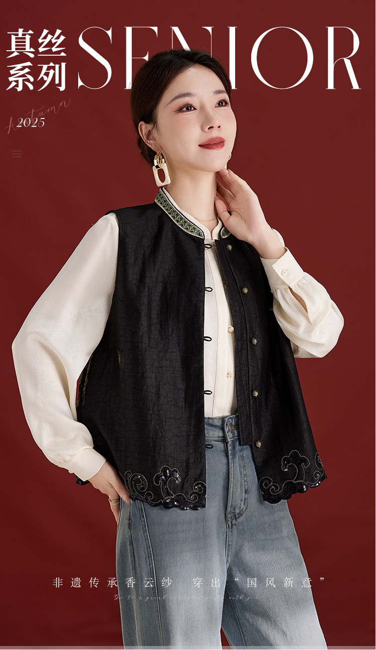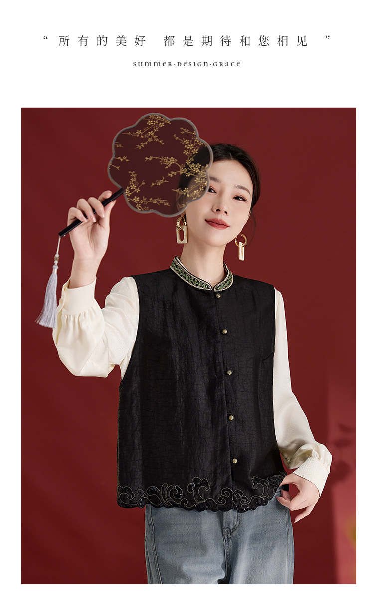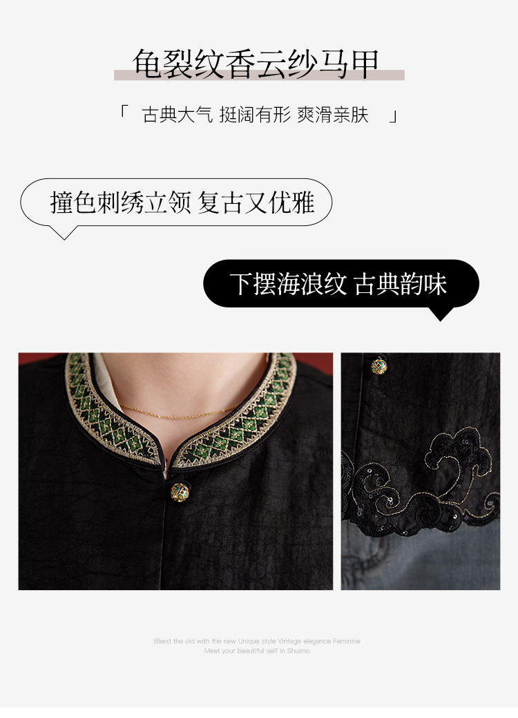 QS【翠影依依】重磅桑蚕丝香云纱龟纹老料无袖刺绣马甲短款上衣1767