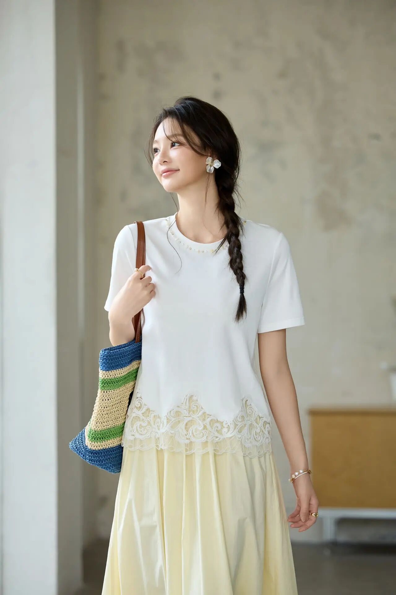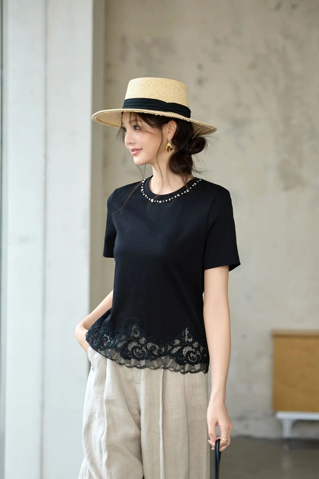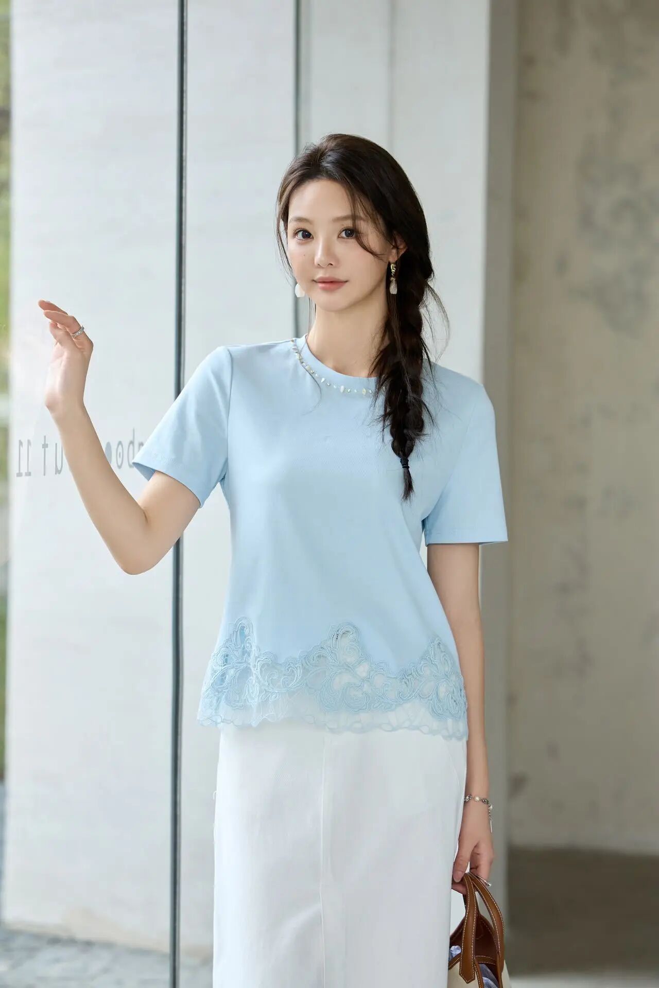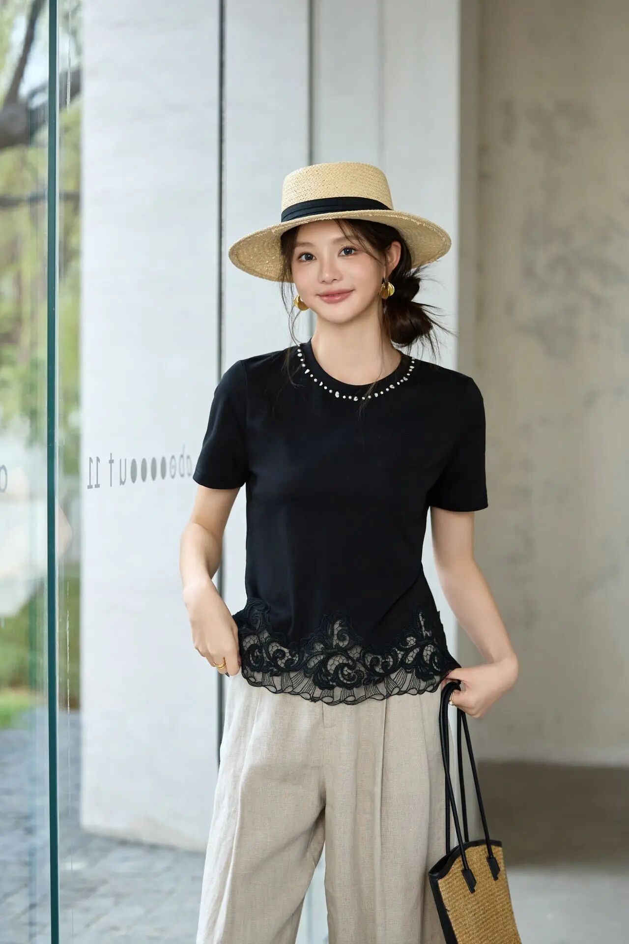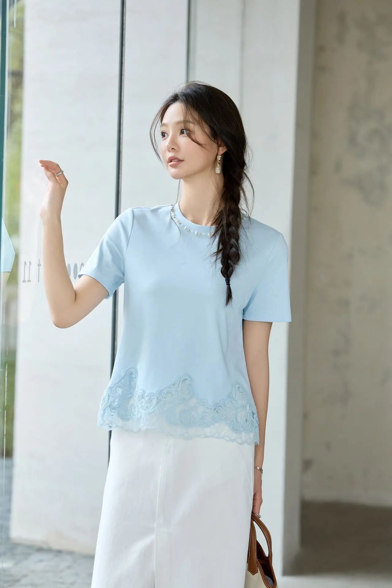 全新升级【铂金会员146/天猫199/差价53】(21225) 洛诗琳新款宽松拼接短袖t恤圆领蕾丝下摆花边T恤上衣短袖
