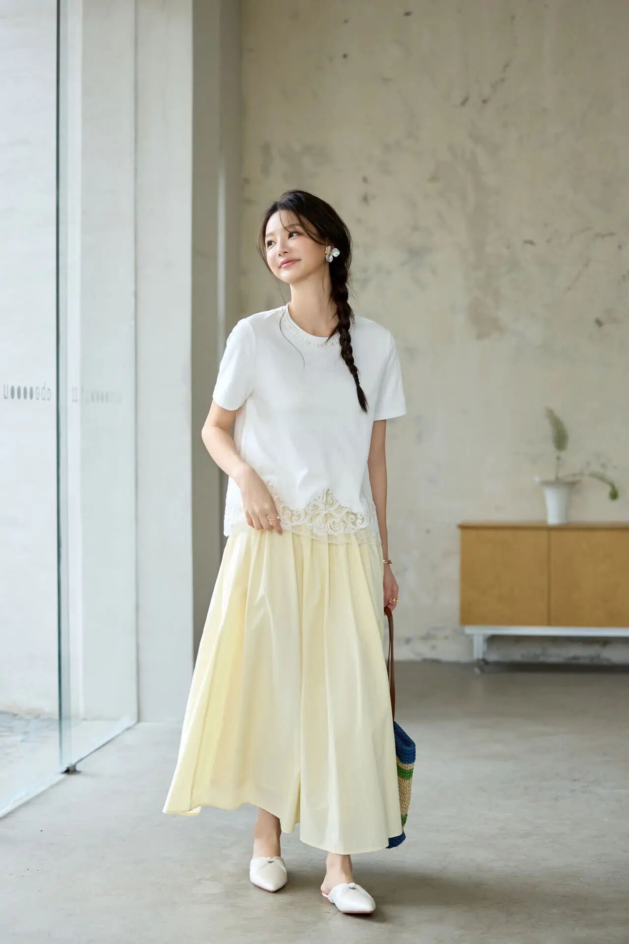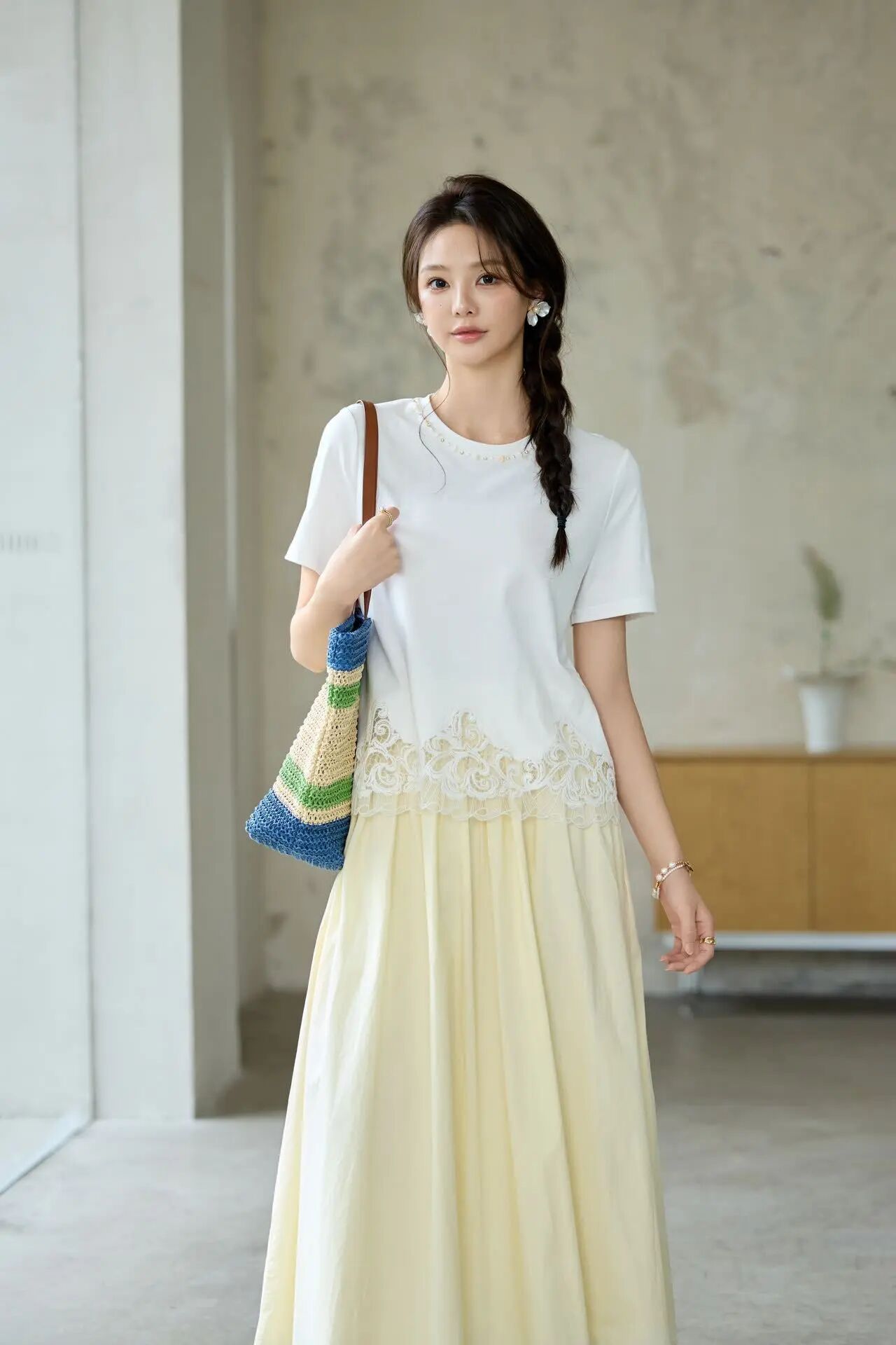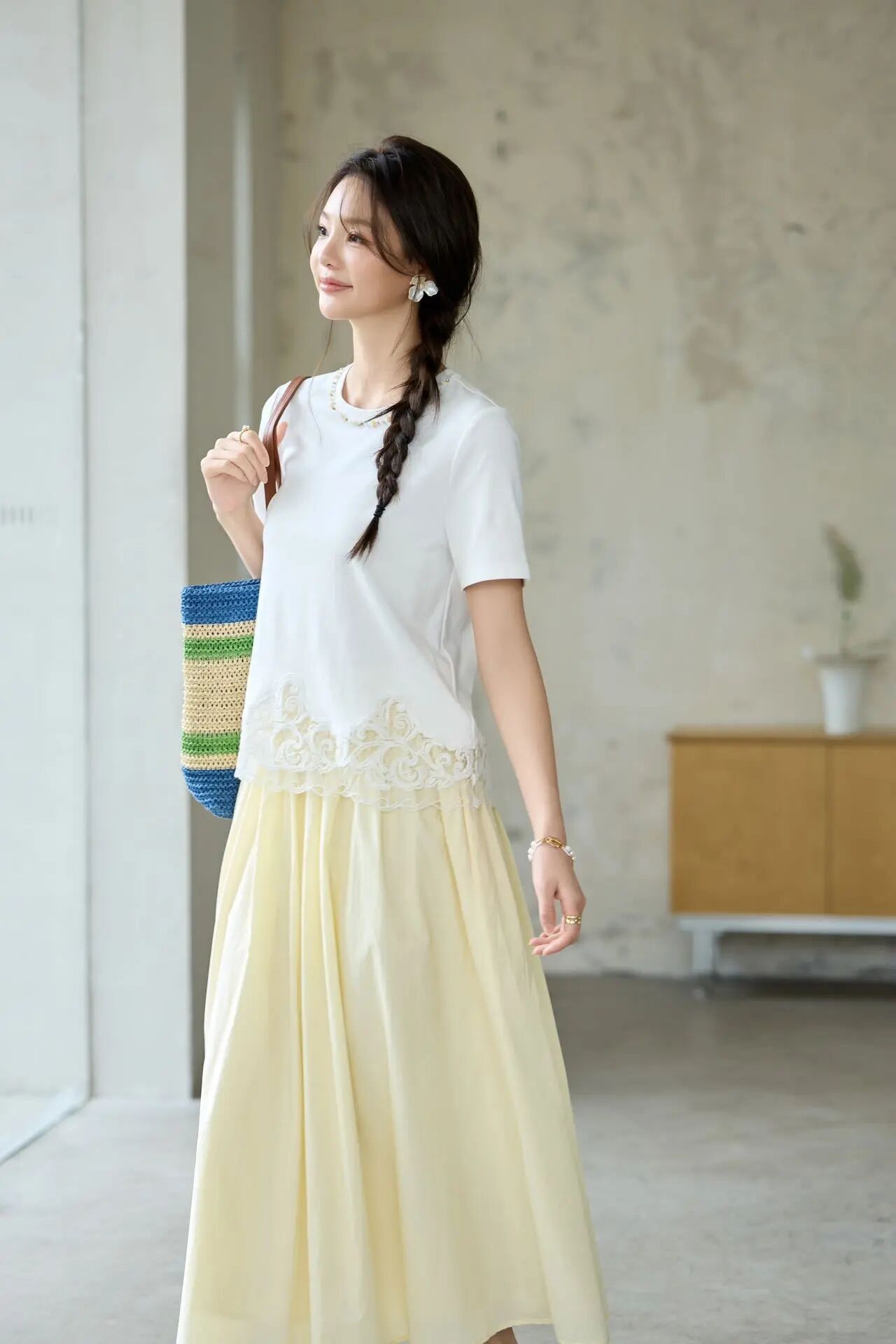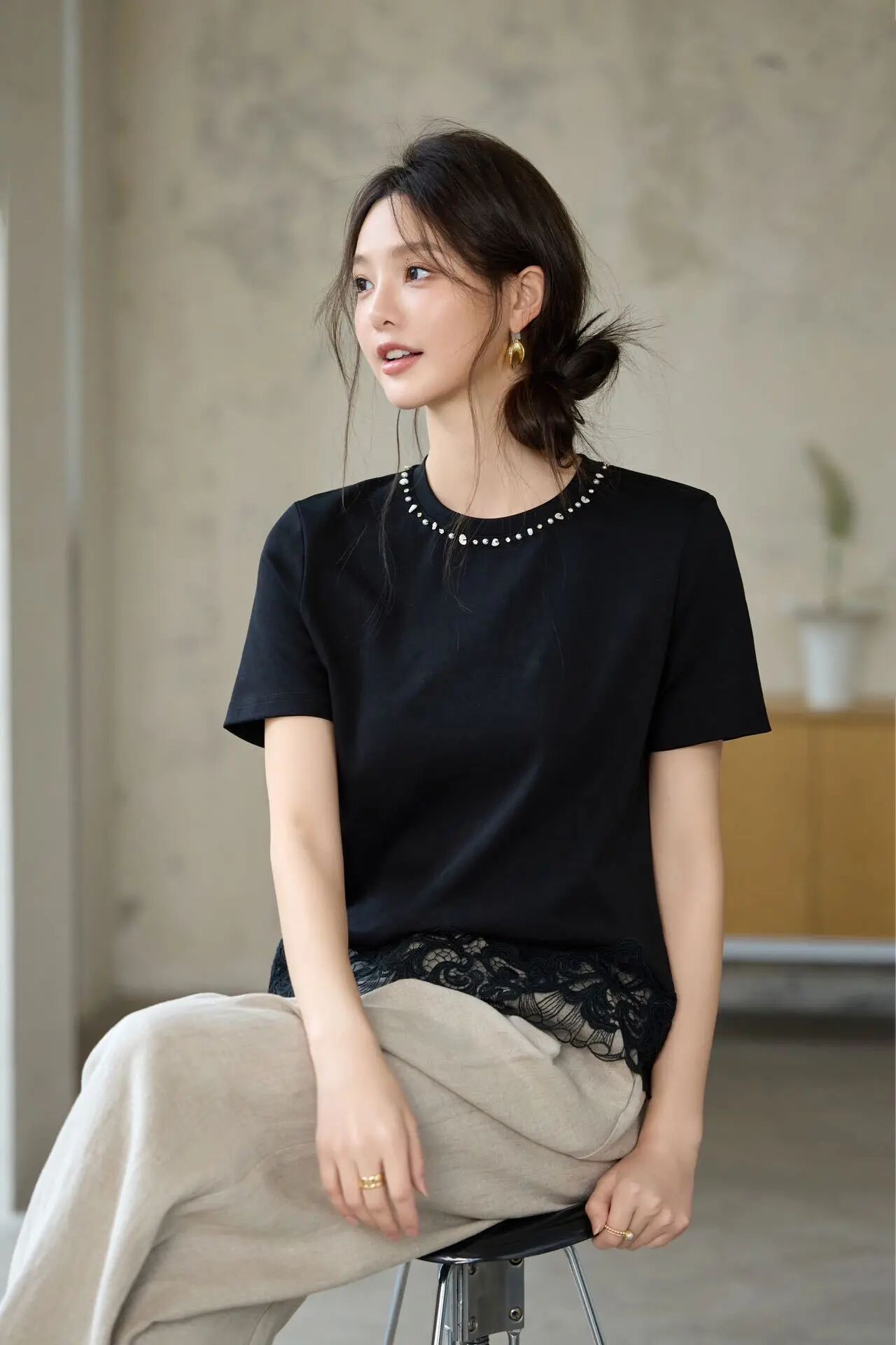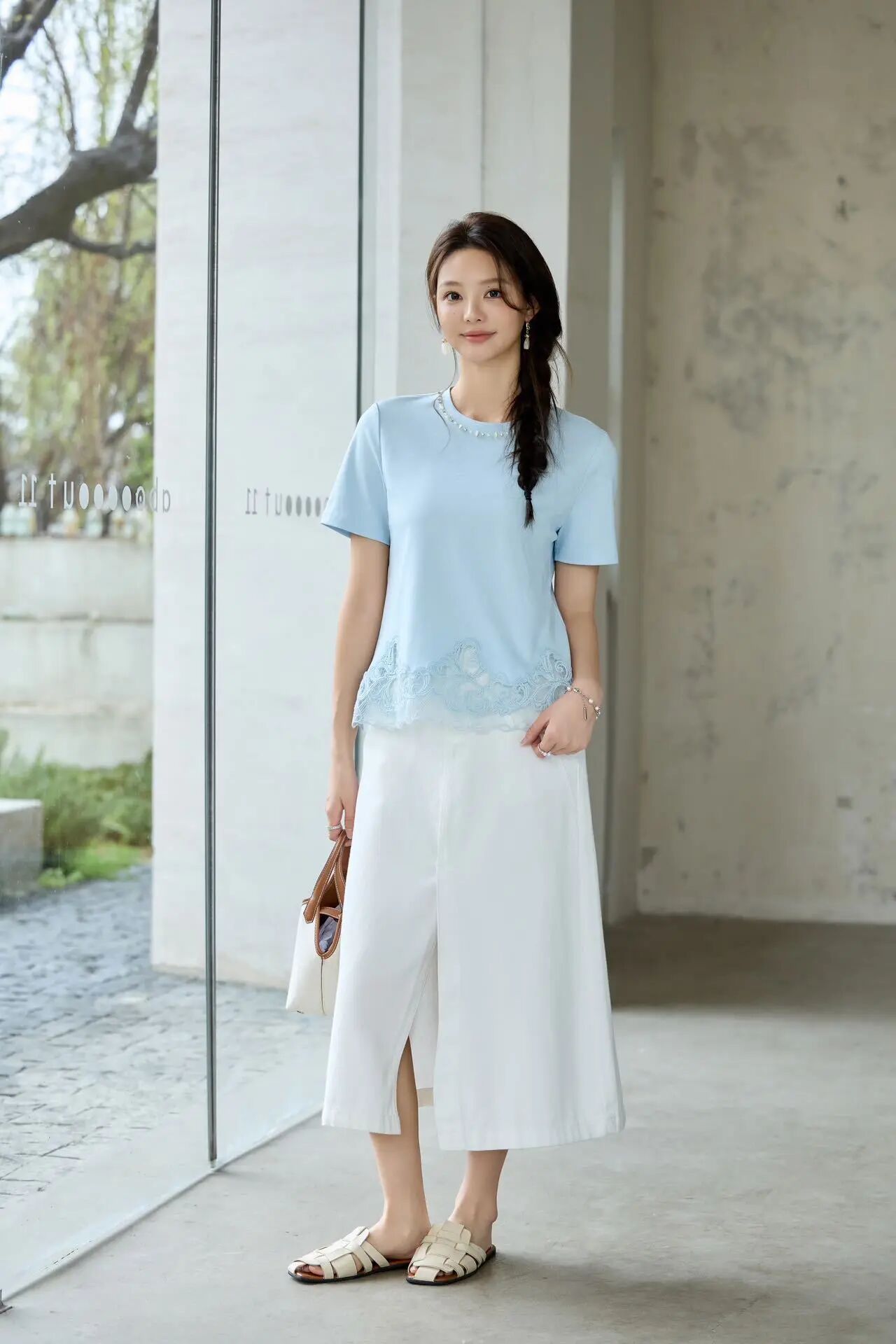 全新升级【铂金会员146/天猫199/差价53】(21225) 洛诗琳新款宽松拼接短袖t恤圆领蕾丝下摆花边T恤上衣短袖