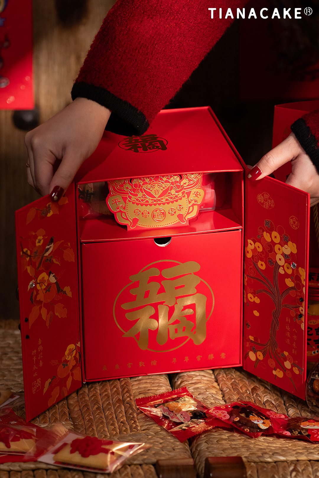 🔴礼盒形如中式宅邸的双开门,庄重又典雅,恰似要将所有的财气、喜气都迎进门。特种纸搭配烫金工艺,质感满满,细节处尽显东方美学。