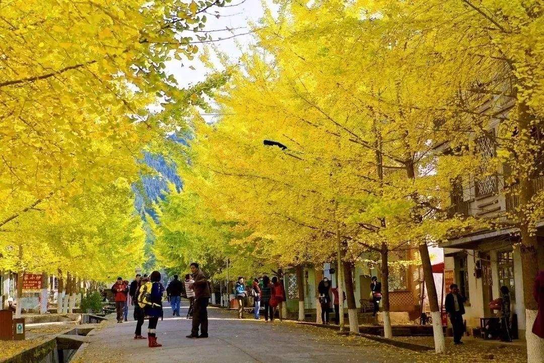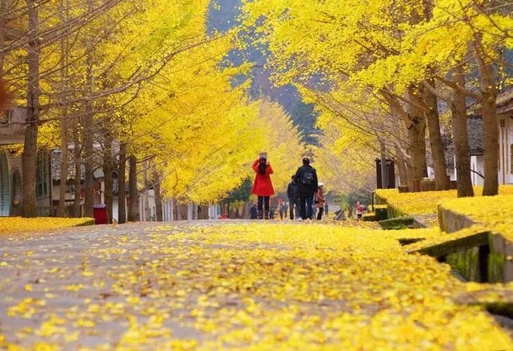 每到秋冬交替的好时节,满树金黄,绵延数百米,独具生态特色的银杏飘韵,像抹上一层油画般的色调。踩着金黄的落叶铺成的地毯,像走进童话里的金色世界,使人眷念无限。既有欧洲小镇的浪漫情调,也有中国小镇的历史烙印。