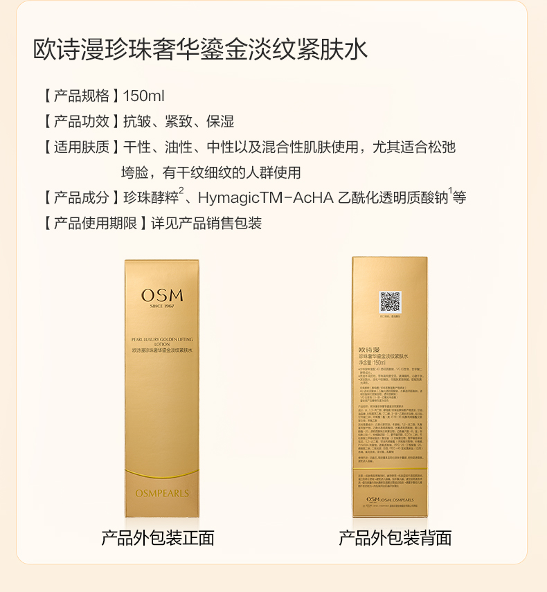 欧诗漫珍珠奢华鎏金淡纹紧肤水150ml淡纹紧致饱满强韧焕亮