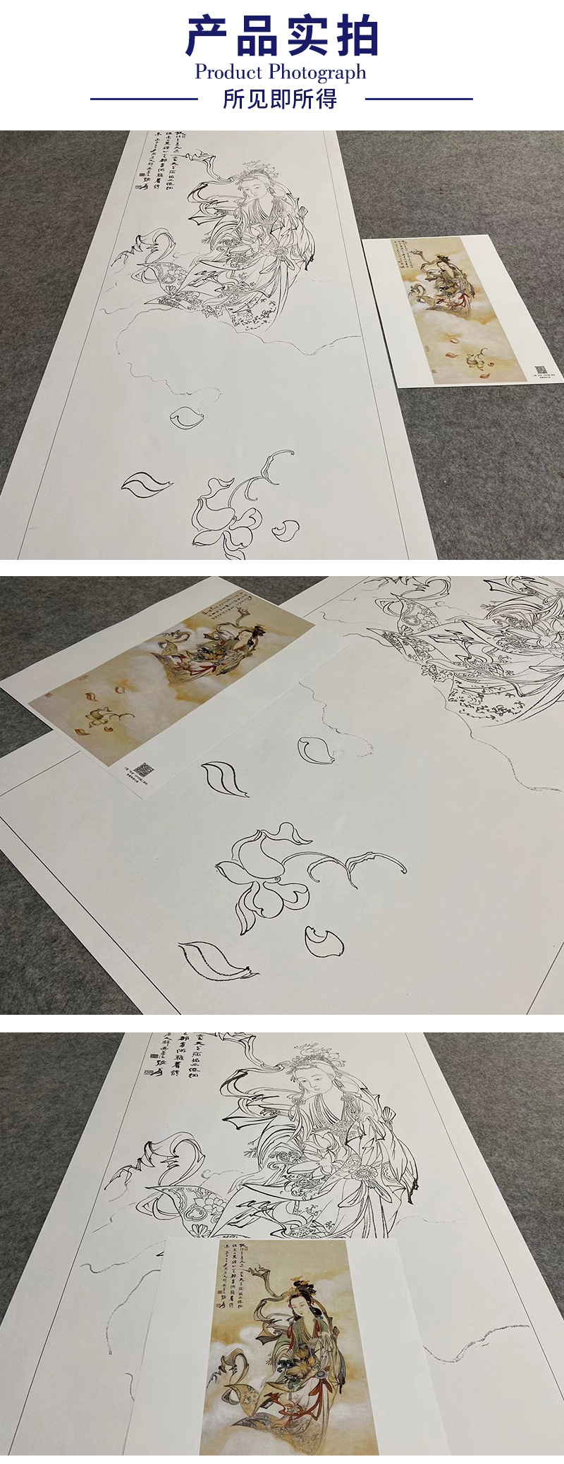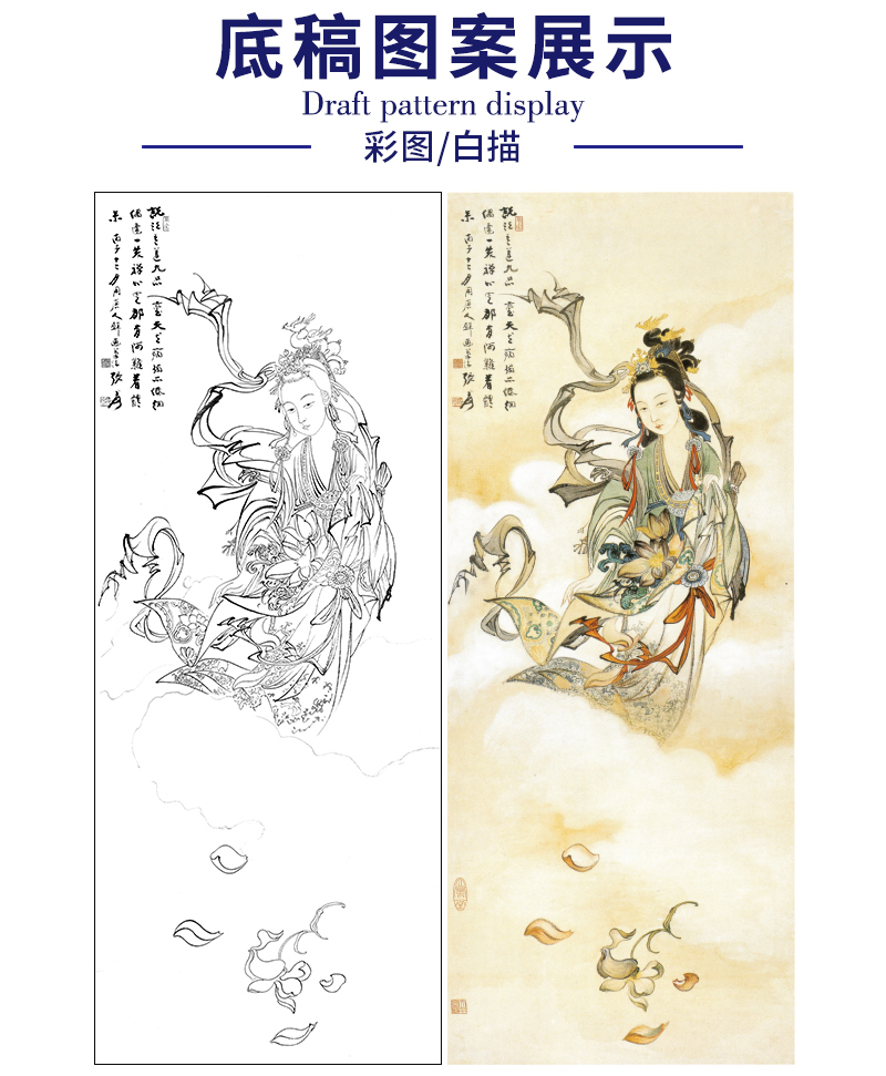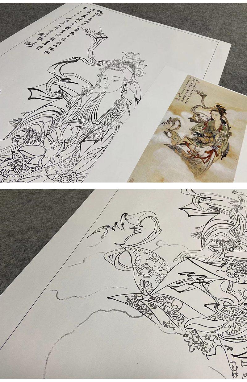 张大千竖幅工笔传统人物白描底稿-飞天仕女-《天女散花》-多种白描尺寸可选-QD52