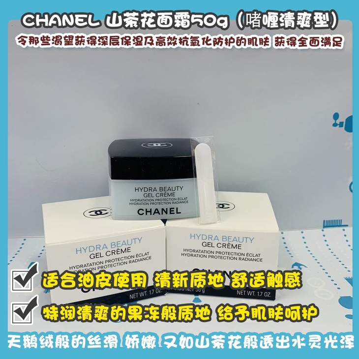 CHANEL 山茶花面霜50g(啫喱清爽型)👍山茶花保湿面霜的完美之处在于,它令那些渴望获得深层保湿及高效抗氧化防护的肌肤,获得全面满足👏。清爽型,适合油皮使用,清新质地,舒适触感,特润清爽的果冻般质地,融化于肌肤上,给予肌肤呵护💫,抵抗缓解侵害与污染。它能 帮助维持肌肤的润泽状态,由内重焕光彩✨,同时赋予肌肤清新与柔嫩,亲肤性的轻盈丝滑质地,散发淡雅的花香气息🌼。肌肤在细腻水分的舒适滋润下,呈现精致天鹅绒般的丝滑、娇嫩,又如山茶花般透出水灵光泽。🌟
