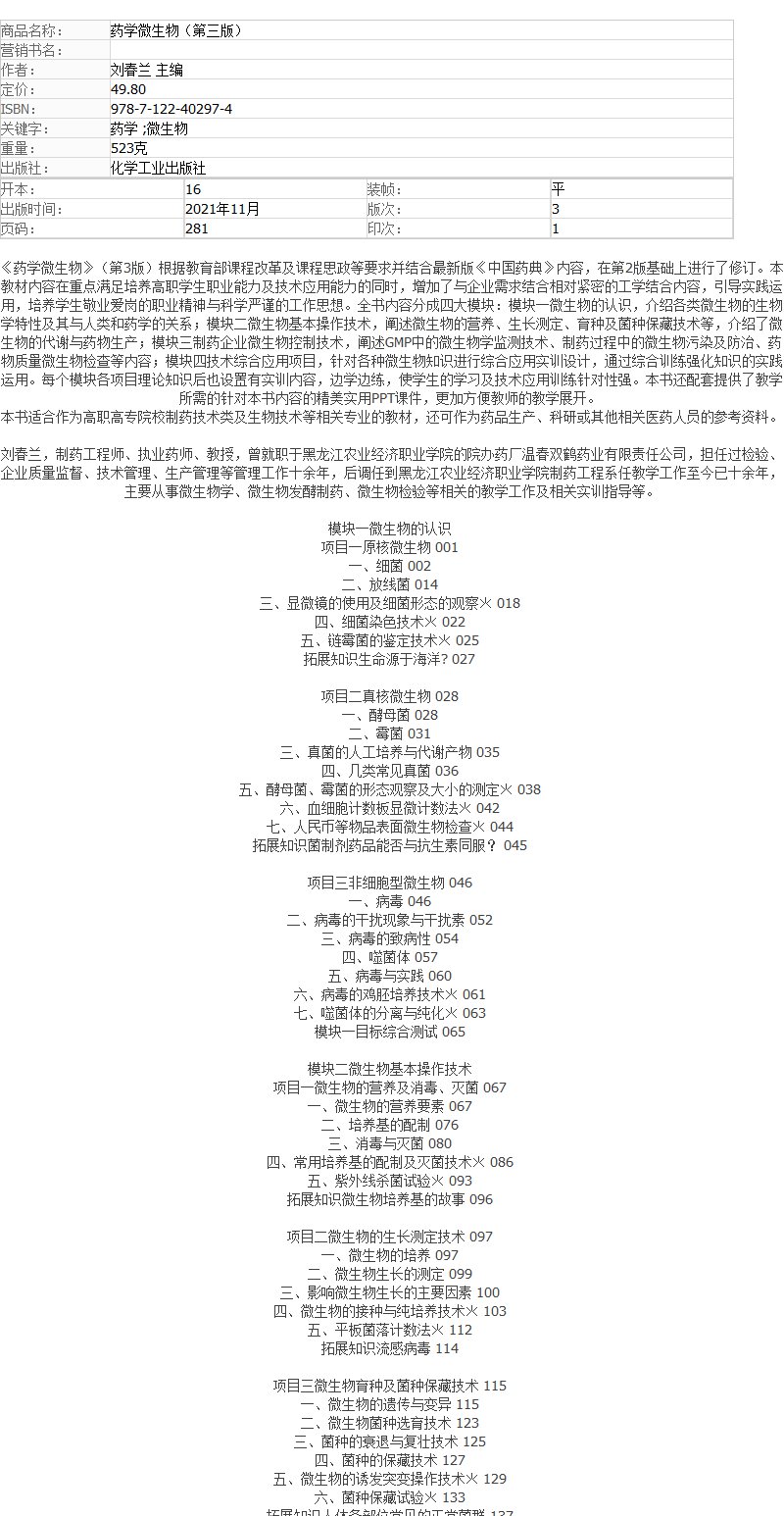 药学微生物 刘春兰 第三版 微生物基本操作技术 制药企业微生物控制技术 微生物技术综合应用项目 高职高专院校制药技术类应用教材