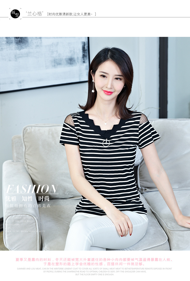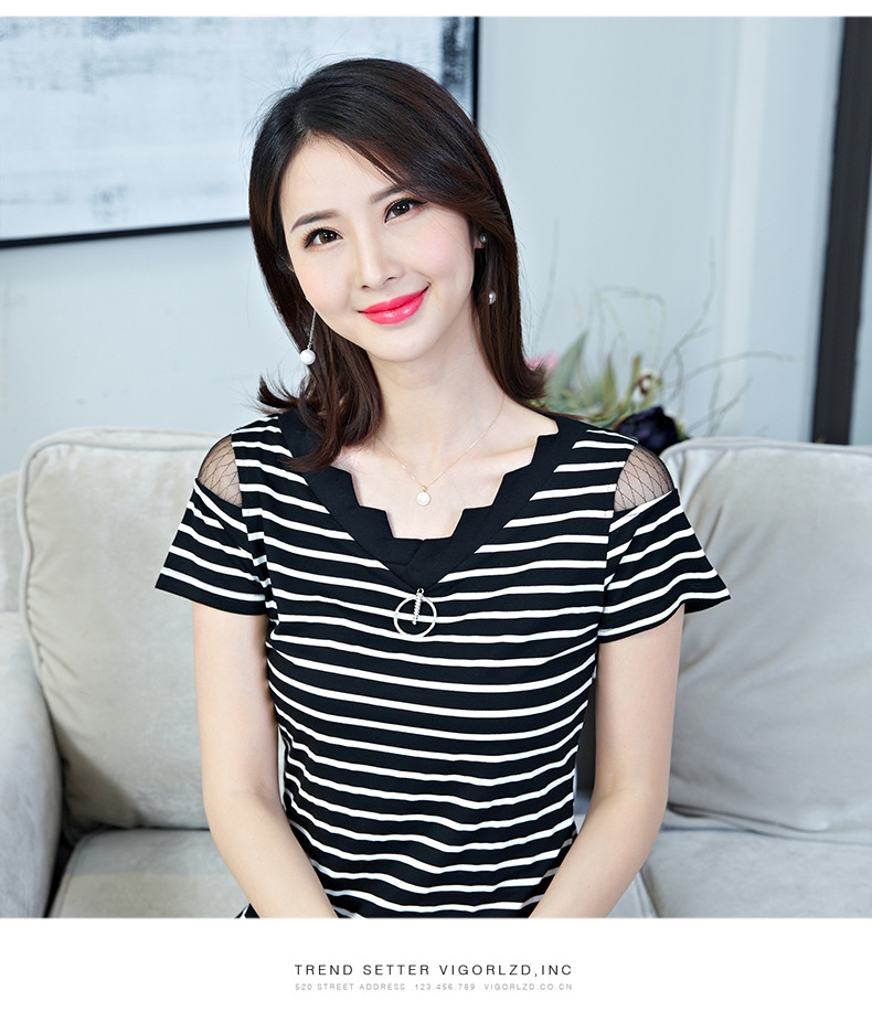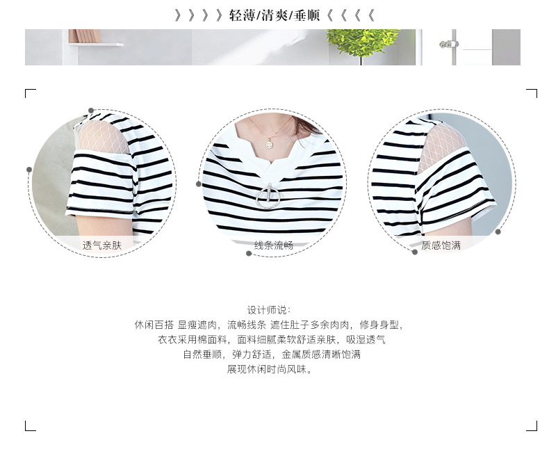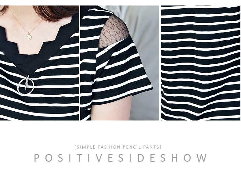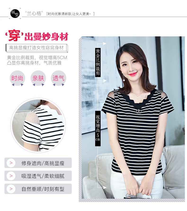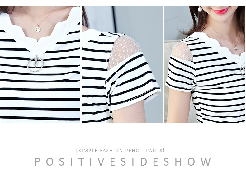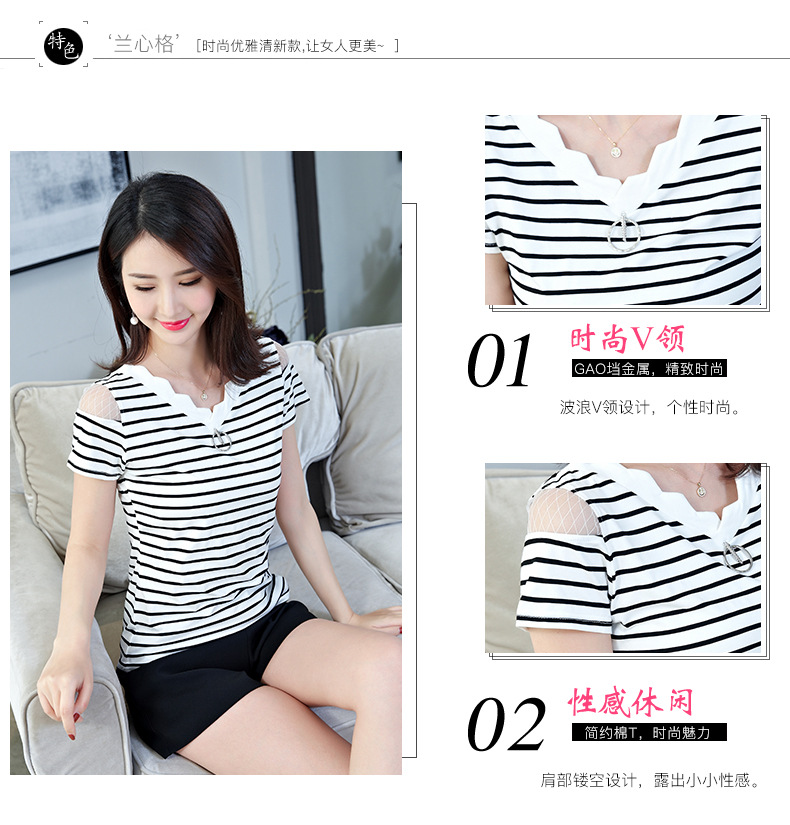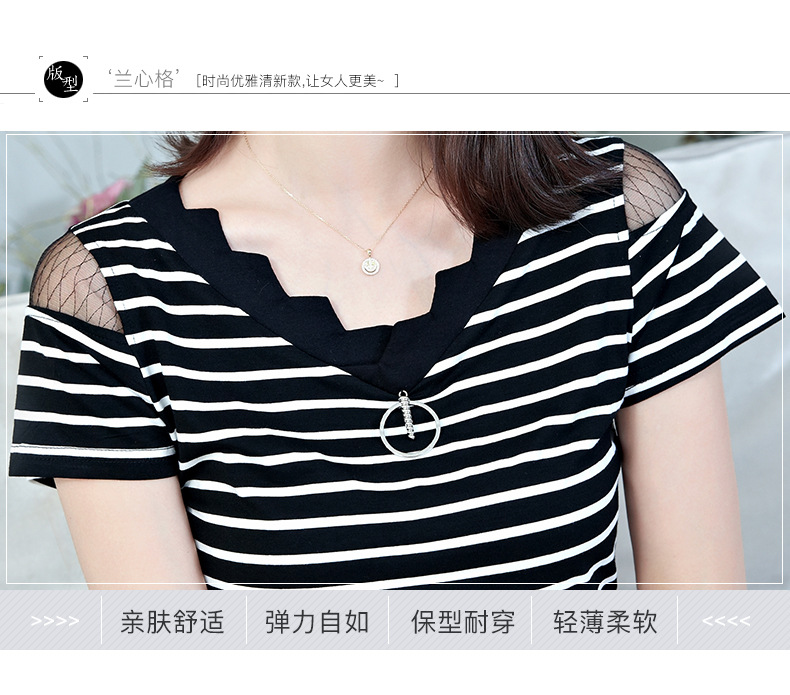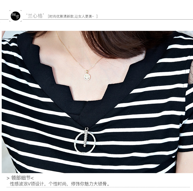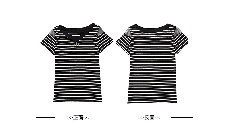 ZZ-DC6607新款条纹T恤纯棉V领网格拼接短袖上衣