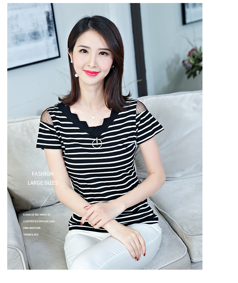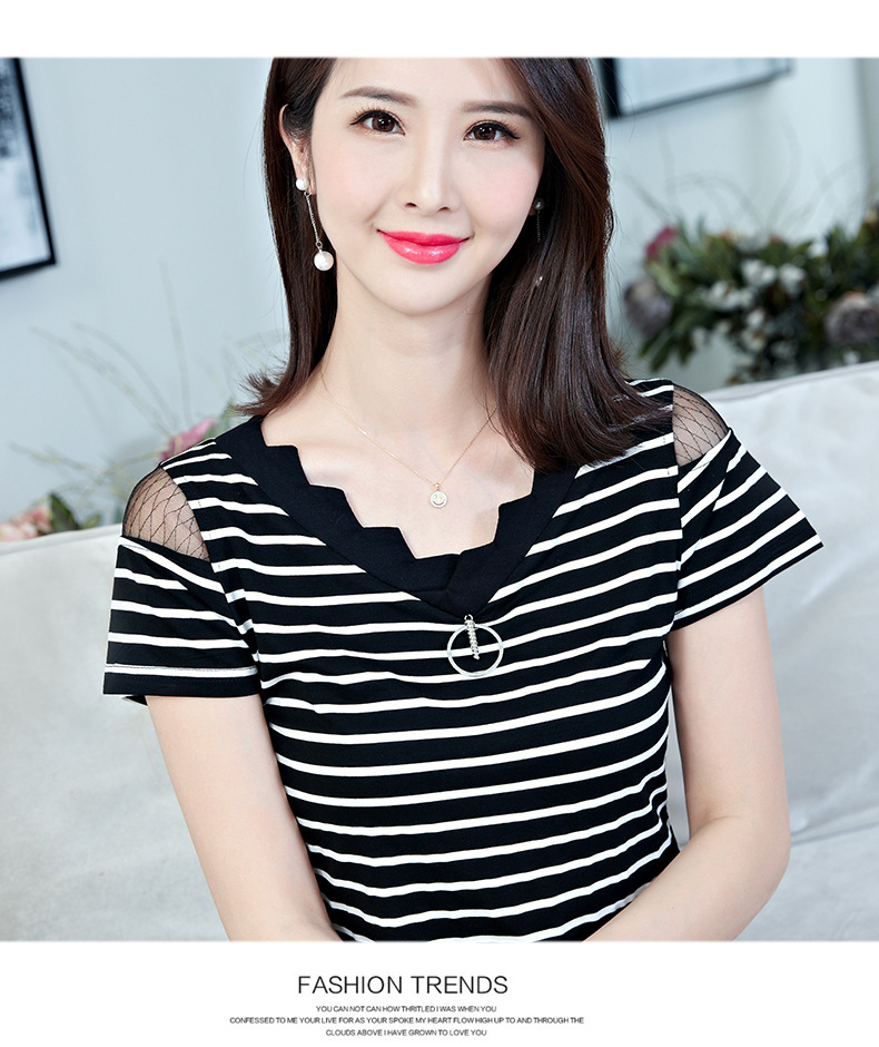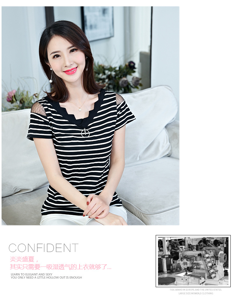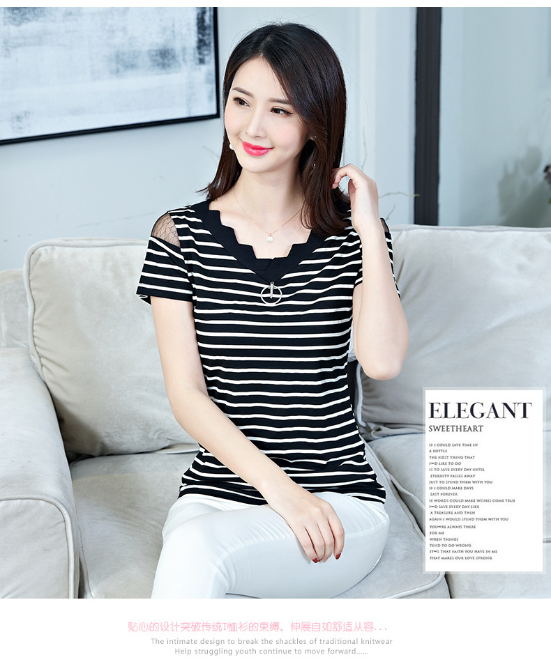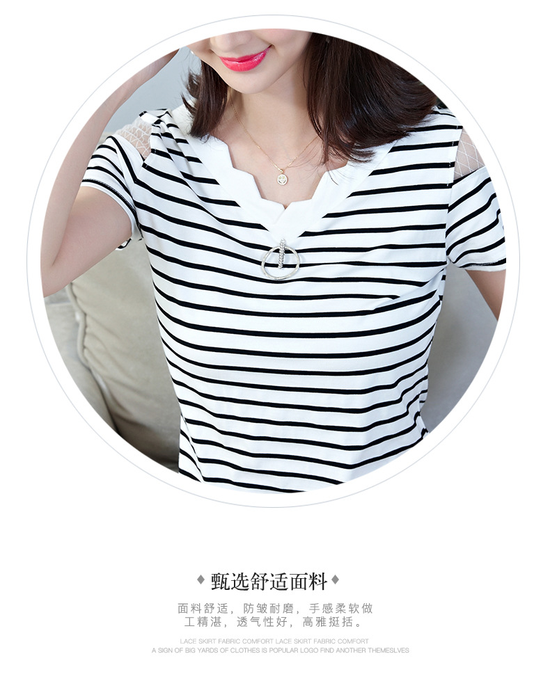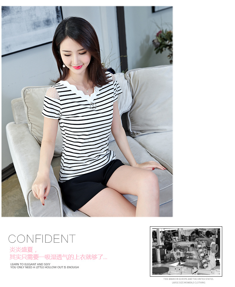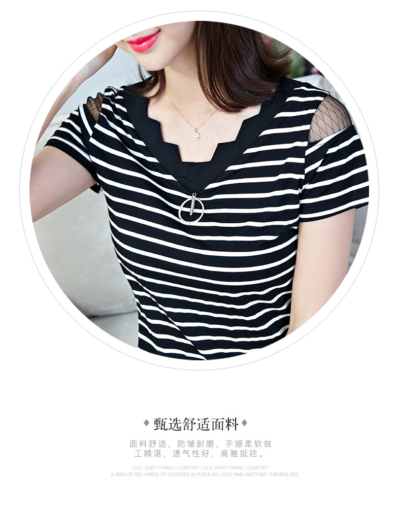 ZZ-DC6607新款条纹T恤纯棉V领网格拼接短袖上衣