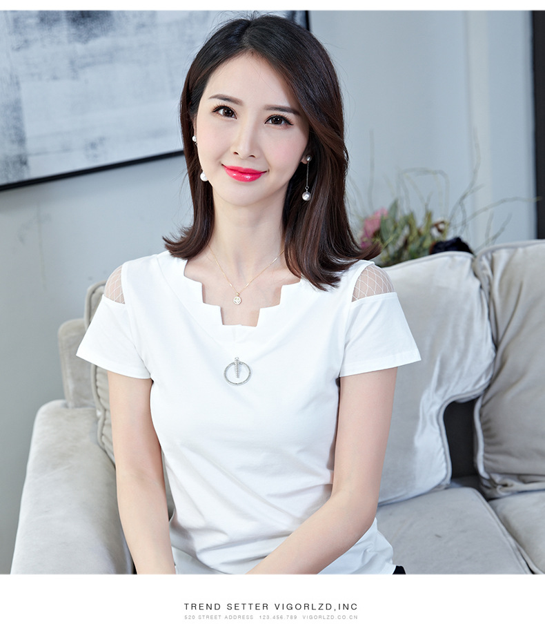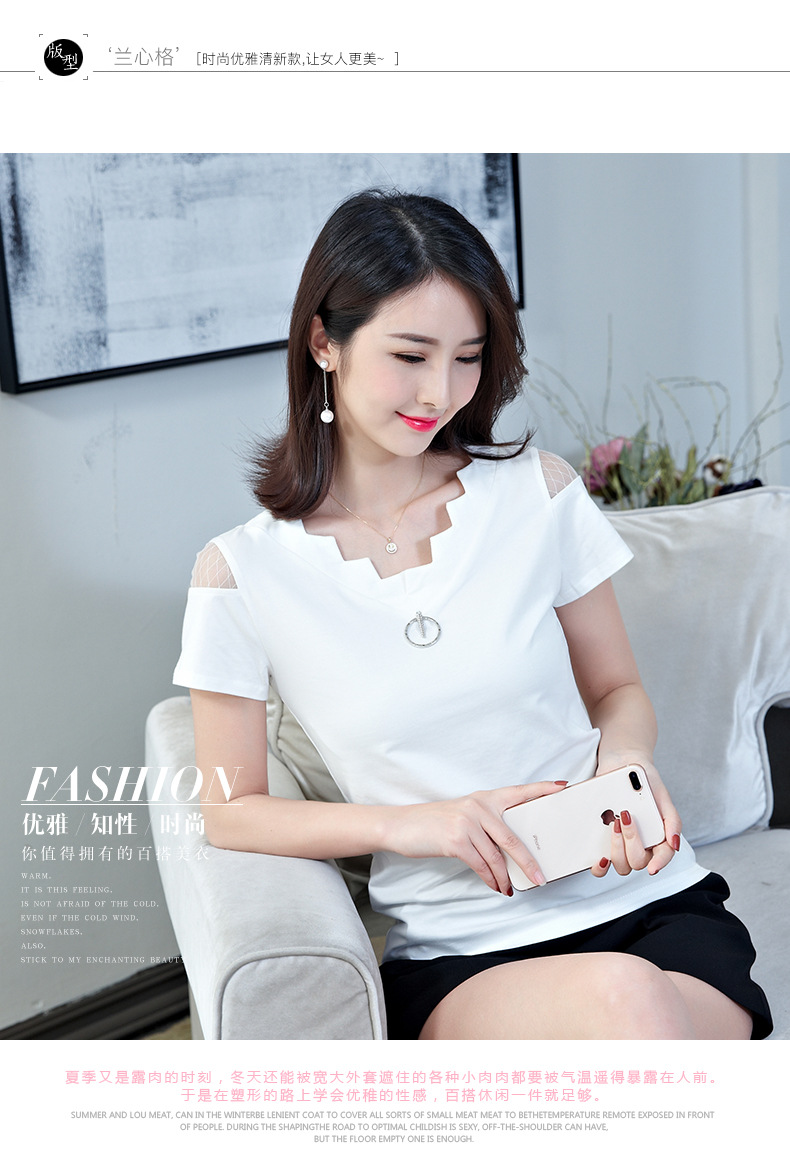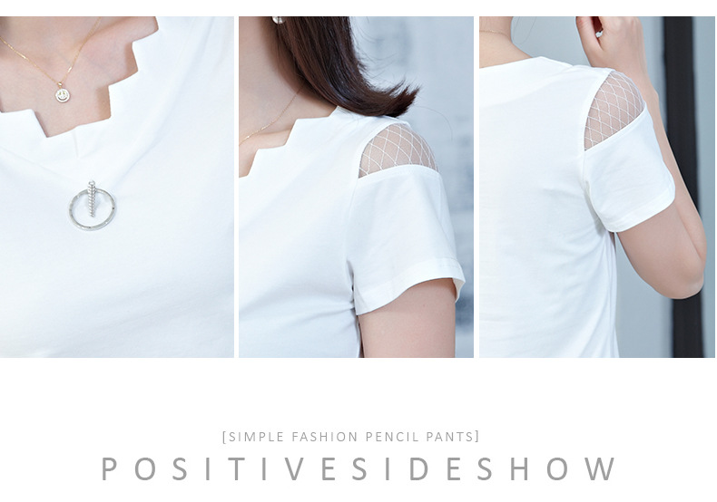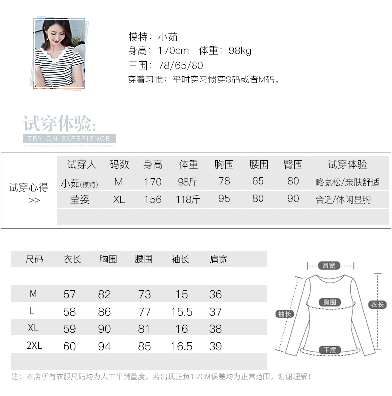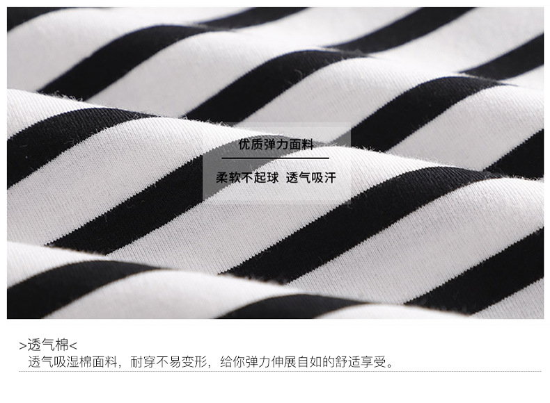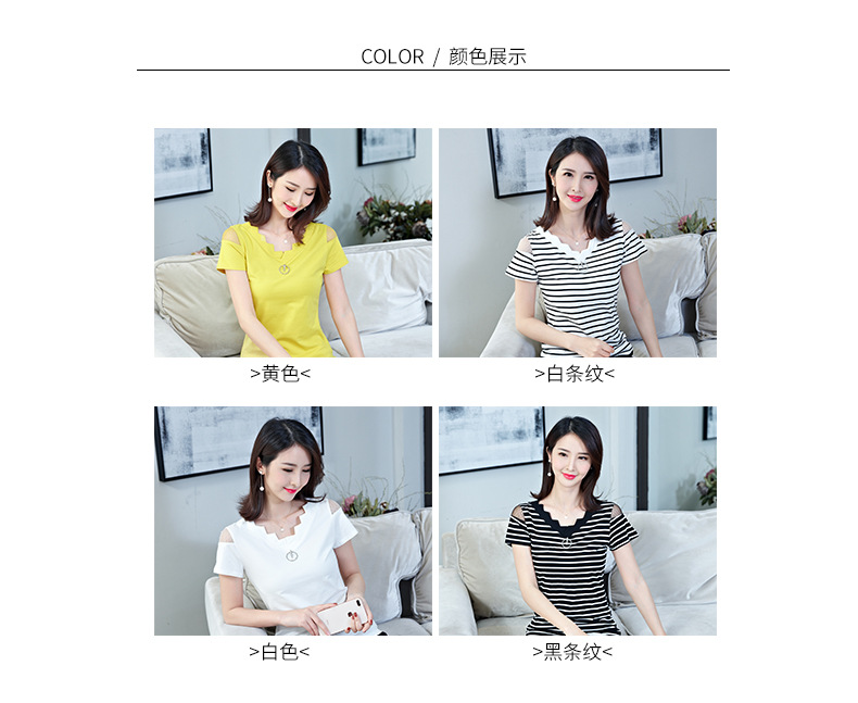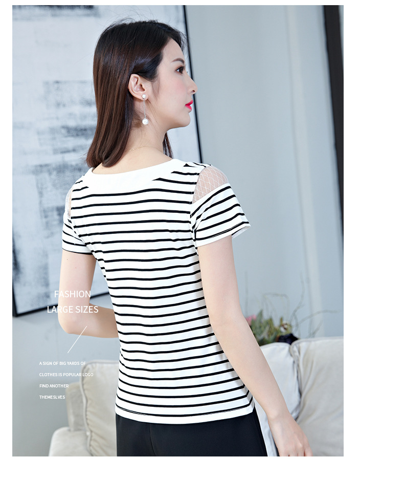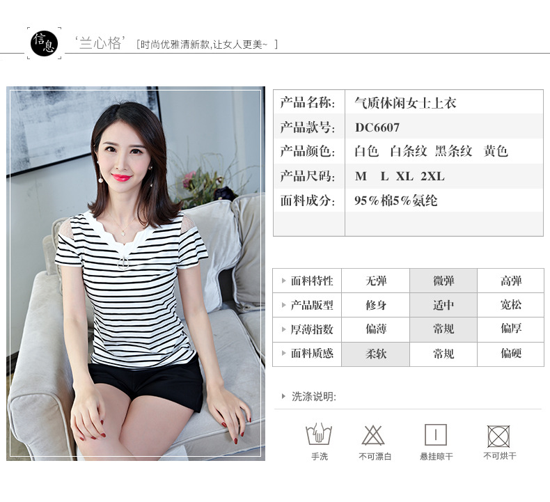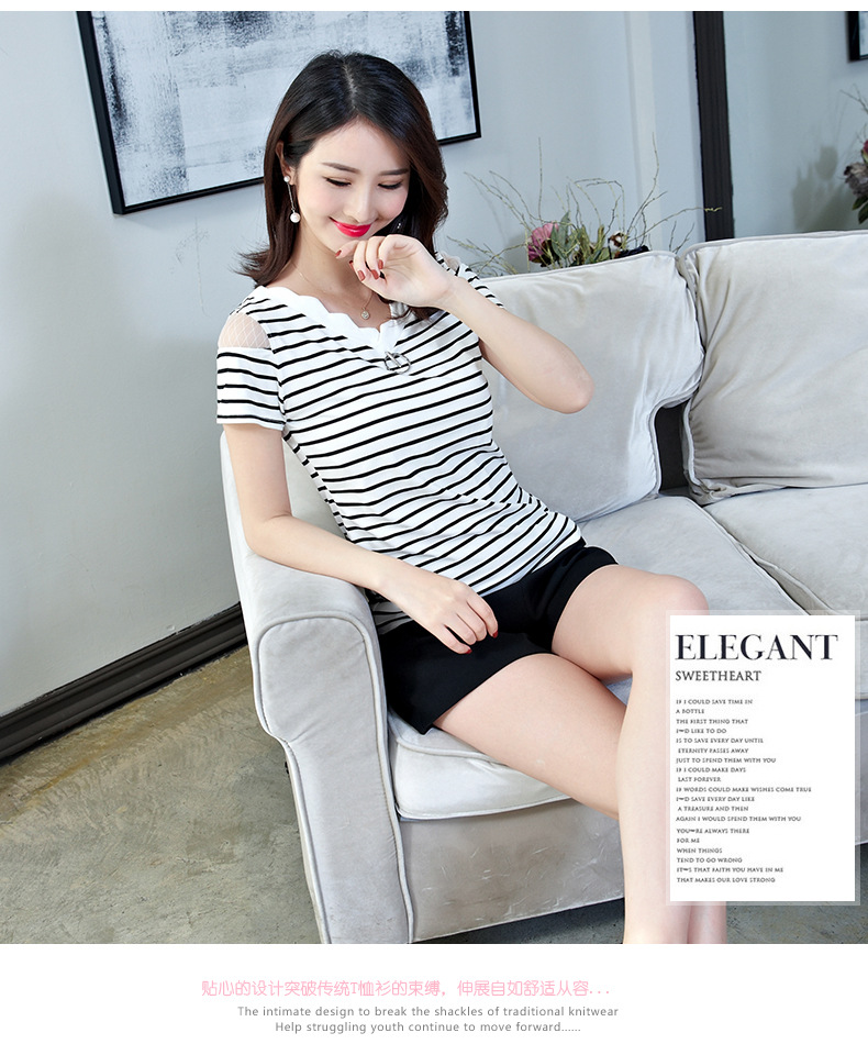 ZZ-DC6607新款条纹T恤纯棉V领网格拼接短袖上衣