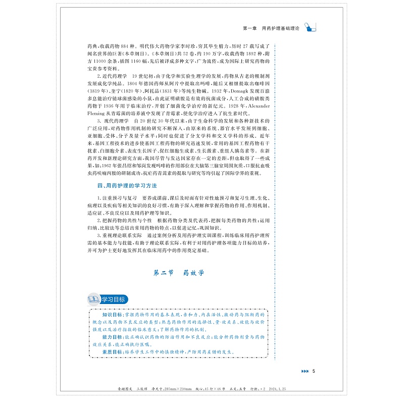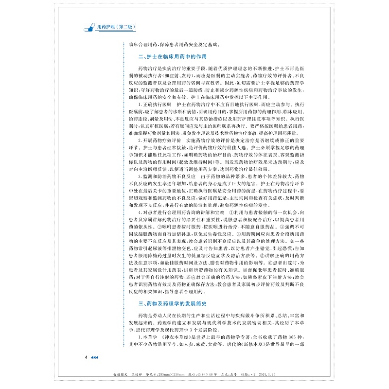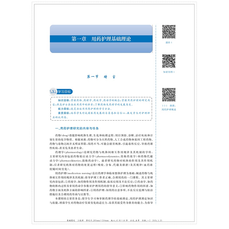 本教材共分为八篇。第一篇是总论,包括用药护理基础理论和相关知识。第二至八篇为各系统用药。每章下设置学习目标、案例、正文、用药护理小结、常用制剂与用法。正文重点介绍各种代表药物的基本作用、主要临床应用、不良反应及其用药护理。教材充分利用融媒体技术,配备知识导图、课件、微课、知识拓展、练习题、护考模拟和思政学堂等数字资源。其中护考模拟、思政学堂是本教材的特色。教材附录是用药护理实训教程,以进一步深化理论教学,着重培养和训练学生正确用药、监测与处理药物不良反应、进行用药宣教等能力。根据技能掌握过程,实训项目划分为基本技能训练、核心技能训练和综合能力训练三大模块,每一模块下编排3~8个实训项目,具体教学中可选择适合的实训场所实施教学。
