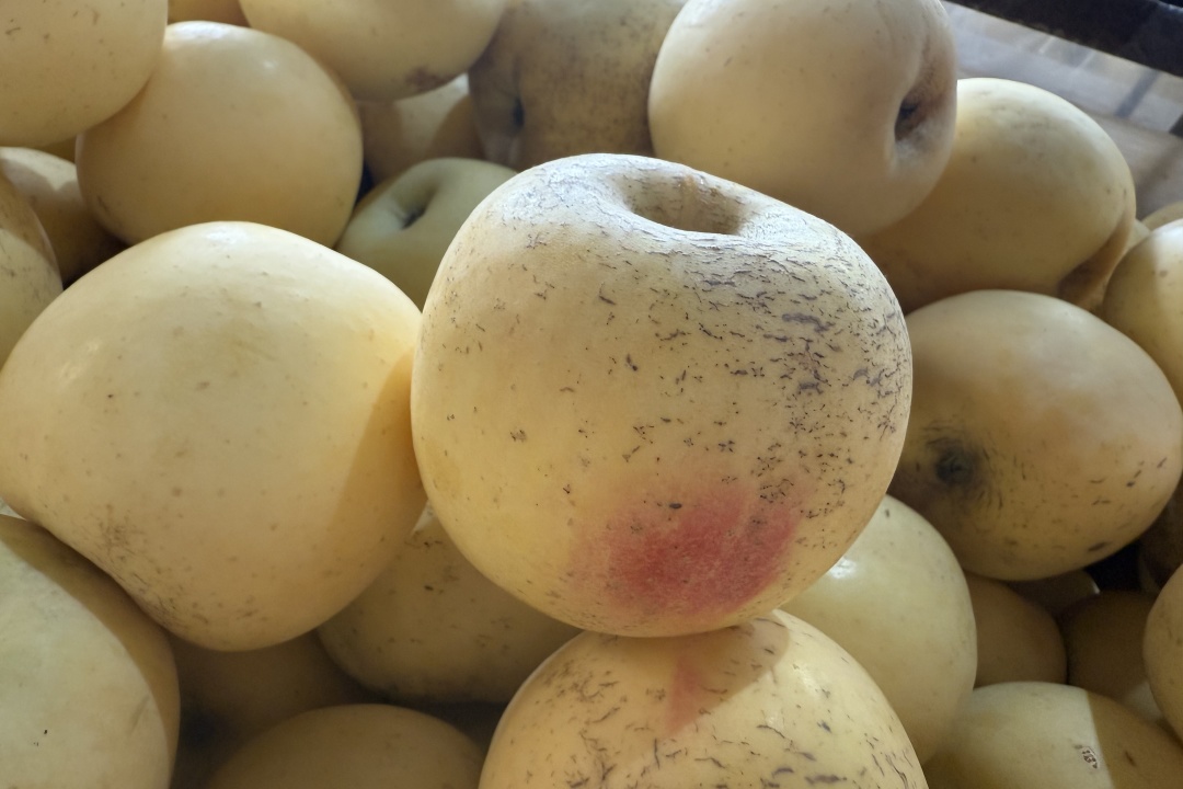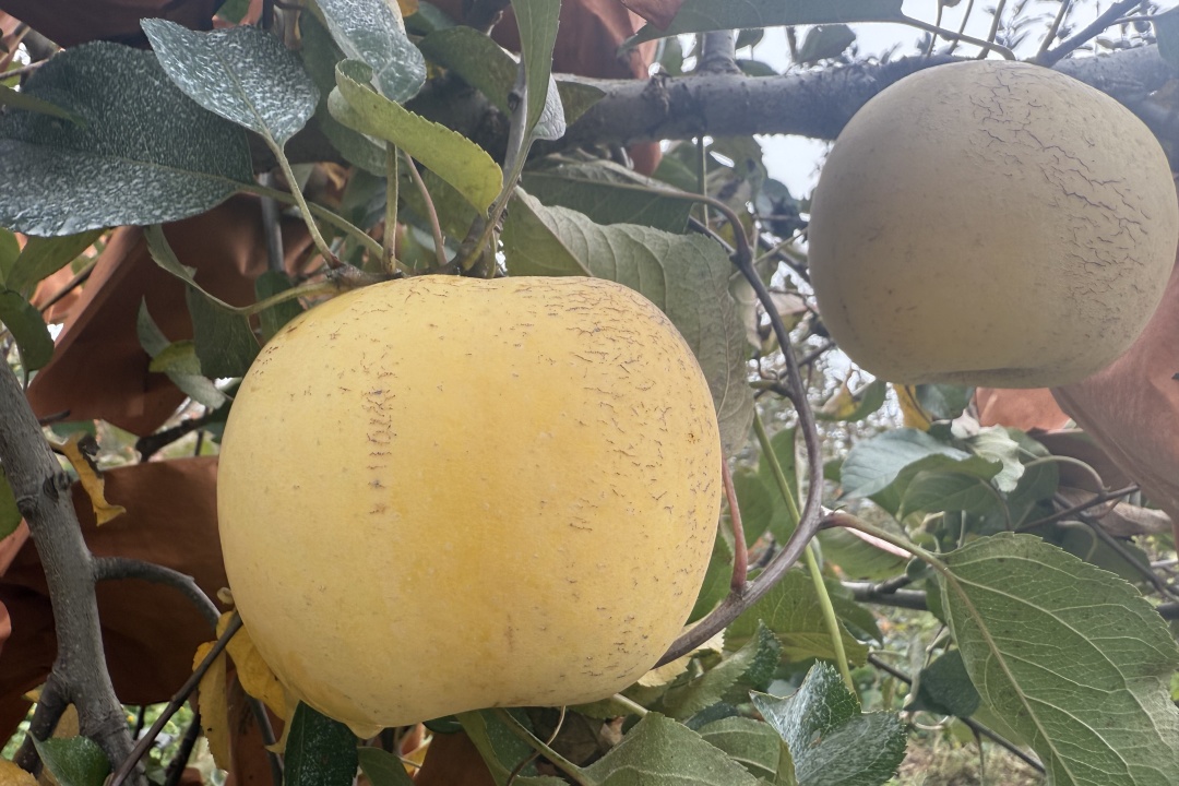 今年在苹果成熟期连续下了40多天雨,这次因为雨水就没有进行去袋,所以苹果也不着色了,因此今年的红富士不是红色的,而是黄的,但好在口感很不错,价格也降低了,还比较实惠。