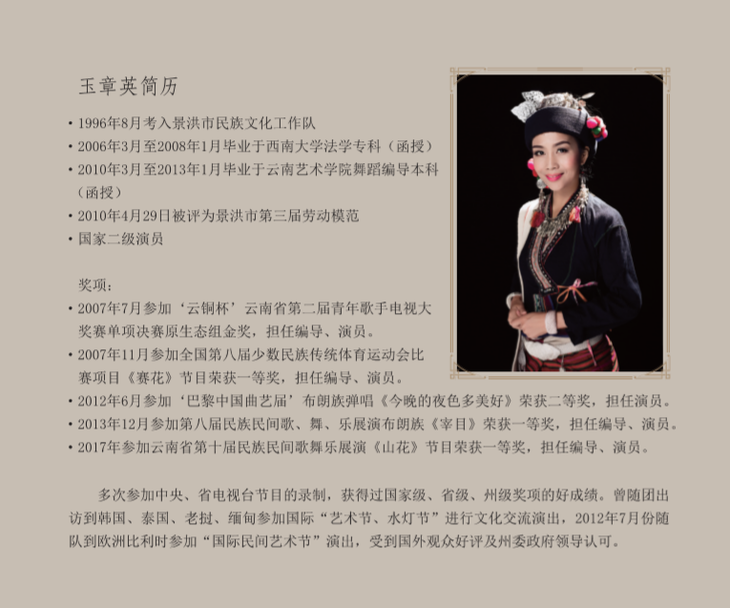 十多年前,通过优秀的哈尼族歌手米线认识了神奇美丽的西双版纳和那里多姿多彩、风格各异的多民族音乐,同时也结识了很多当地优秀的音乐人朋友,在这其中,美丽端庄、能歌善舞,很有大家风范的布朗族歌手玉章英是一个很具代表性的人物。