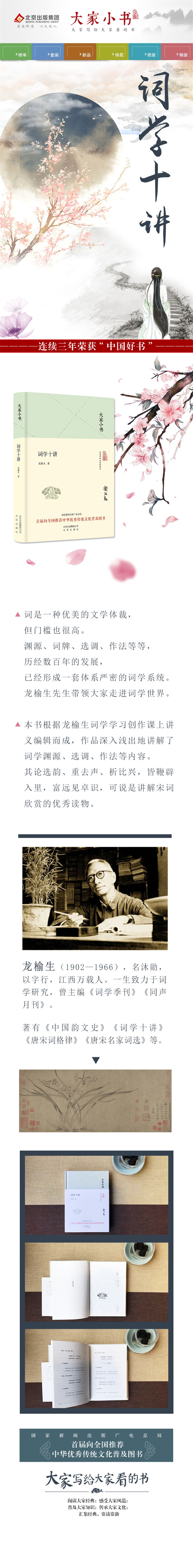 本书根据龙榆生词学学习创作课上讲义编辑而成,作品深入浅出地讲解了词学渊源、选调、作法等内容。其论选韵、重去声、析比兴,皆鞭辟入里,富远见卓识,可说是讲解宋词欣赏的优秀读物。