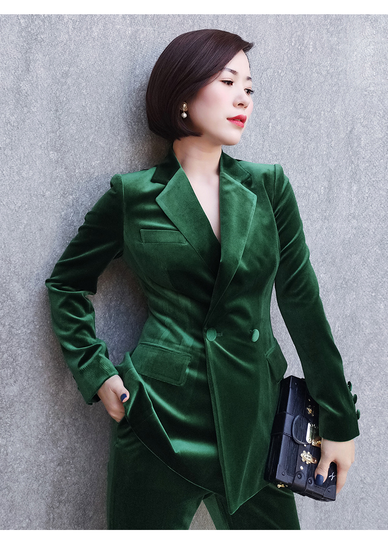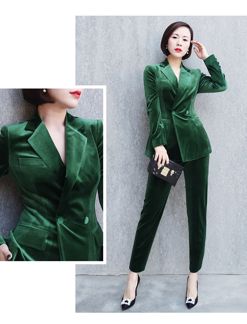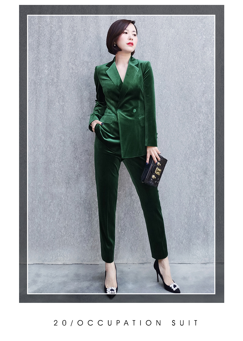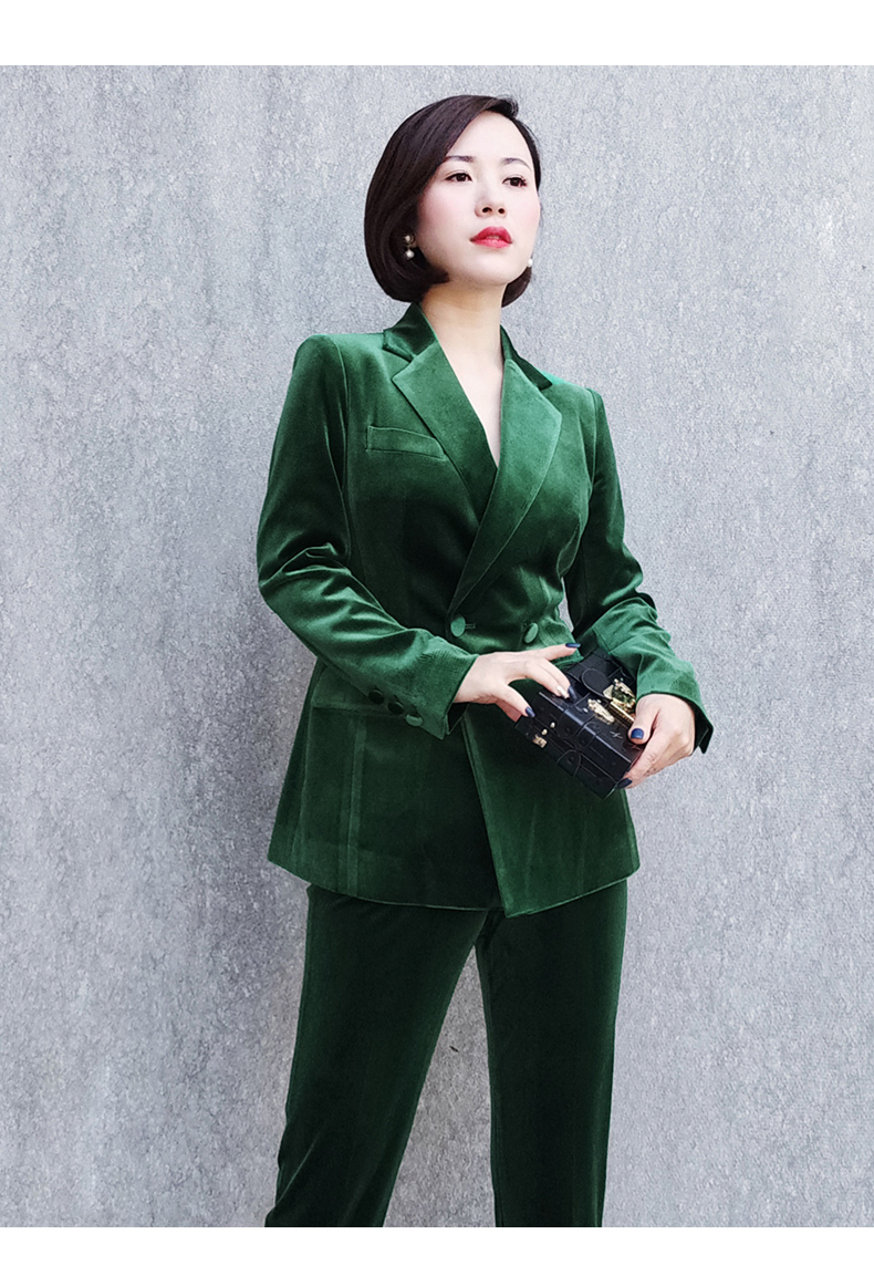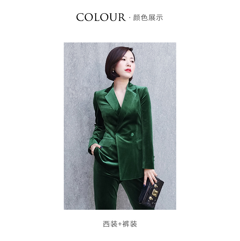 IWY/高端墨绿色丝绒西装套装女气质时尚双排扣职业装工作服OL 194109C1+P1