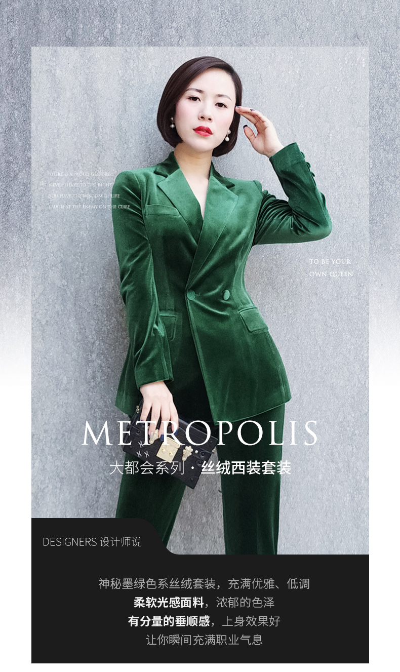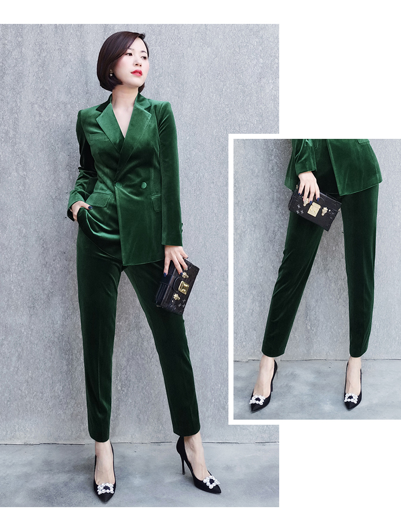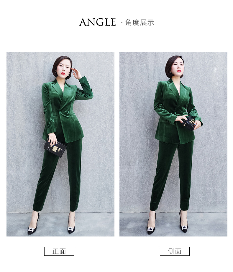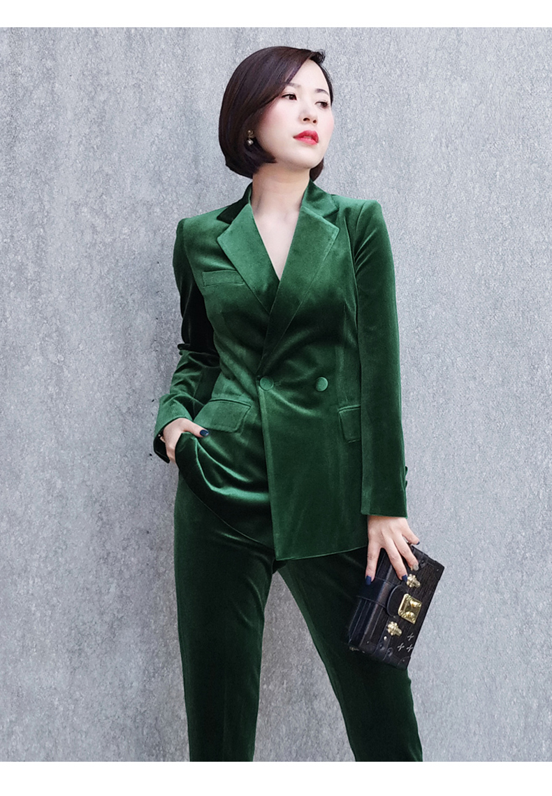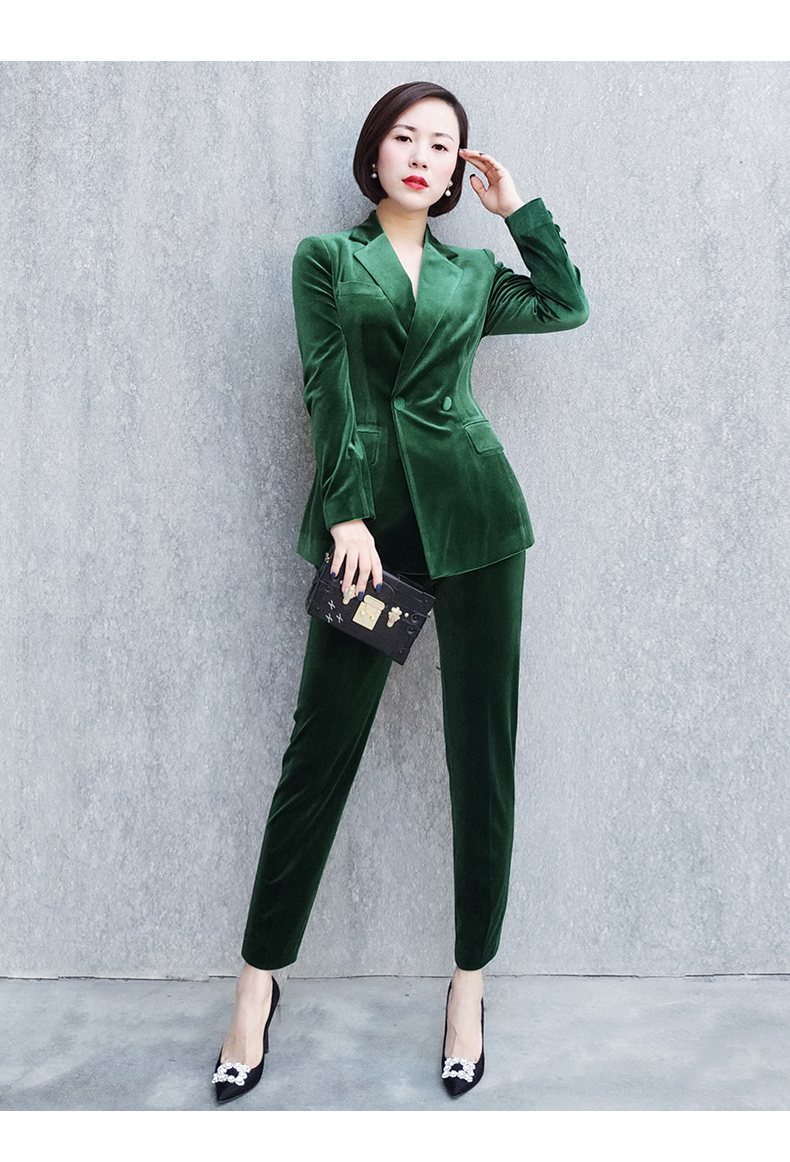 IWY/高端墨绿色丝绒西装套装女气质时尚双排扣职业装工作服OL 194109C1+P1