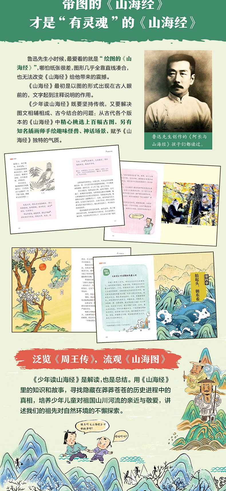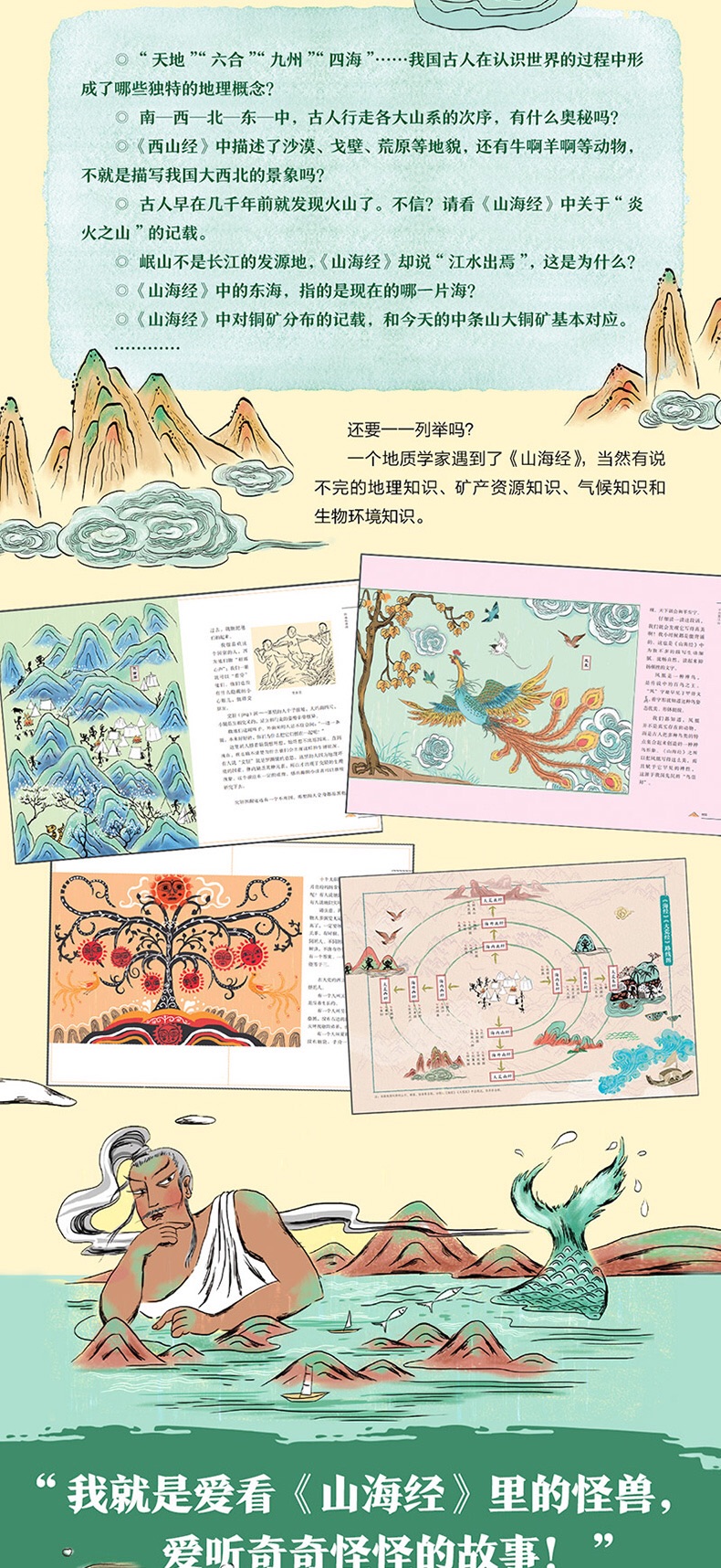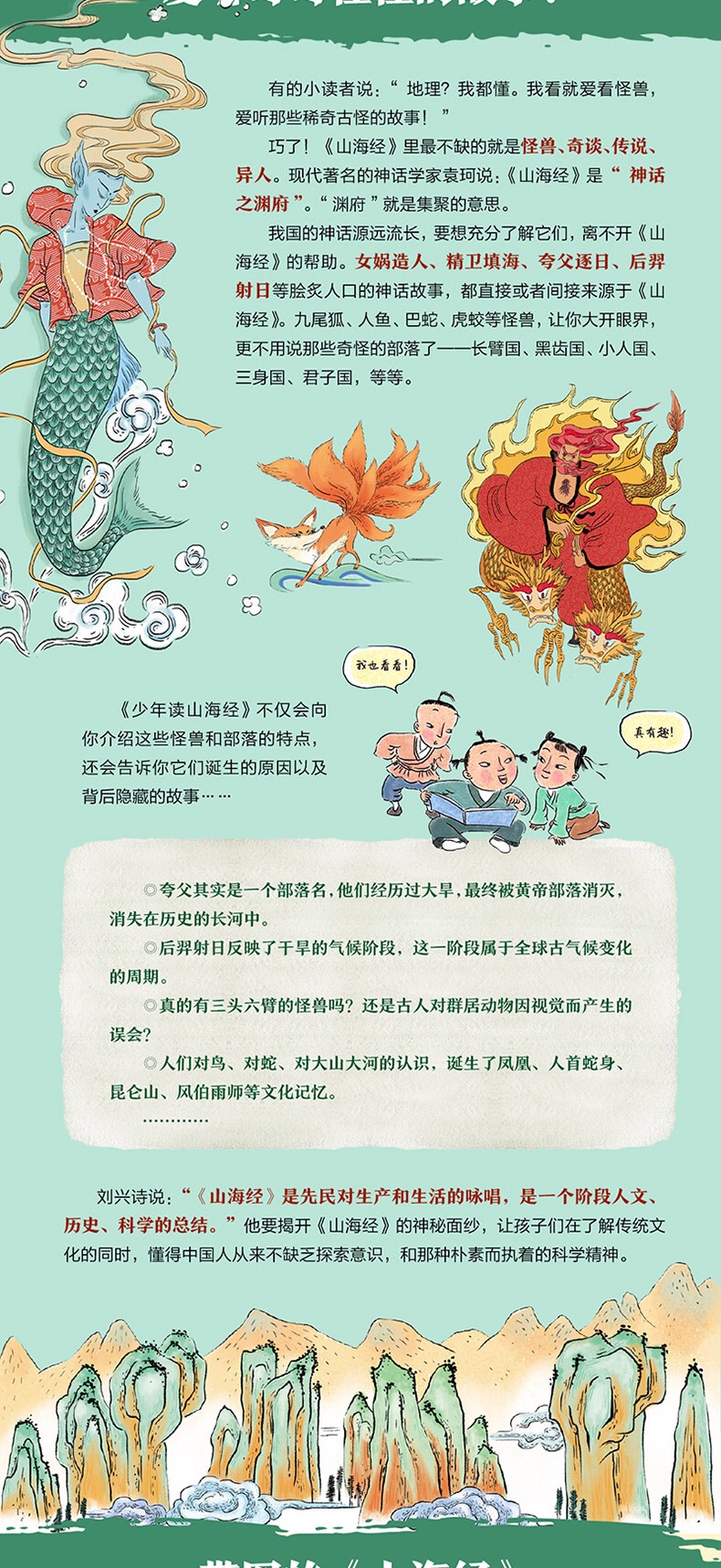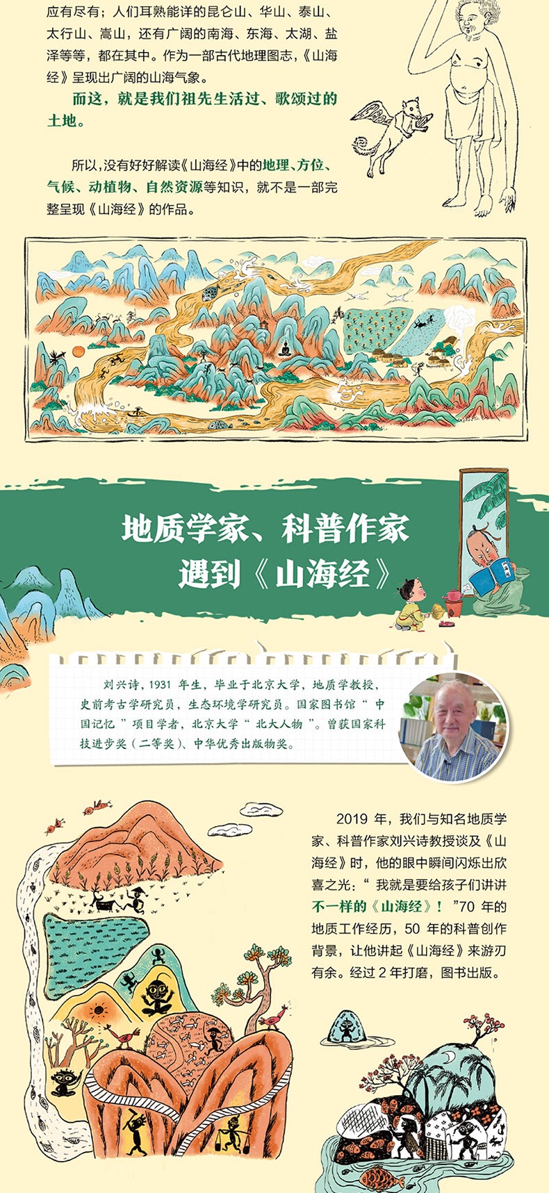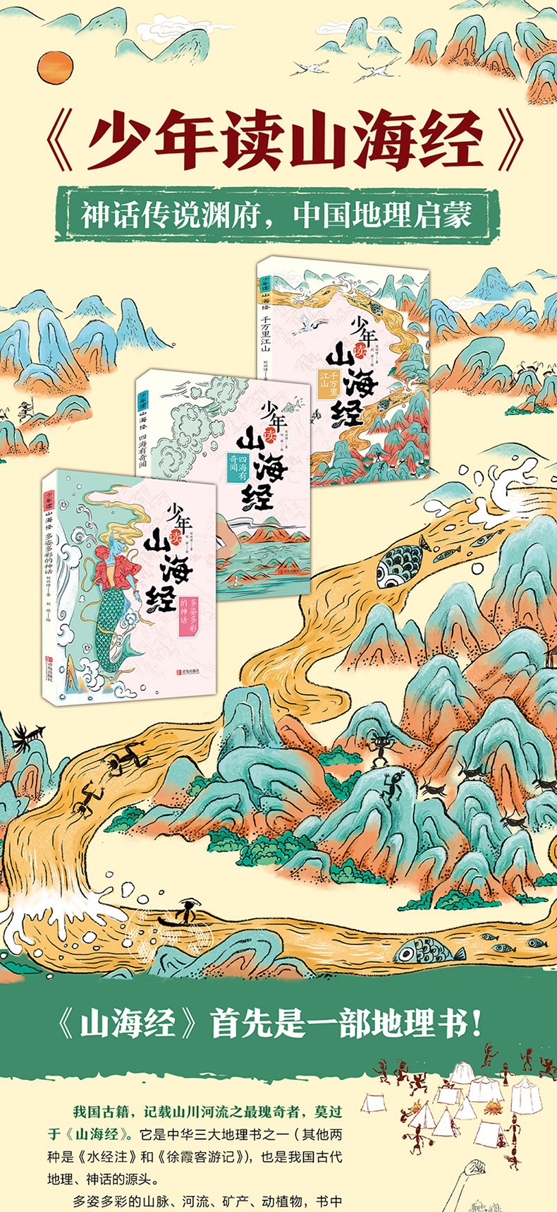 《少年读山海经》是著名地质学家、科普学家刘兴诗趣味解读《山海经》的系列作品,共3册,分别是《千万里江山》《四海有奇闻》《多姿多彩的神话》。全书讲述的是《山海经》中记载的天文、地理、动植物、矿产资源等知识,包含“读山观海”“我的读书笔记”等板块,通过古今对比的方式,向少年儿童讲述古人对自然环境的认识和我国古代典籍中蕴含的科学探索精神,是一部综合性“人文+地理”启蒙读物。