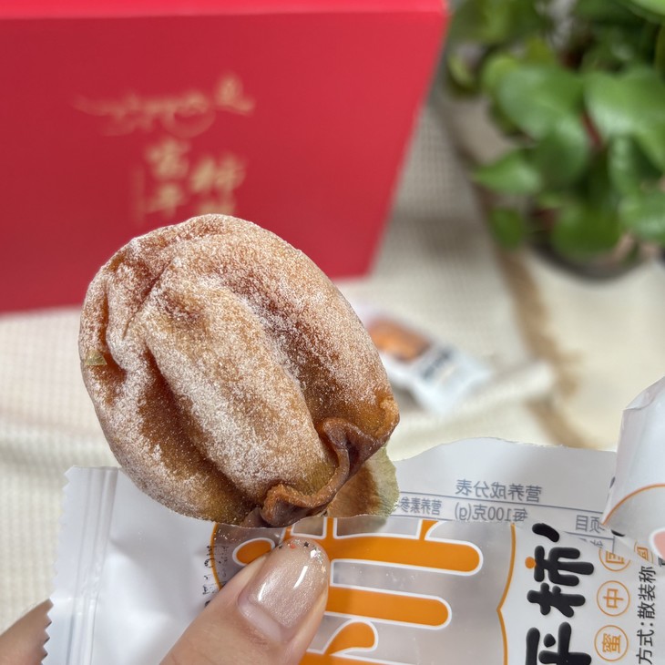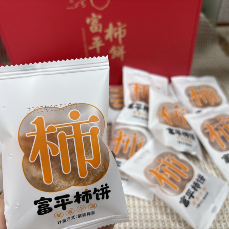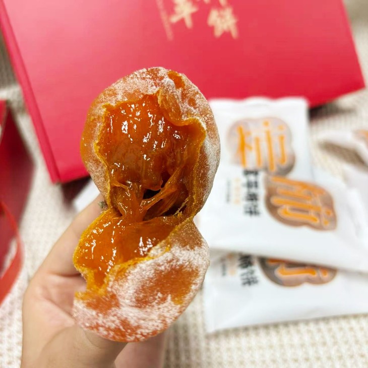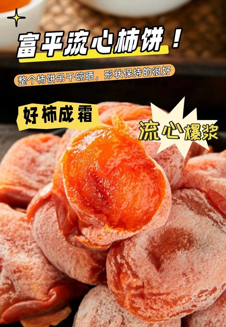 强烈推荐宝子们去尝富平柿饼,吃起来糯糯叽叽甜甜的不涩嘴,口感绝了😋👍 捏在手里软乎Q弹,撕开就有蜜糖流心,入口水润清甜💥 ☺一口流心,满柿溏心品莹剔透般鲜亮果冻质感