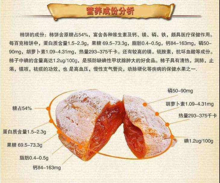 温馨提示: 1、请勿空腹食用,勿与海鲜、酒类、鸡蛋、牛奶、醋、海带一起食用 2、收到货后,请第一时间冷冻保存, 在运输过程中受温度影响可能会稍微化冻,并非质量问题,也不影响食用 3、糖尿病、贫血严重患者不建议食用 4、柿子去皮后在烘箱,烘干后果体表面可能会出现极小的黑点属正常现象 5、柿饼放冰箱时间长了出现白霜,是自然糖化现象是“柿霜“可正常食用