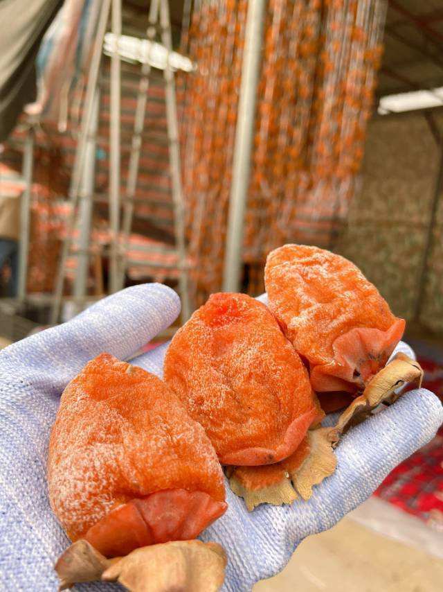 脱水后的柿子表皮逐渐凝固,柿农会挨个给柿子进行3次捏形,力道把握精准,轻了重了都不行,柿子就在这一捏又一捏间,慢慢软化下来。