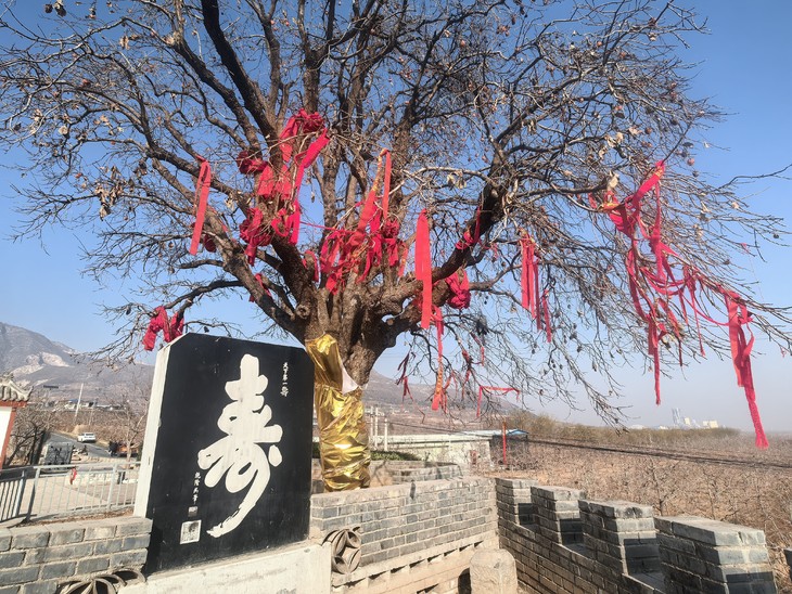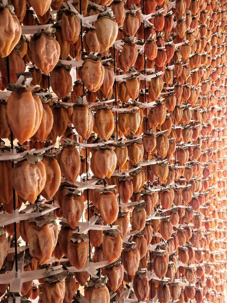 一个个柿饼挂在架子上,360度接受山风和阳光的洗礼。 一眼望过去,就像一道道橘黄色的珠帘,带着吉祥的寓意慢慢褪去自身的水分,并等待柿农的下一步动作。