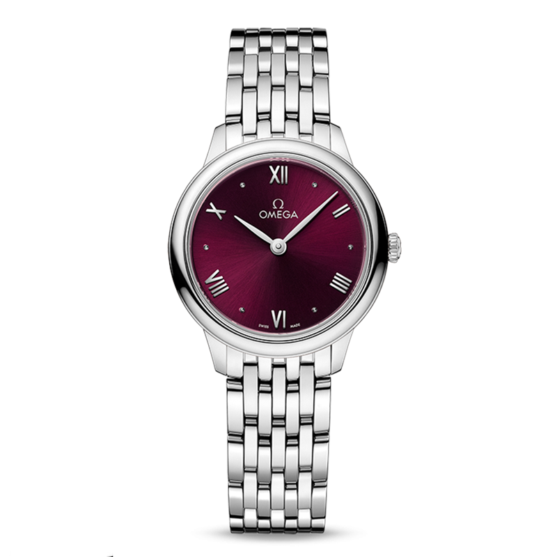 镜面材质 | 蓝宝石水晶玻璃 | 表盘 | 精钢表壳 表盘经过勃艮第红色PVD处理,呈现出太阳射线的打磨效果。尤为引人瞩目的是,腕表搭配镀铑指针,罗马数字刻度和弧面形小时刻度交替出现。 表背呈现出浮雕时间之神Chronos图案 |