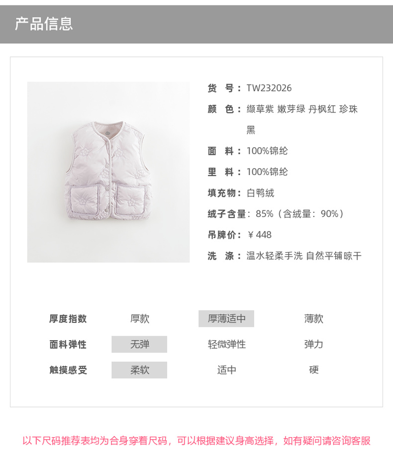 【马克珍妮 芦芙】秋冬新款 女童甜美花朵绗缝轻薄羽绒背心232026