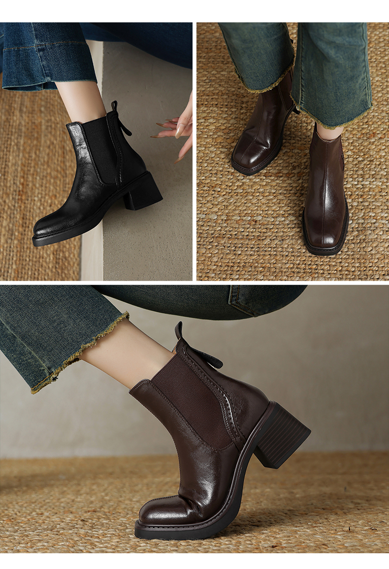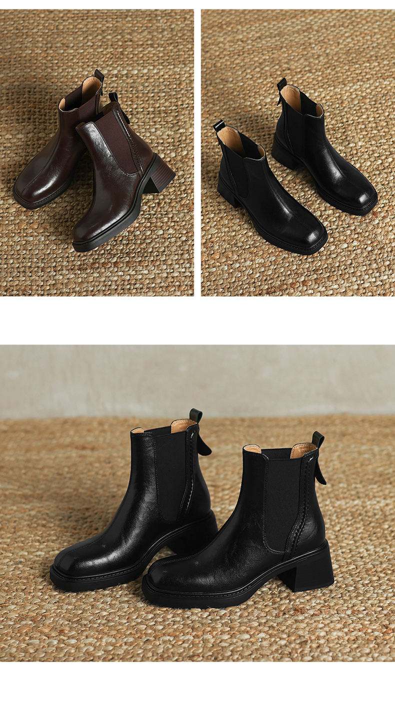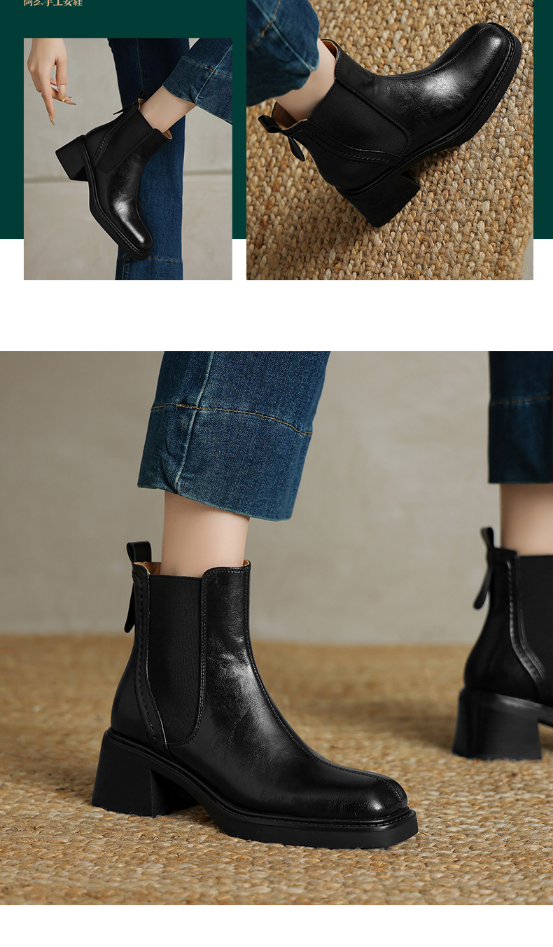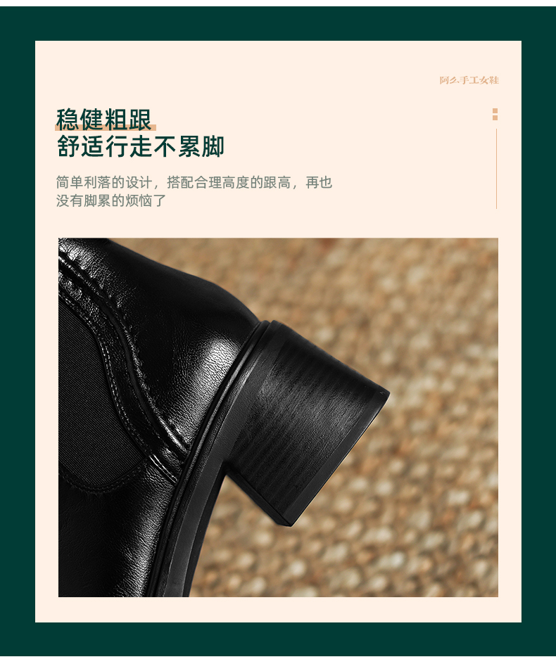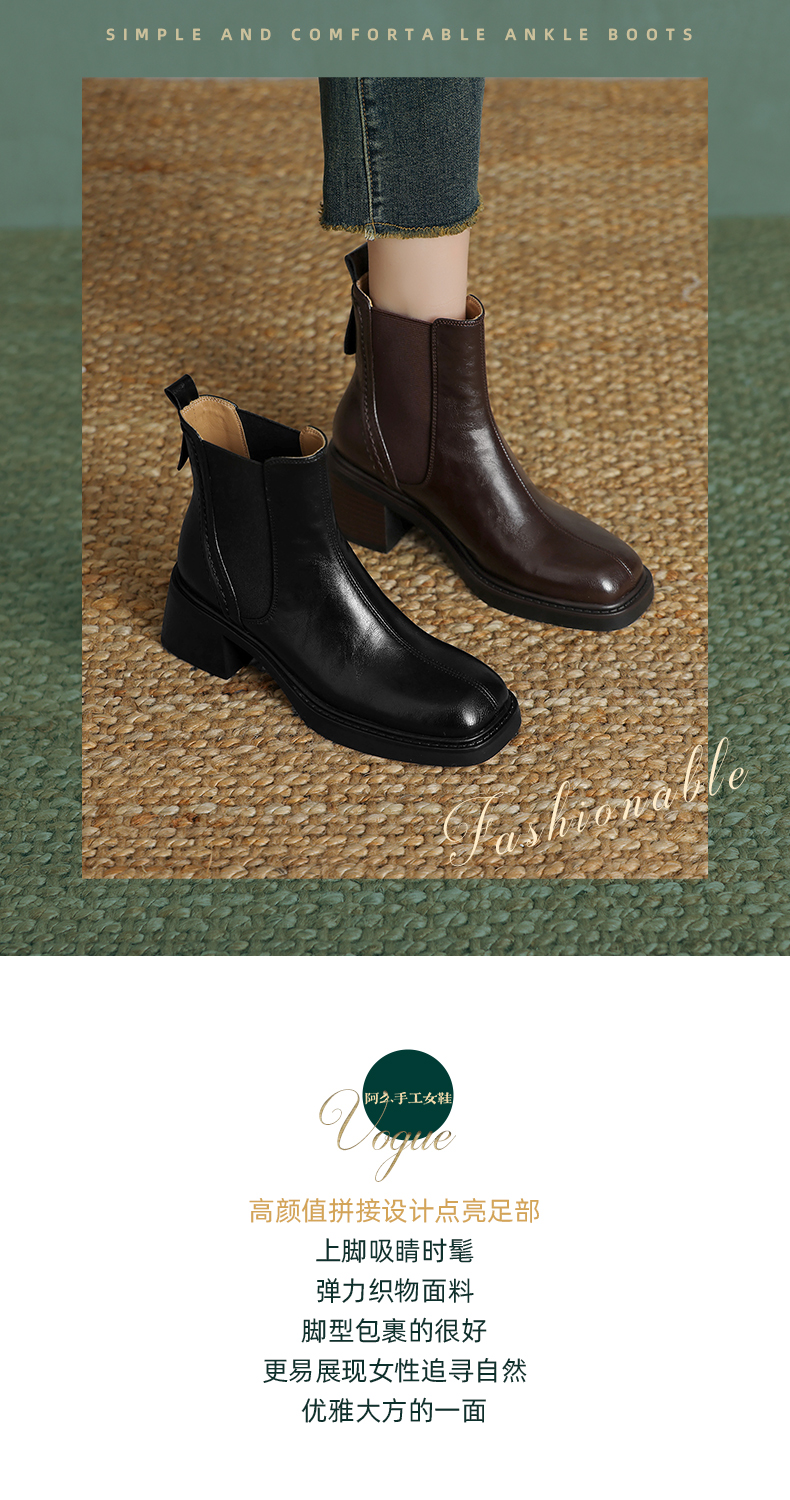 阿么手工女鞋真皮方头舒适切尔西靴2025新款短筒气质高跟单靴6CM