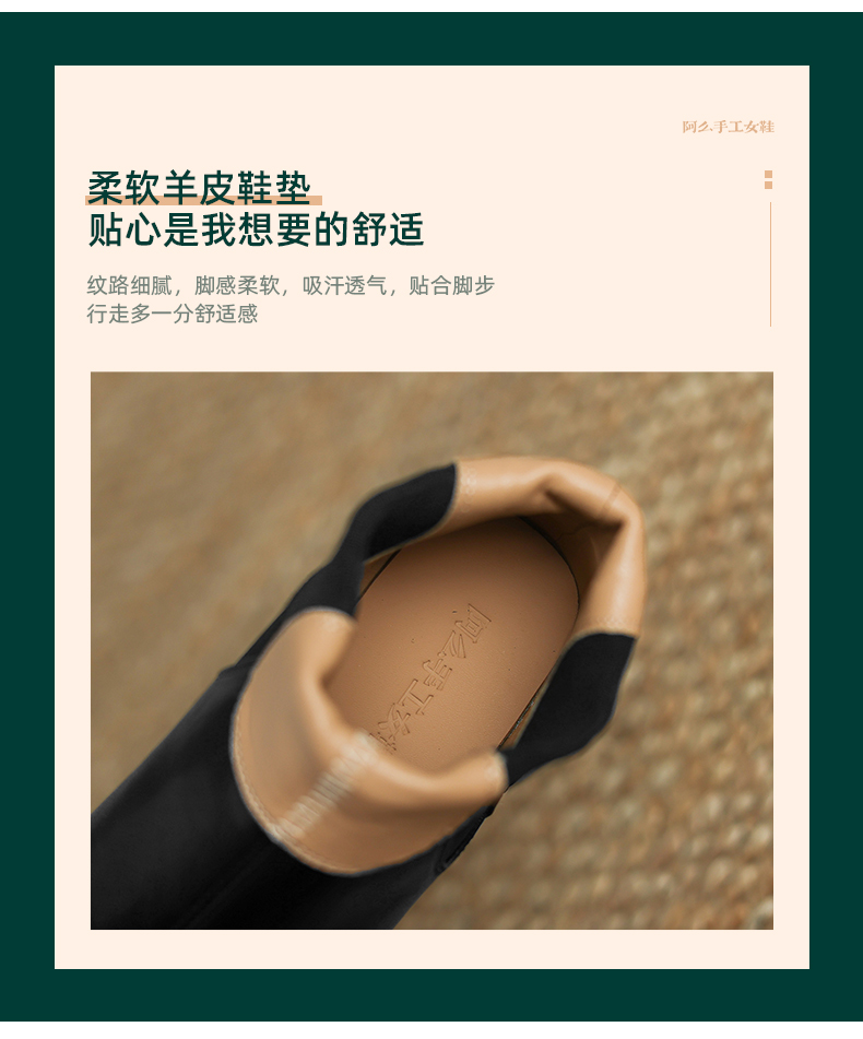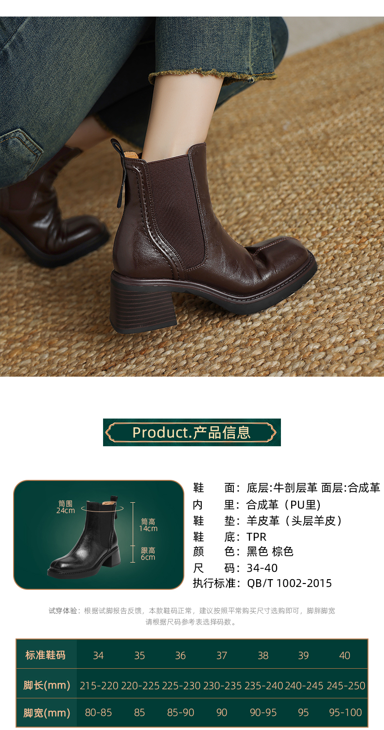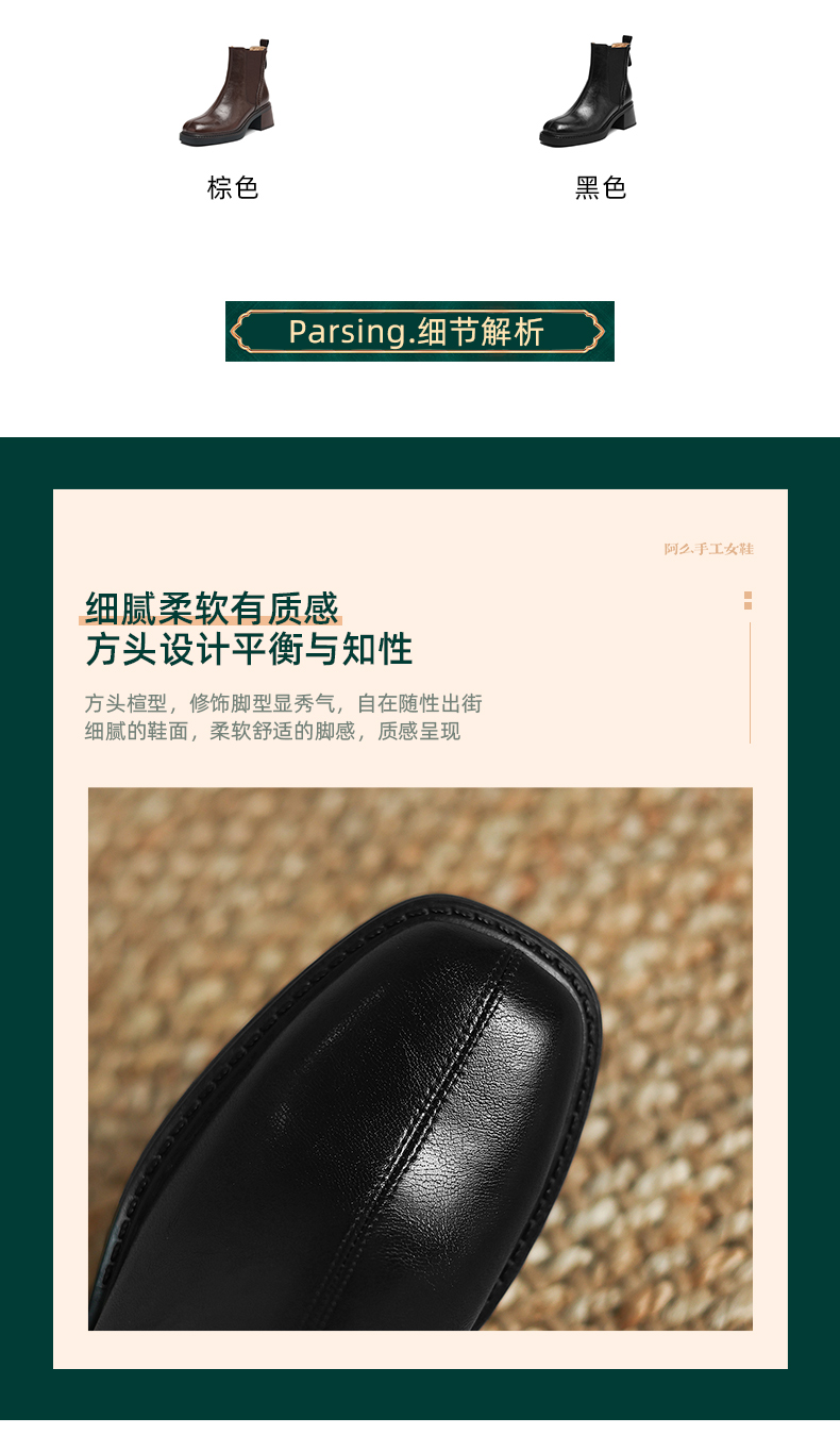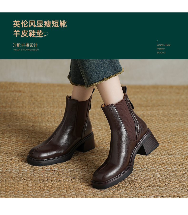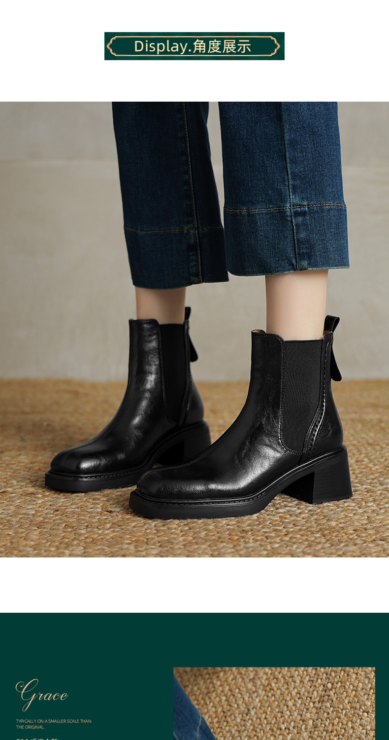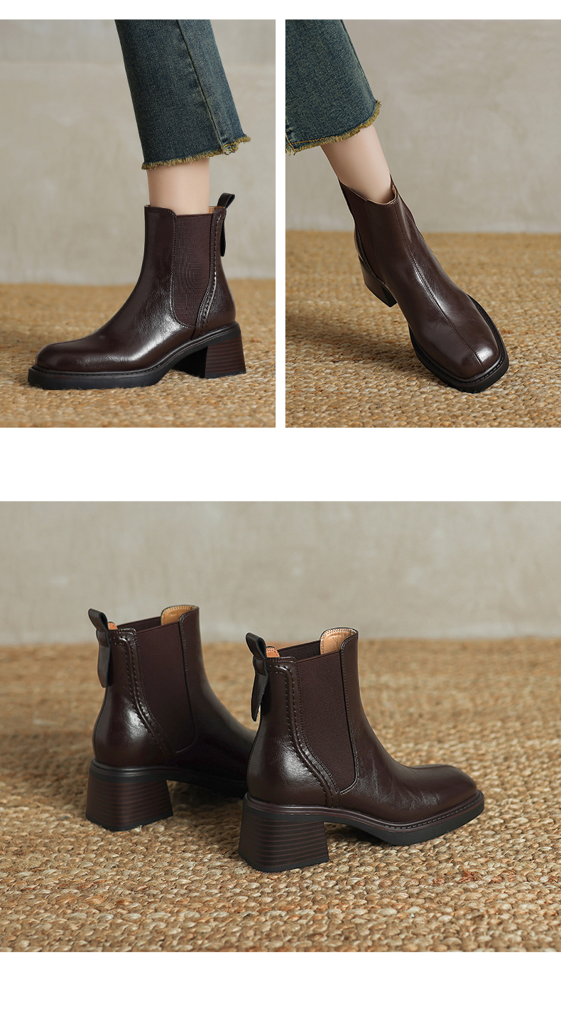 阿么手工女鞋真皮方头舒适切尔西靴2025新款短筒气质高跟单靴6CM
