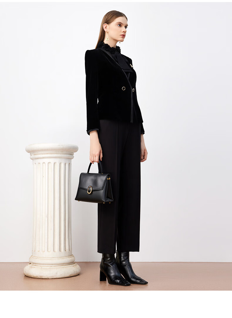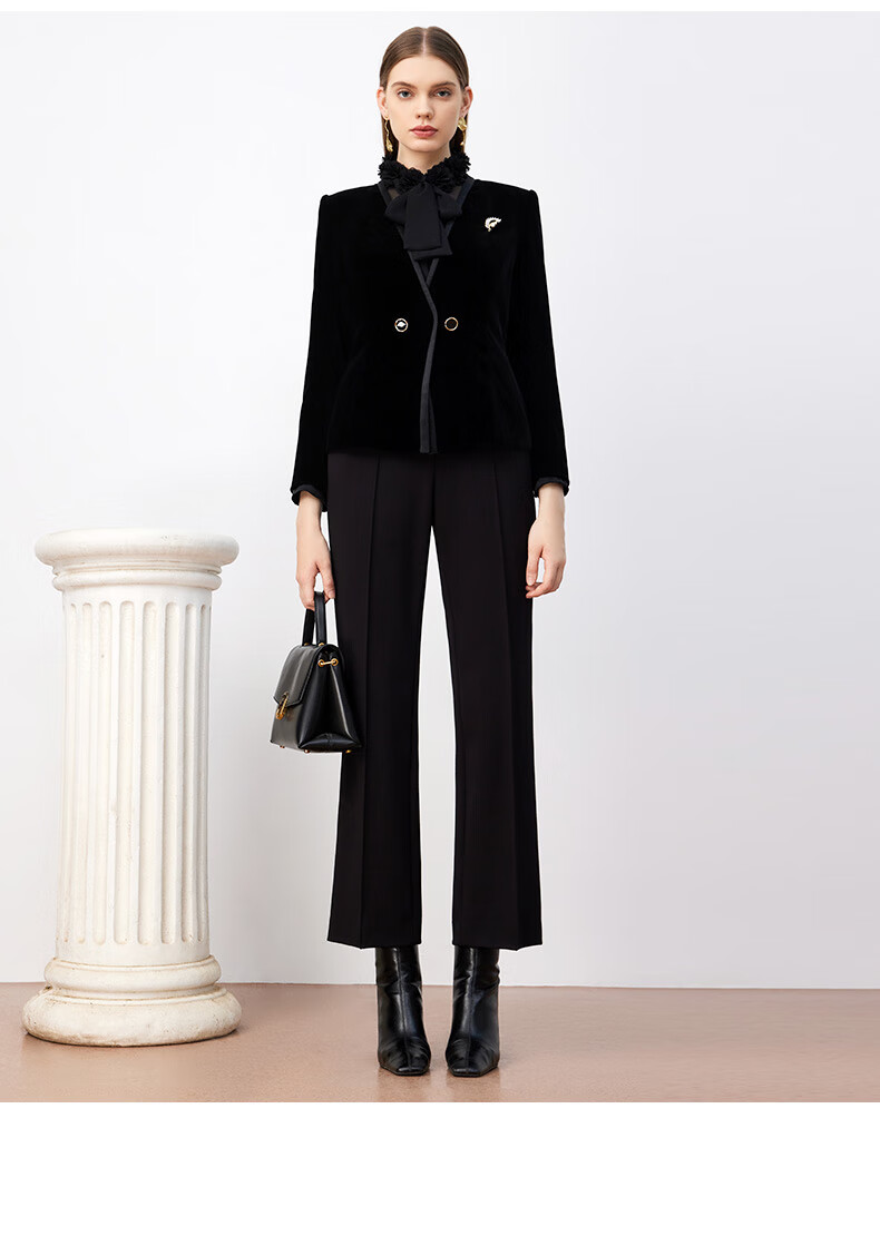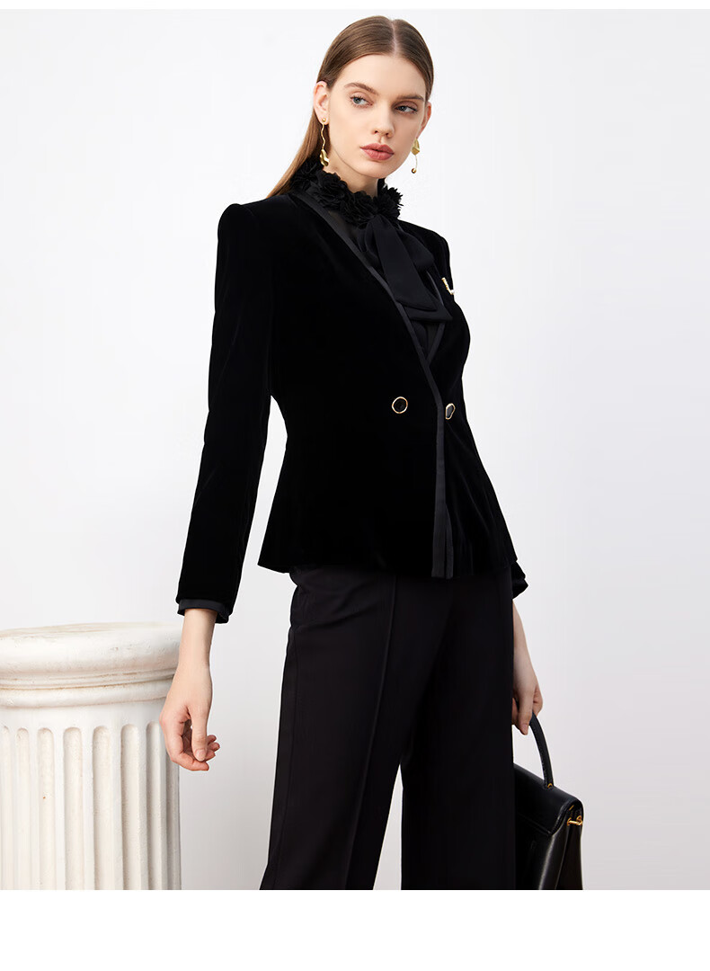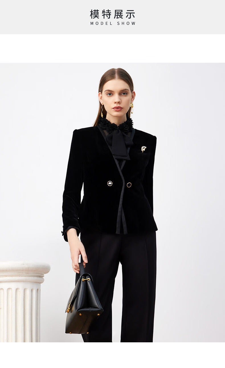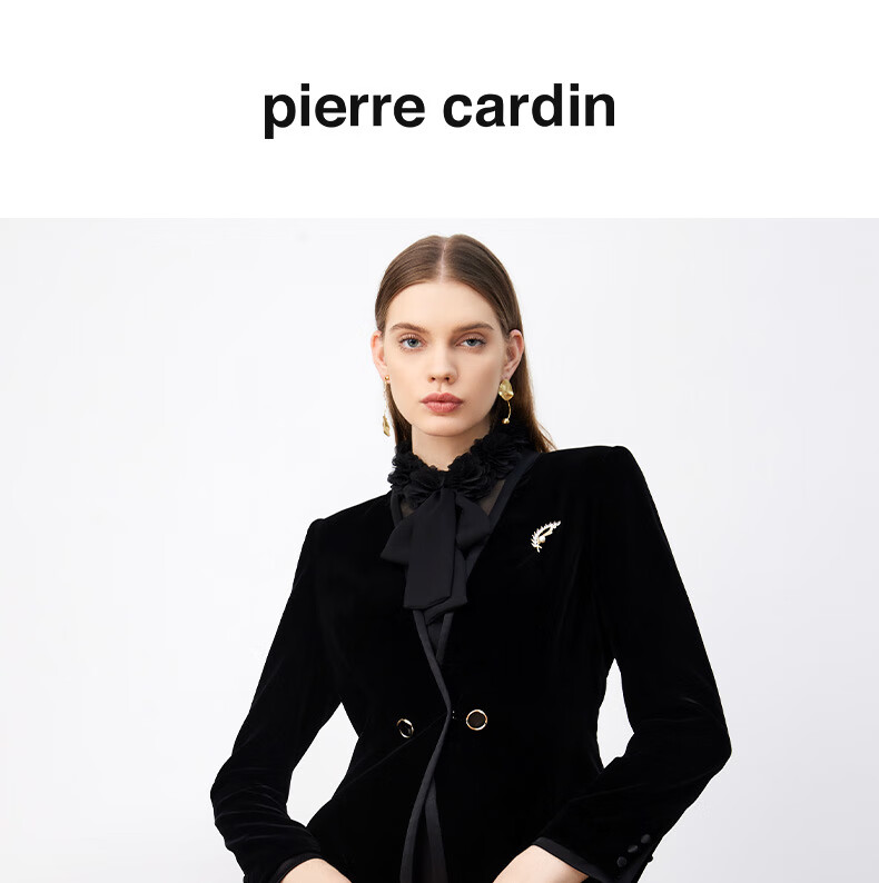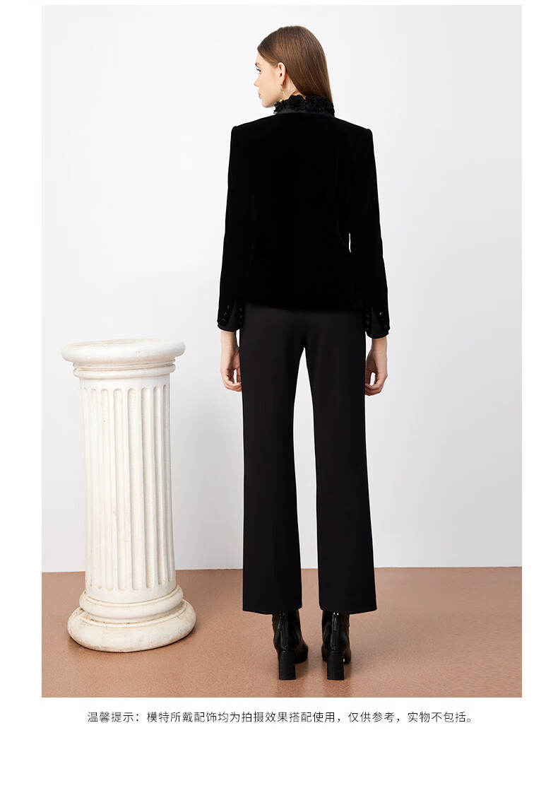 皮尔卡丹女装西装春秋丝绒花边立领日常时尚设计外套P3321U3997B0