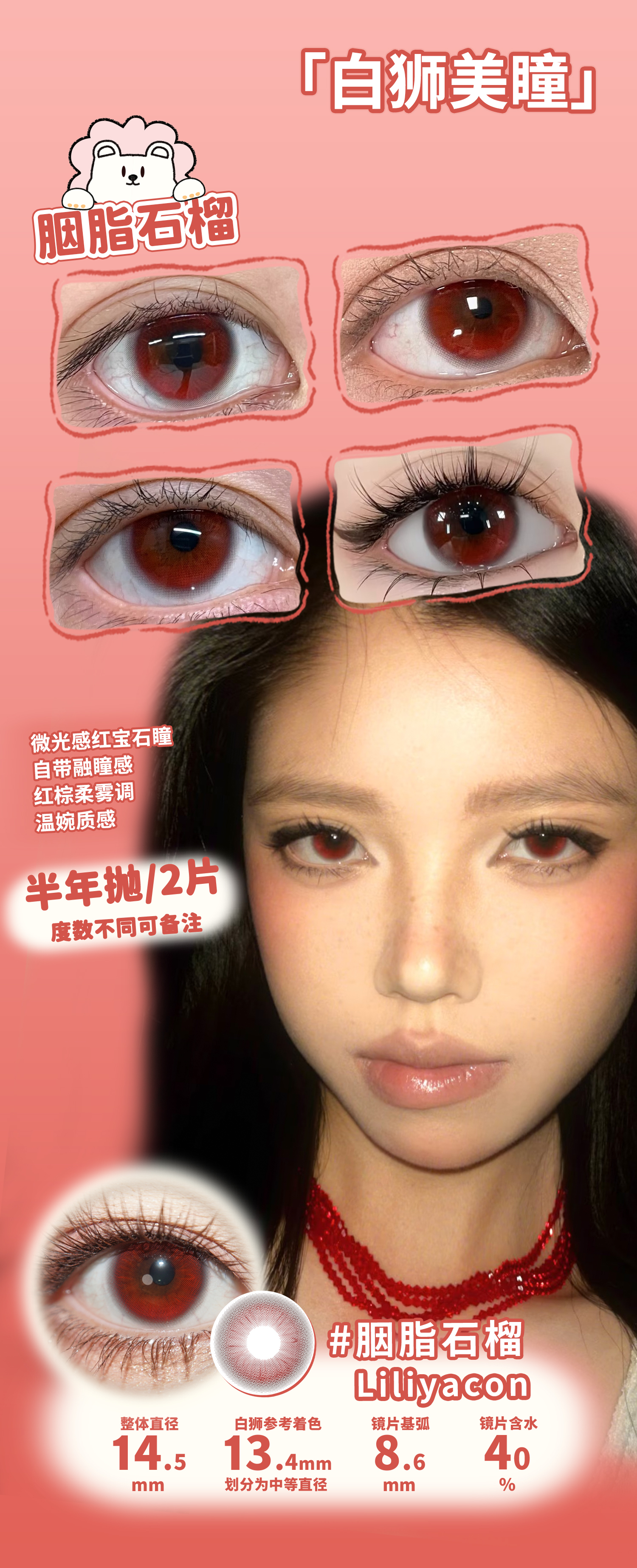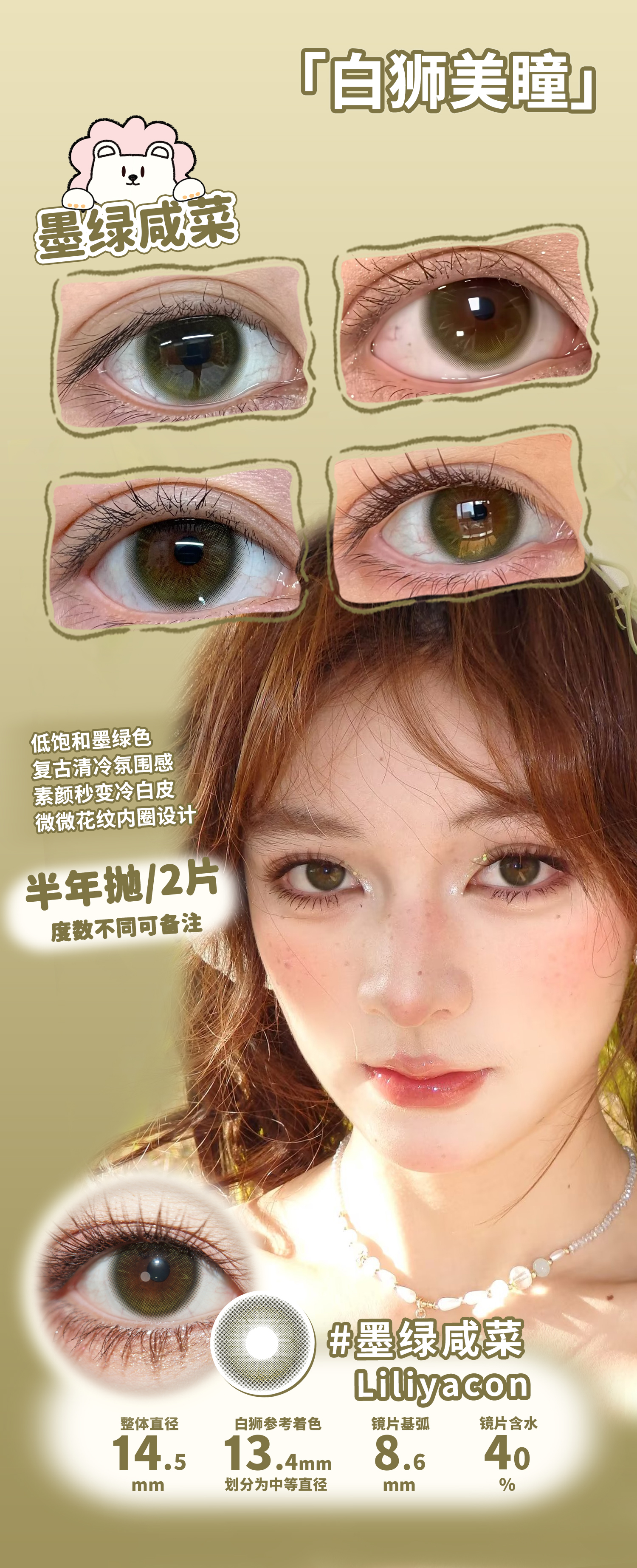 liliyacon旗下 ·青涩橄榄&流光碎金&胭脂石榴&墨绿咸菜· 14.5mm白狮参考着色中等直径 半年抛2片