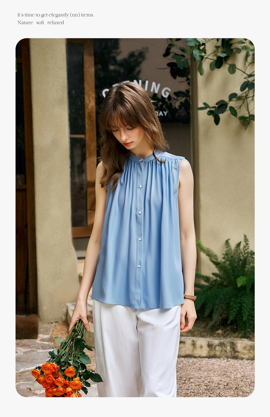 OLrain欧芮儿蓝色宽松慵懒风衬衫女夏季2025新款小圆领无袖上衣