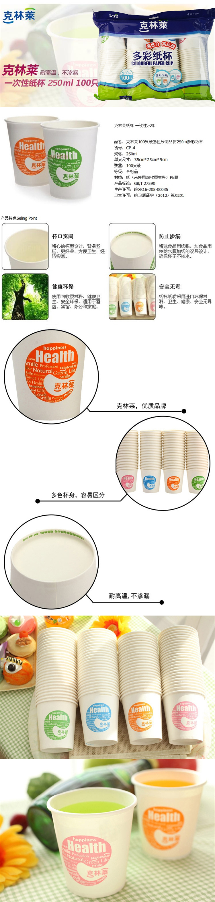 克林莱韩国一次性纸杯100只装 多彩纸杯 200ml