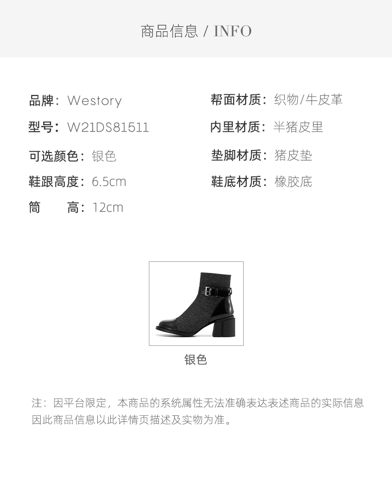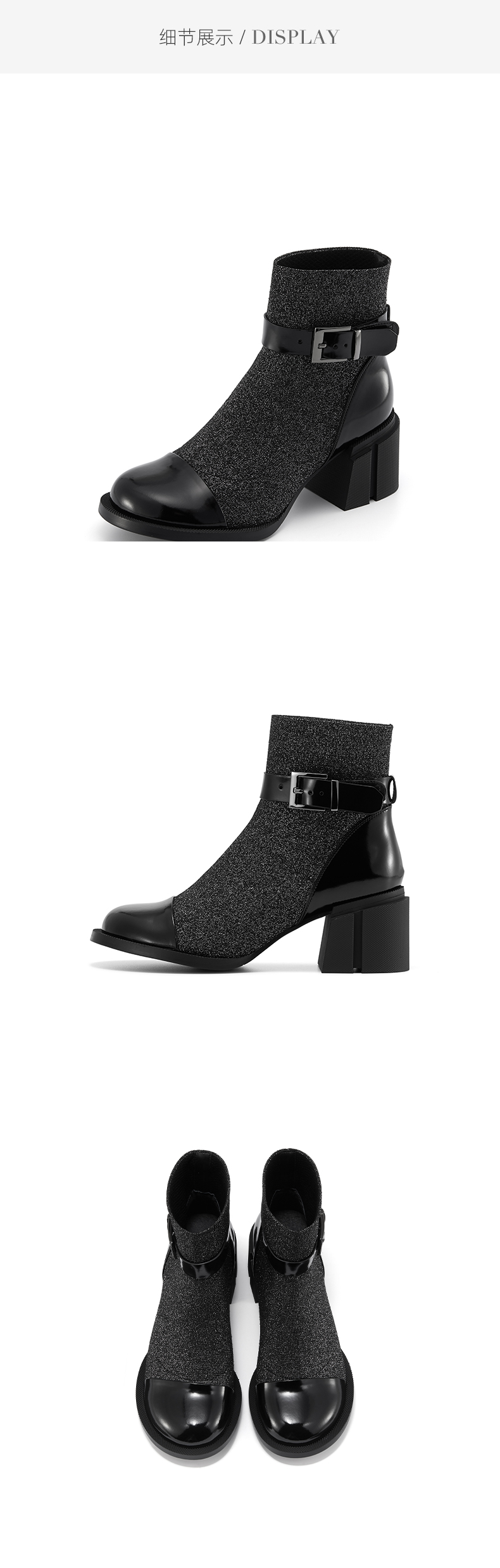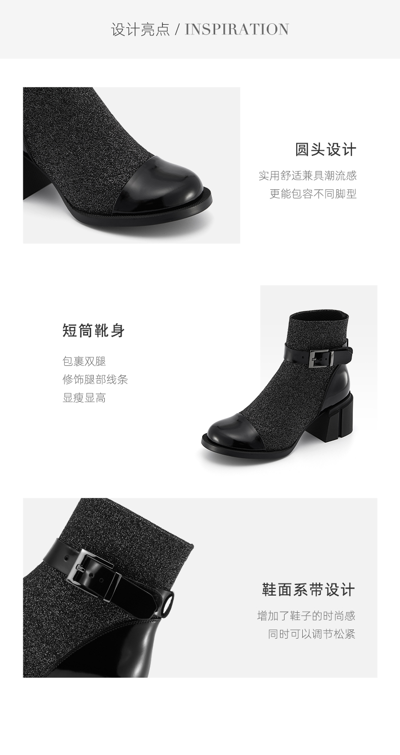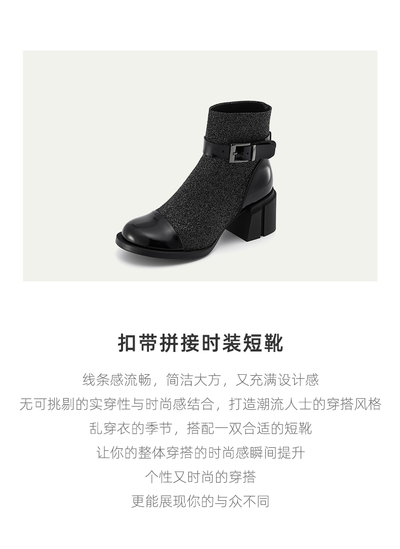 westory秋冬粗跟短靴圆头拼接扣带复古时装靴女靴袜靴黑色W21DS81511