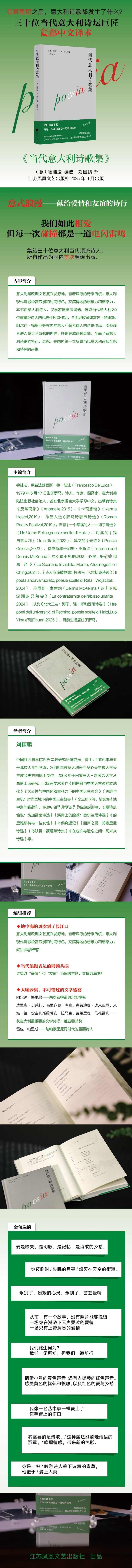 意大利是欧洲文艺复兴发源地,有着深厚的诗歌传统。意大利现代诗歌极富浪漫和时尚特色,充满异域的想象力和感染力。本书由意大利诗人、诗歌翻译家德陆法编选,选取当代意大利30位重量级诗人的代表性短诗作品,全面地收录如皮埃尔·保罗·帕索里尼、米兰·昆德拉等在内的意大利著名诗人的诗歌作品,引领读者进入意大利诗歌的世界,领略异域诗歌风情,全面了解意大利诗歌的特点、风貌,是国内第一本反映意大利诗坛全貌和特色的诗集。
