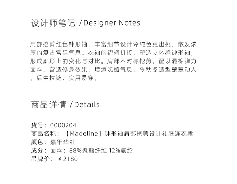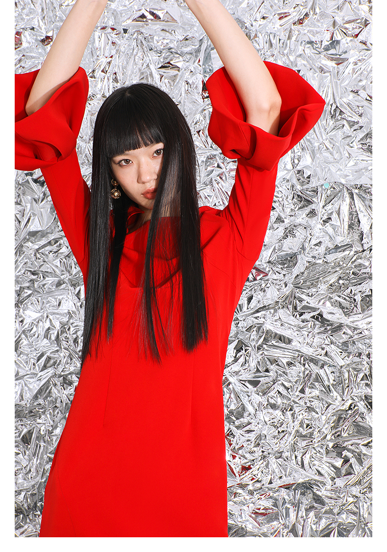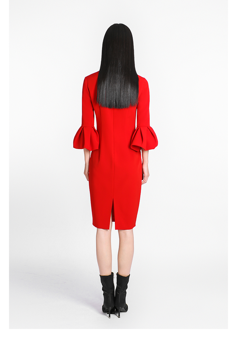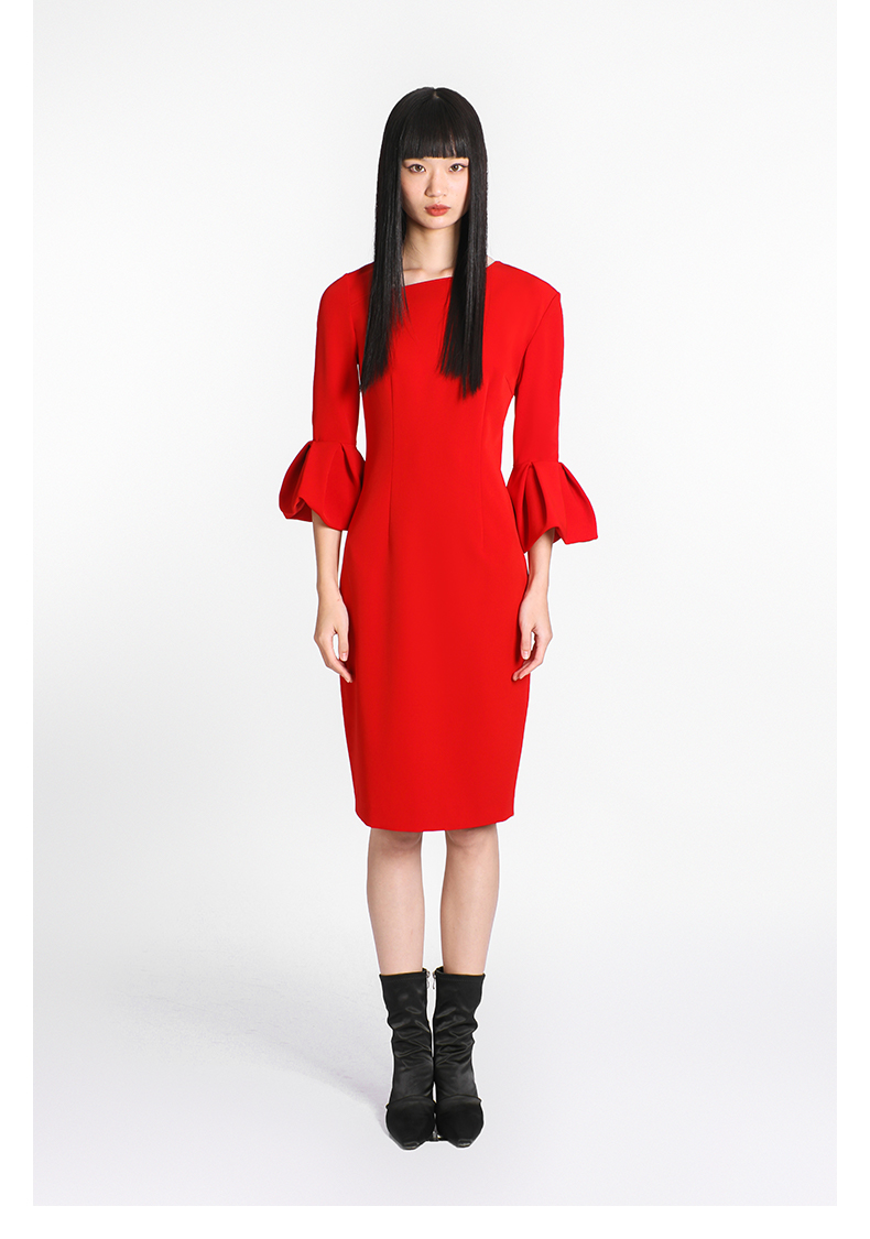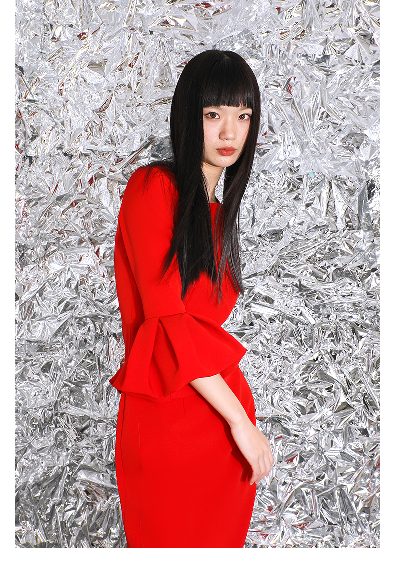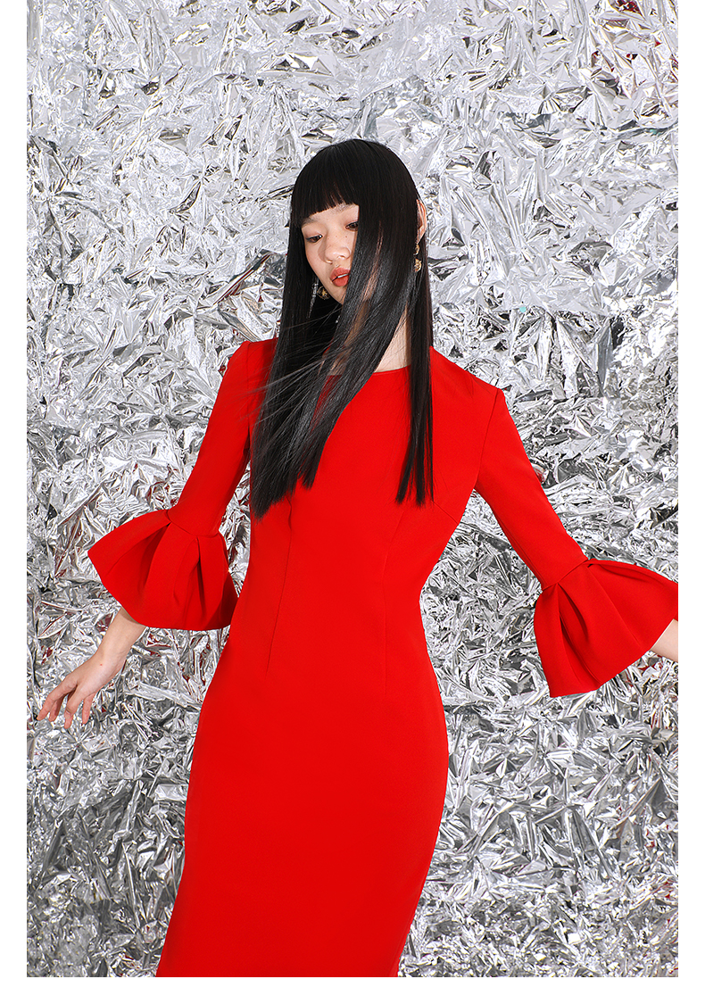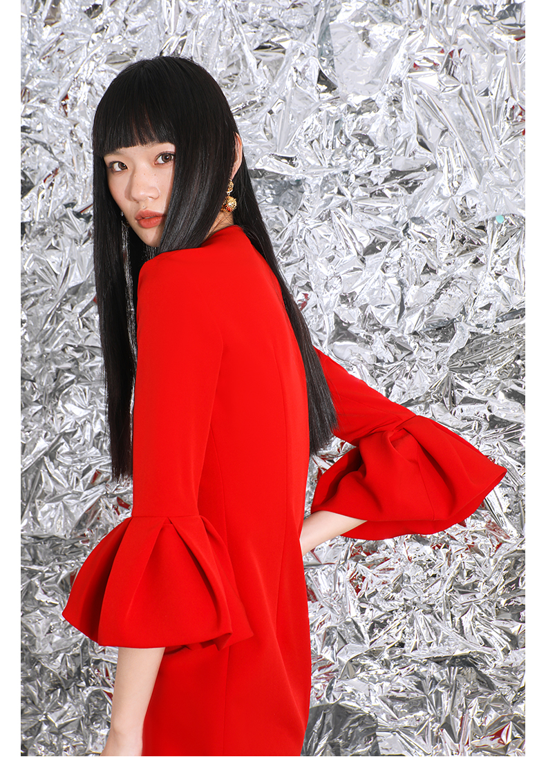 【Madeline 】红色钟形袖肩部挖剪连身裙/ 0000204