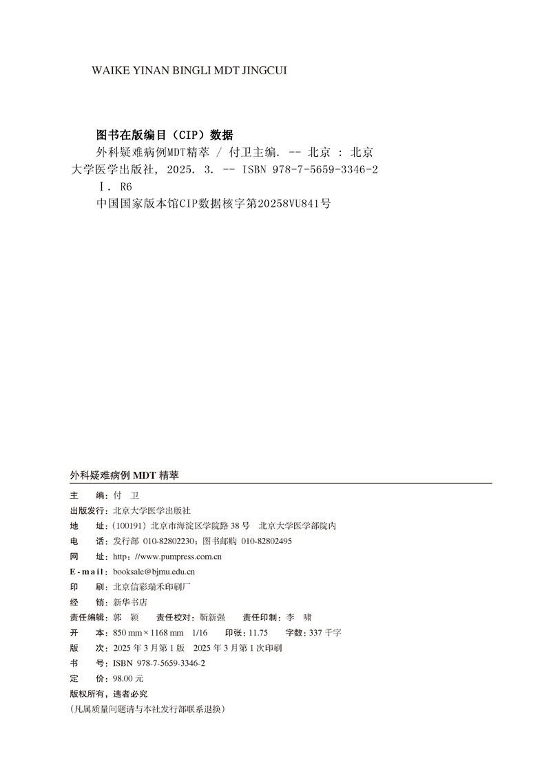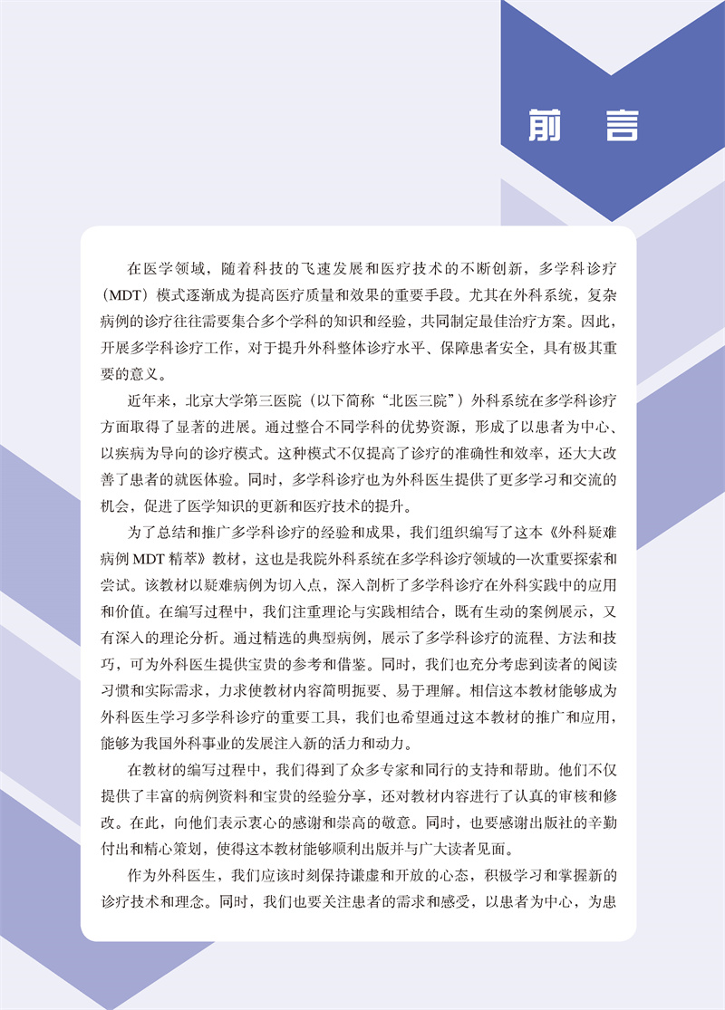 北医三院外科教研室组织编写,旨在总结和推广MDT多学科诊疗的经验和成果。本书以疑难病例为切入点,深入剖析了MDT多学科诊疗在外科实践中的应用和价值。全书内容注重理论与实践相结合,既有深入的理论分析,又有生动的案例展示。通过精选的典型病例,展示了MDT多学科诊疗的流程、方法和技巧。同时,教材内容力求简明扼要、易于理解,相信能够为外科医生提供宝贵的参考和借鉴。