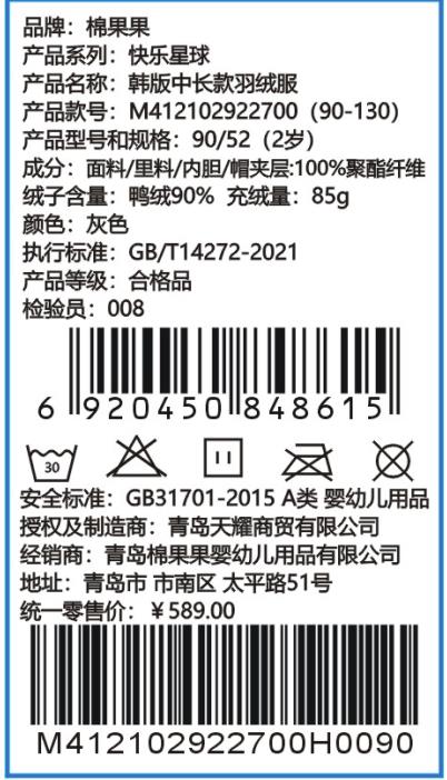 | 充绒量(G) | 85 | 93 | 102 | 112 | 122 |
