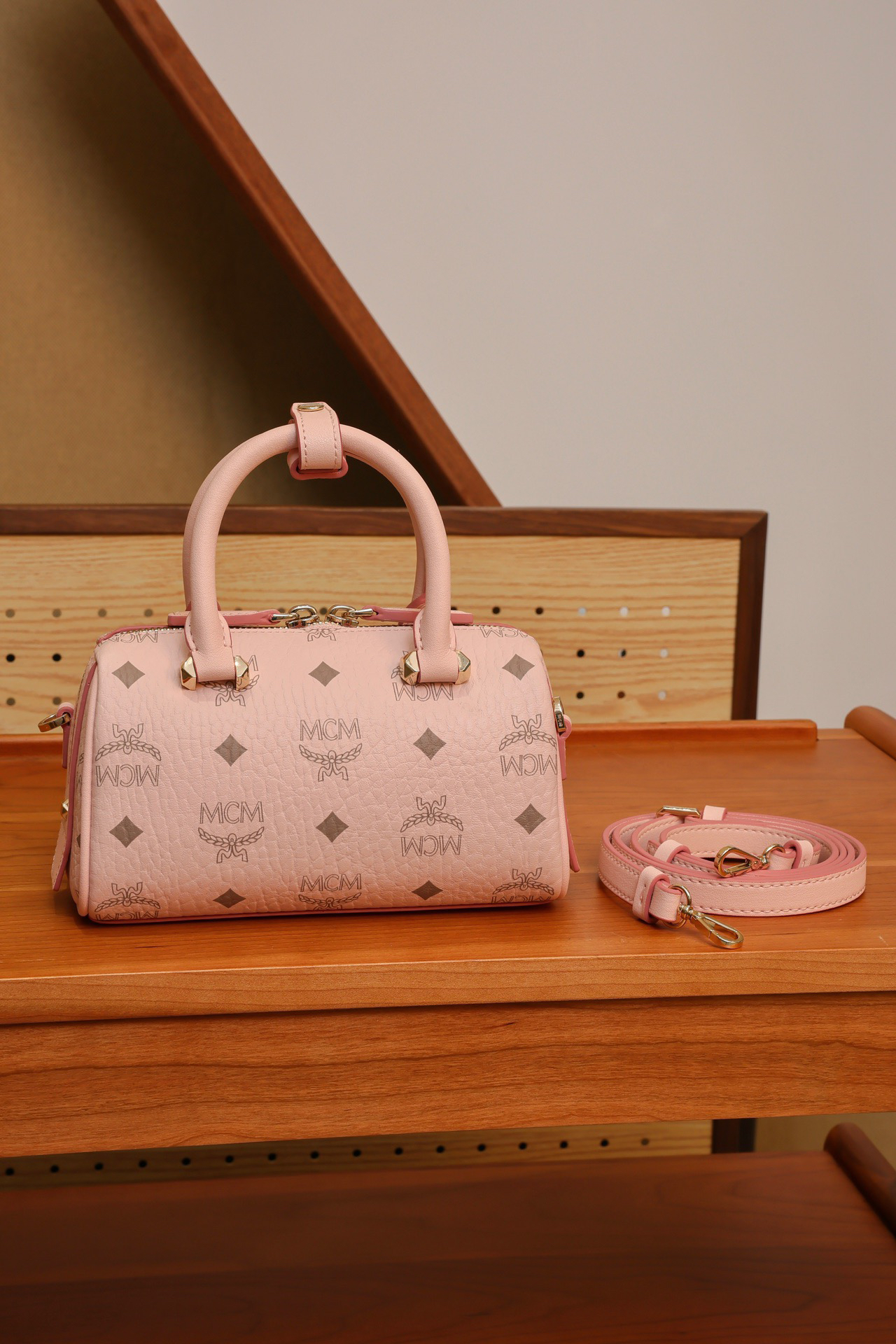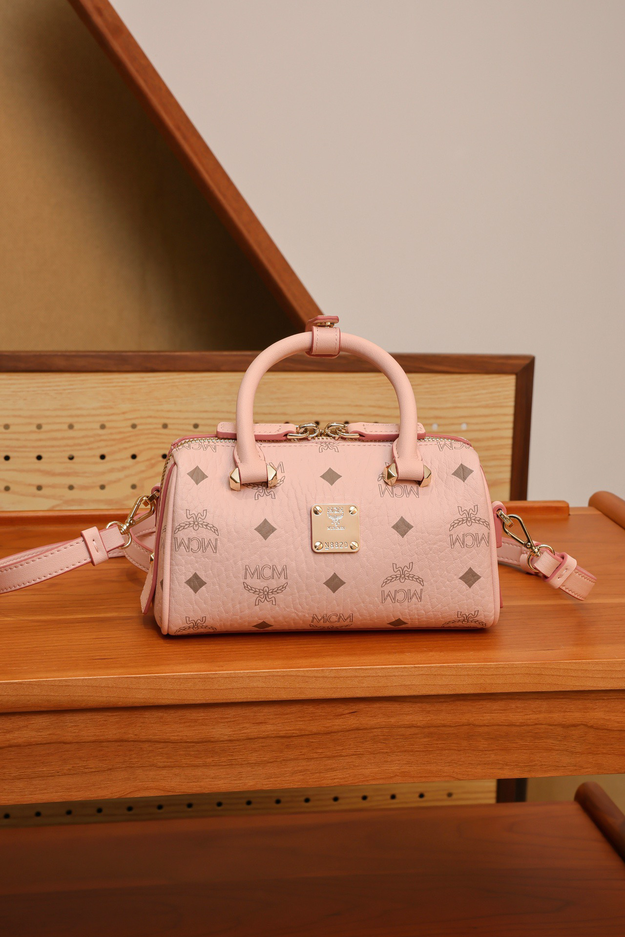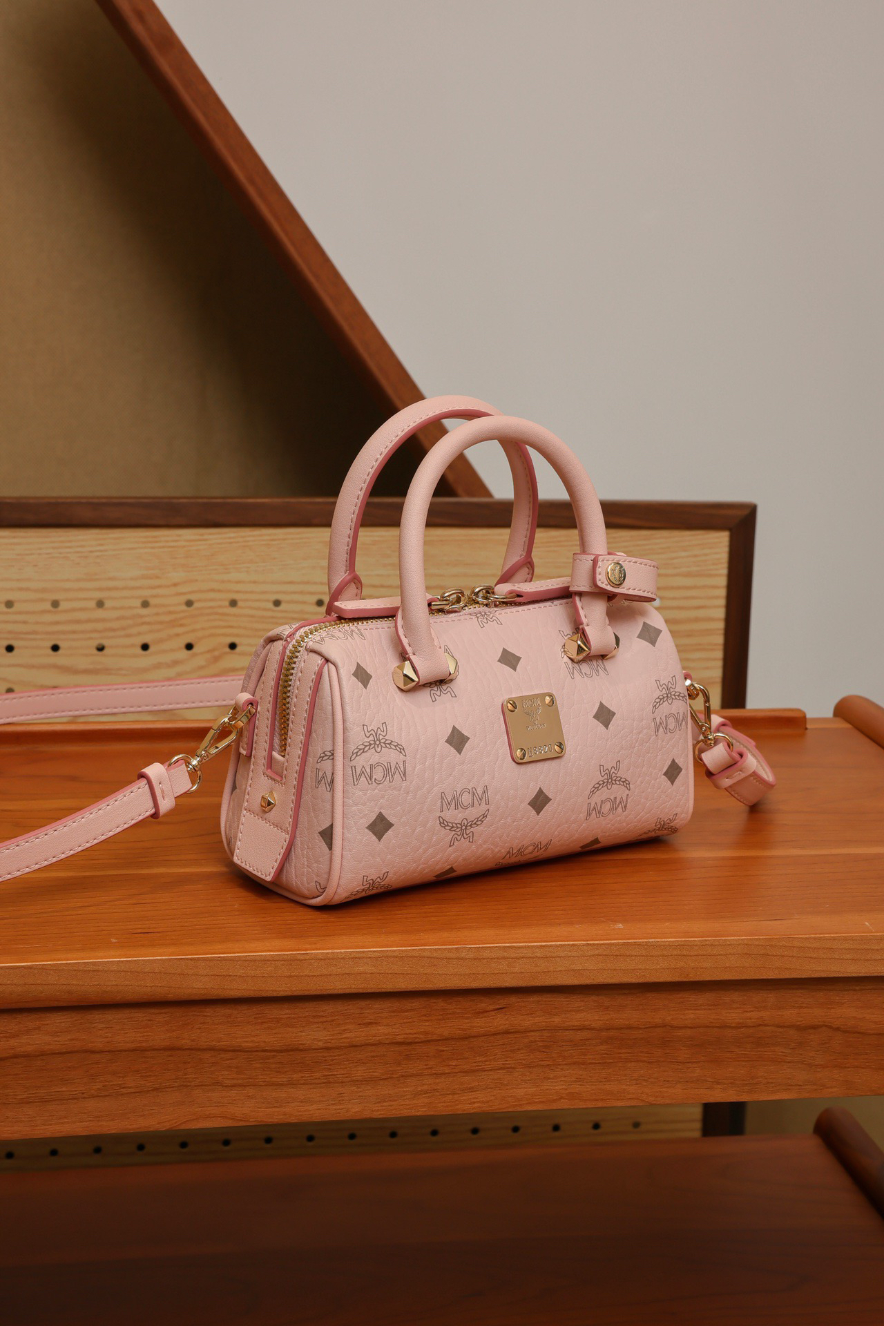 秋冬特惠💰760 原单MCM 原厂皮 樱花粉迷你𝗠𝗶𝗻𝗶波士顿枕头包MWBAASE03CO001 老花满印 🉑️单肩🉑️斜挎🉑️手拧 这款mini波士顿包