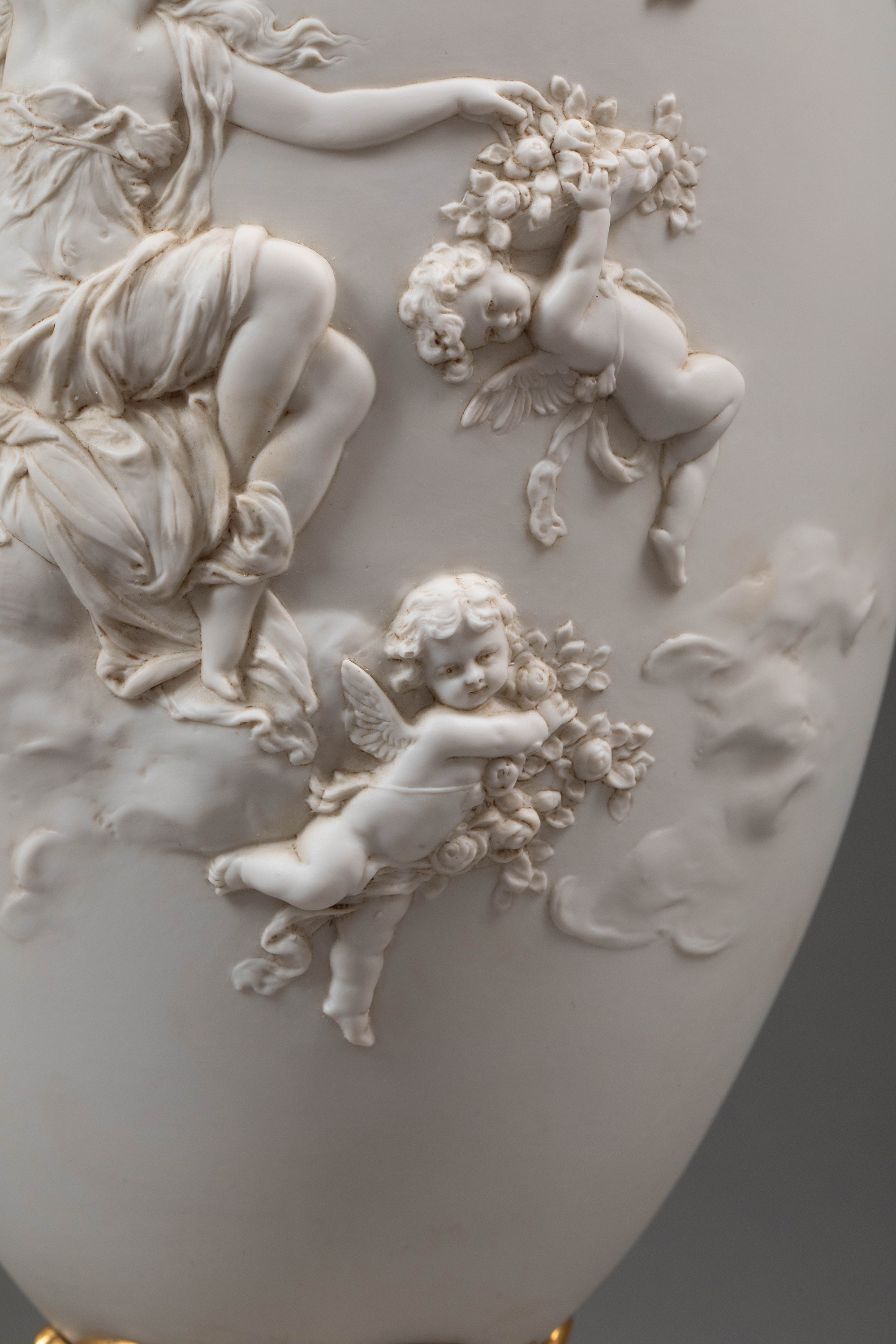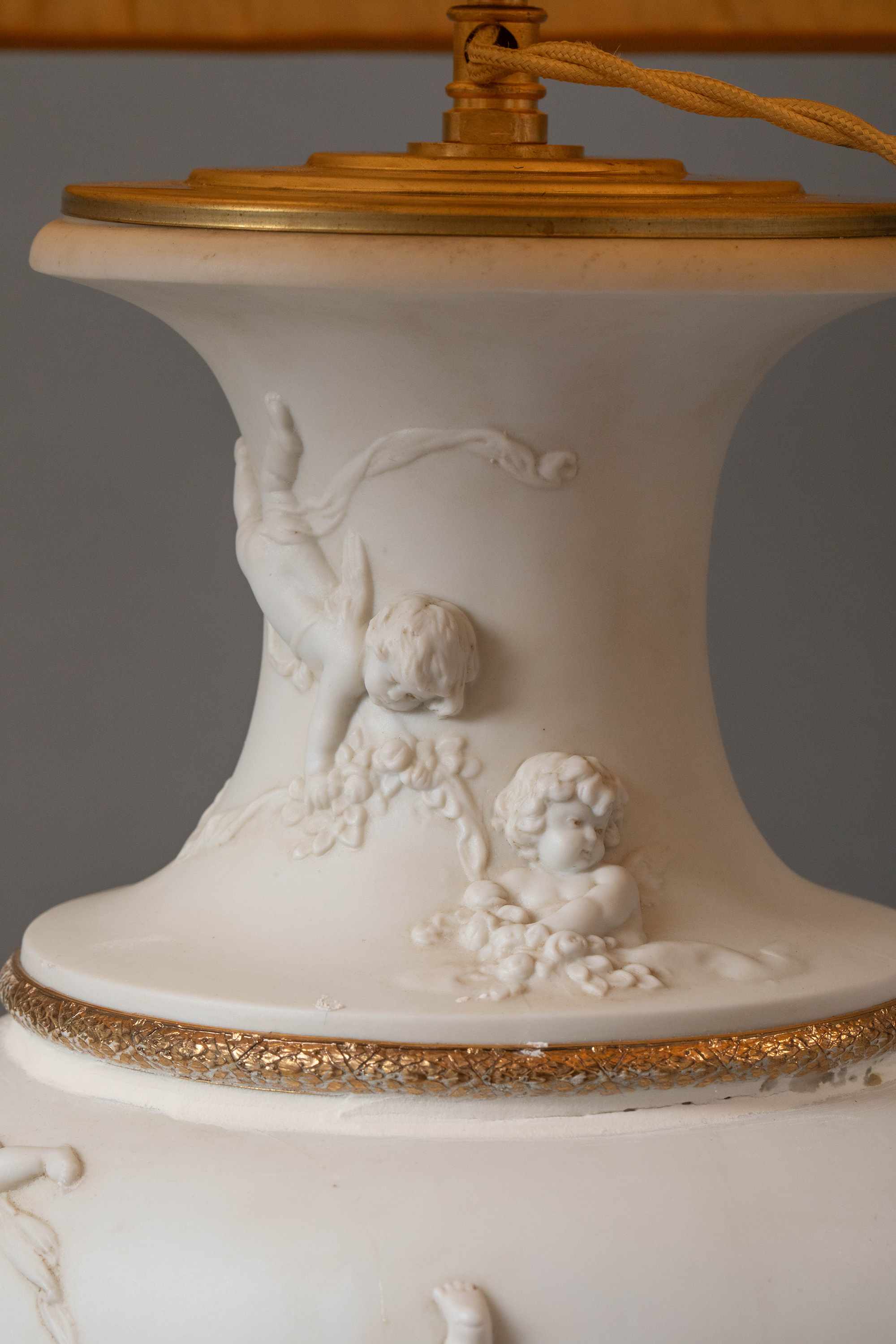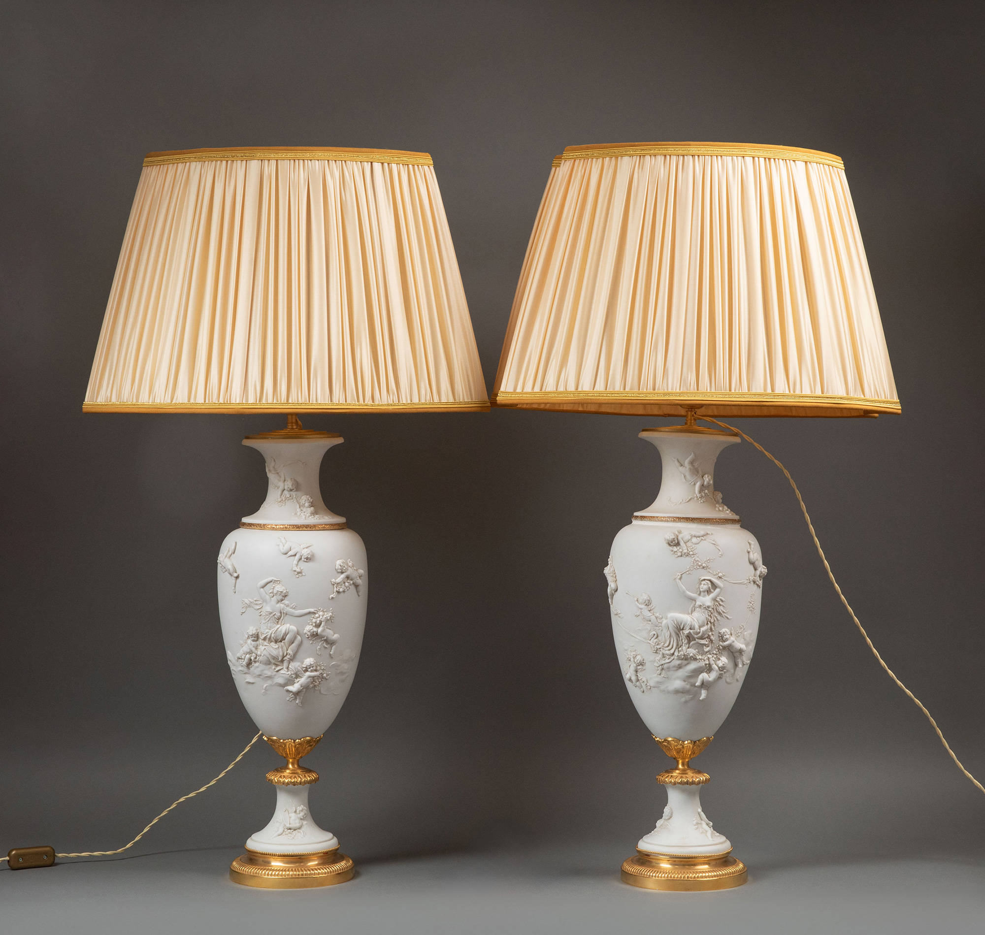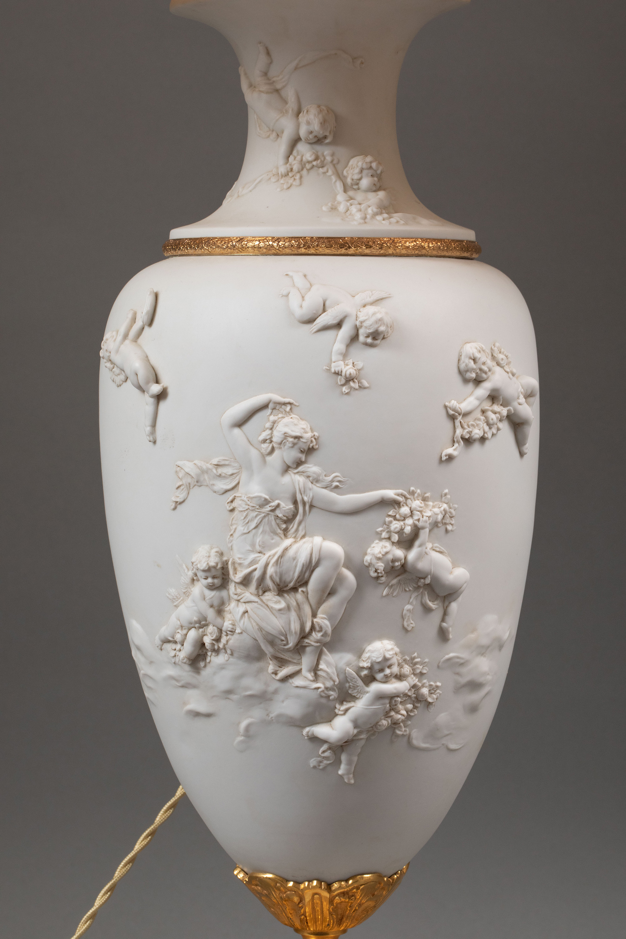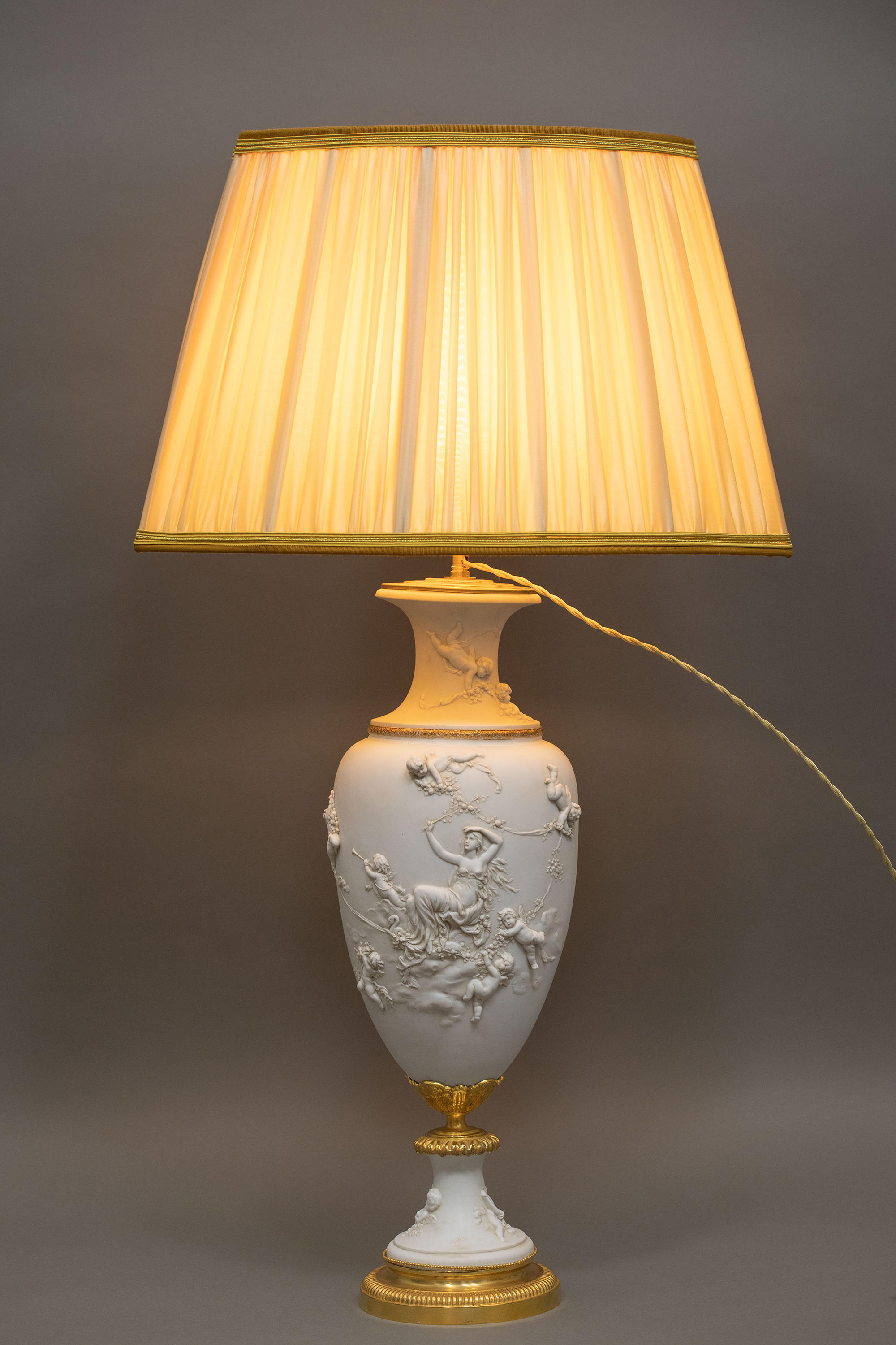 19世纪末法国出品铜鎏金精雕装饰古典女神与天使主题素胎瓷花瓶及布面灯罩台灯一对