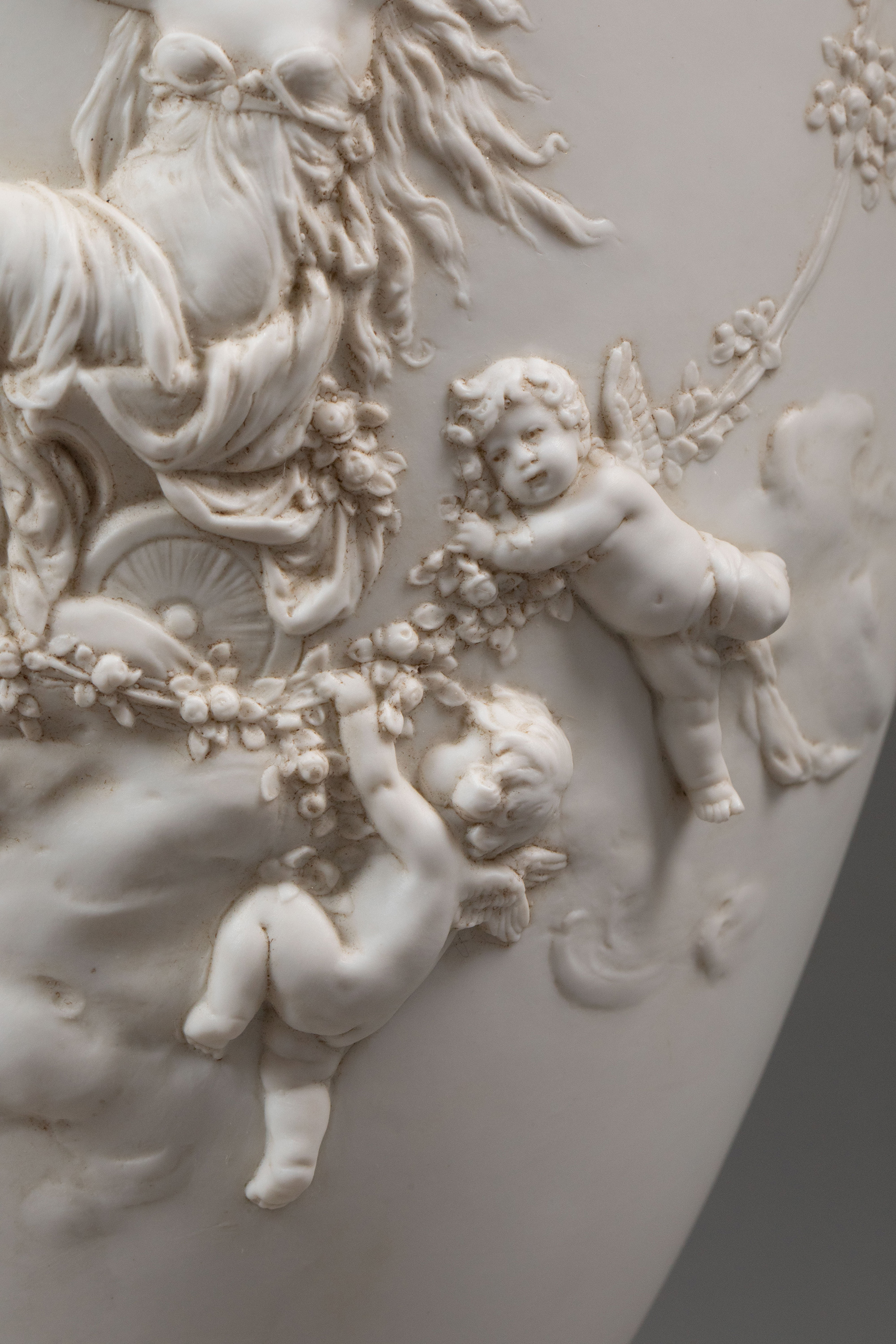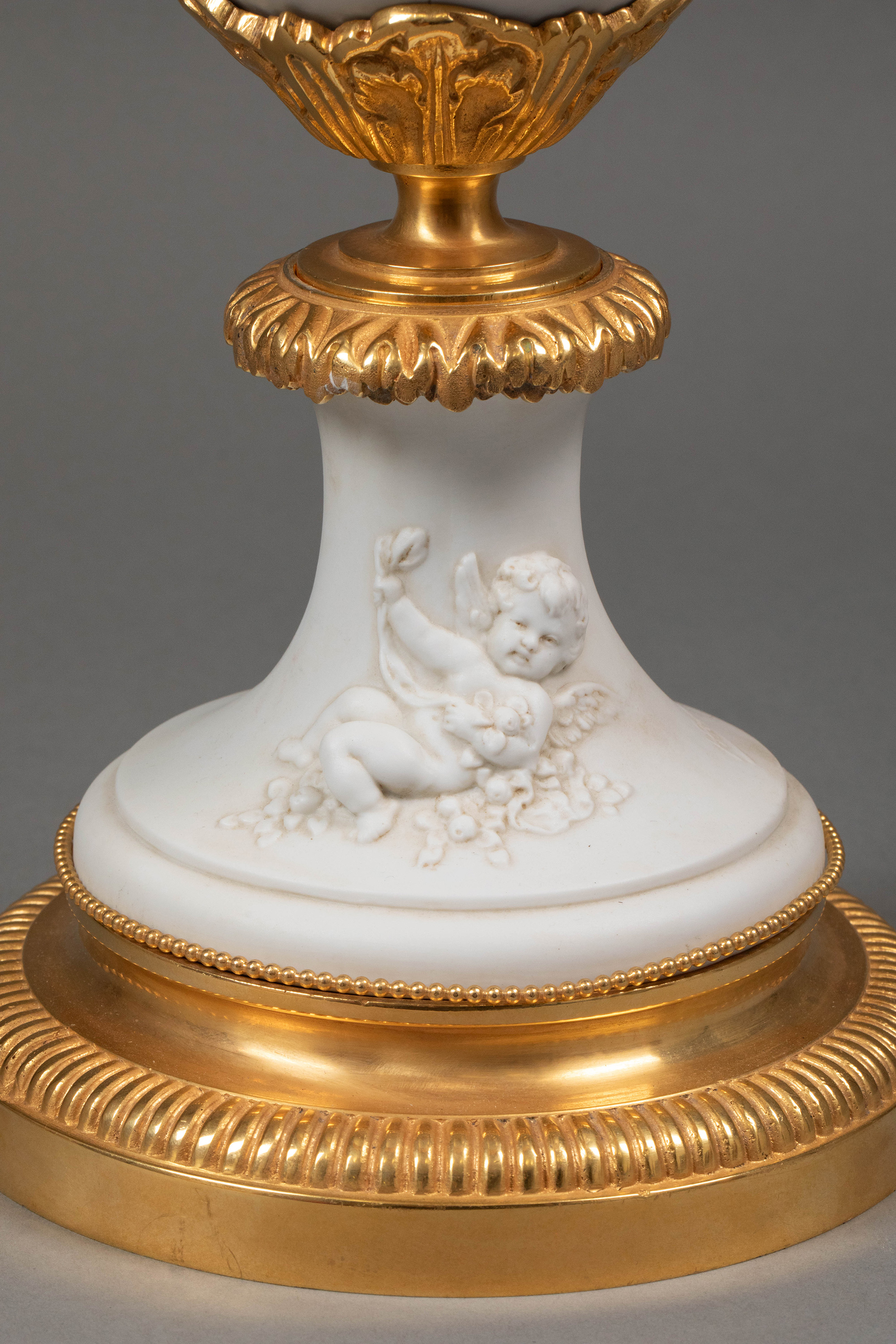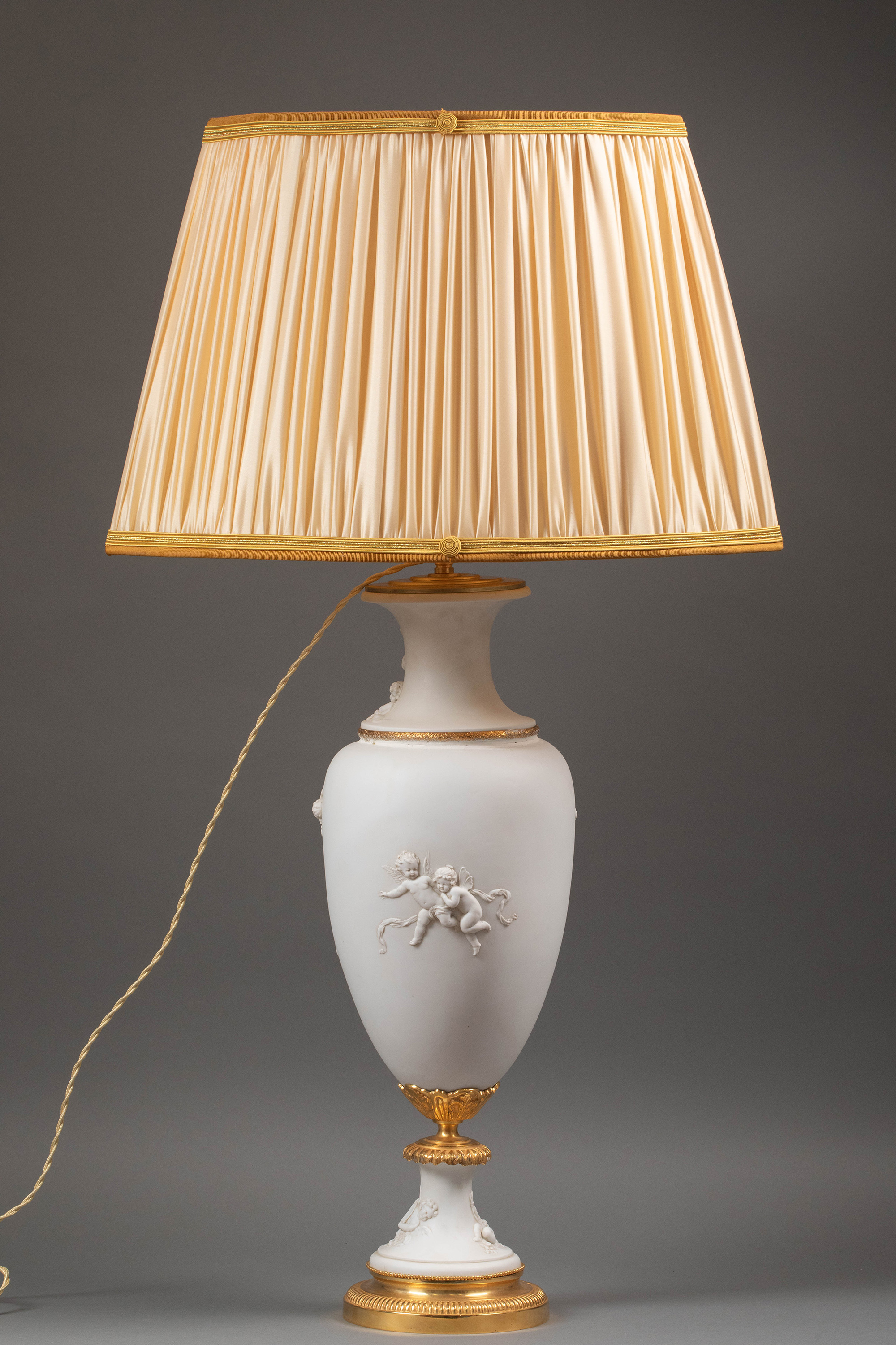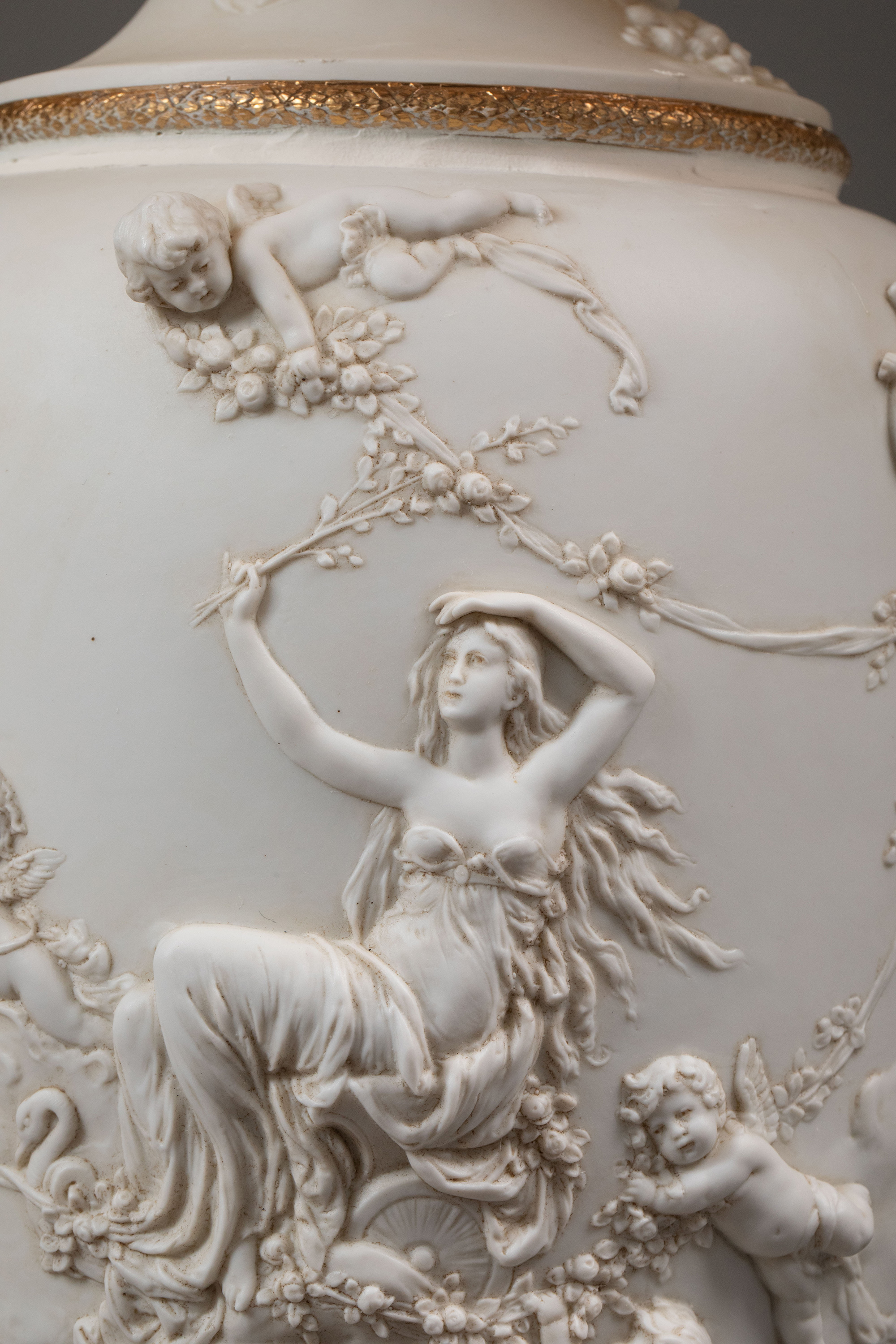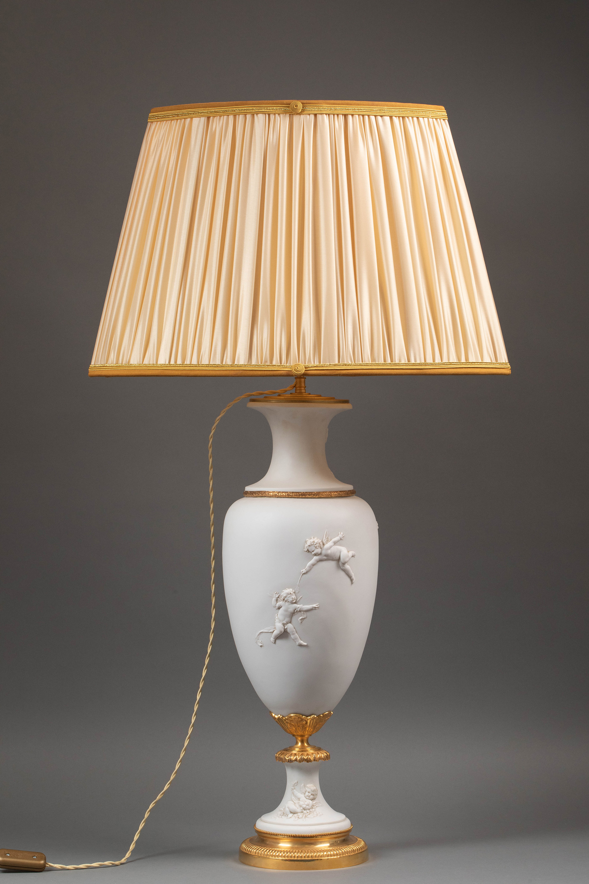 19世纪末法国出品铜鎏金精雕装饰古典女神与天使主题素胎瓷花瓶及布面灯罩台灯一对