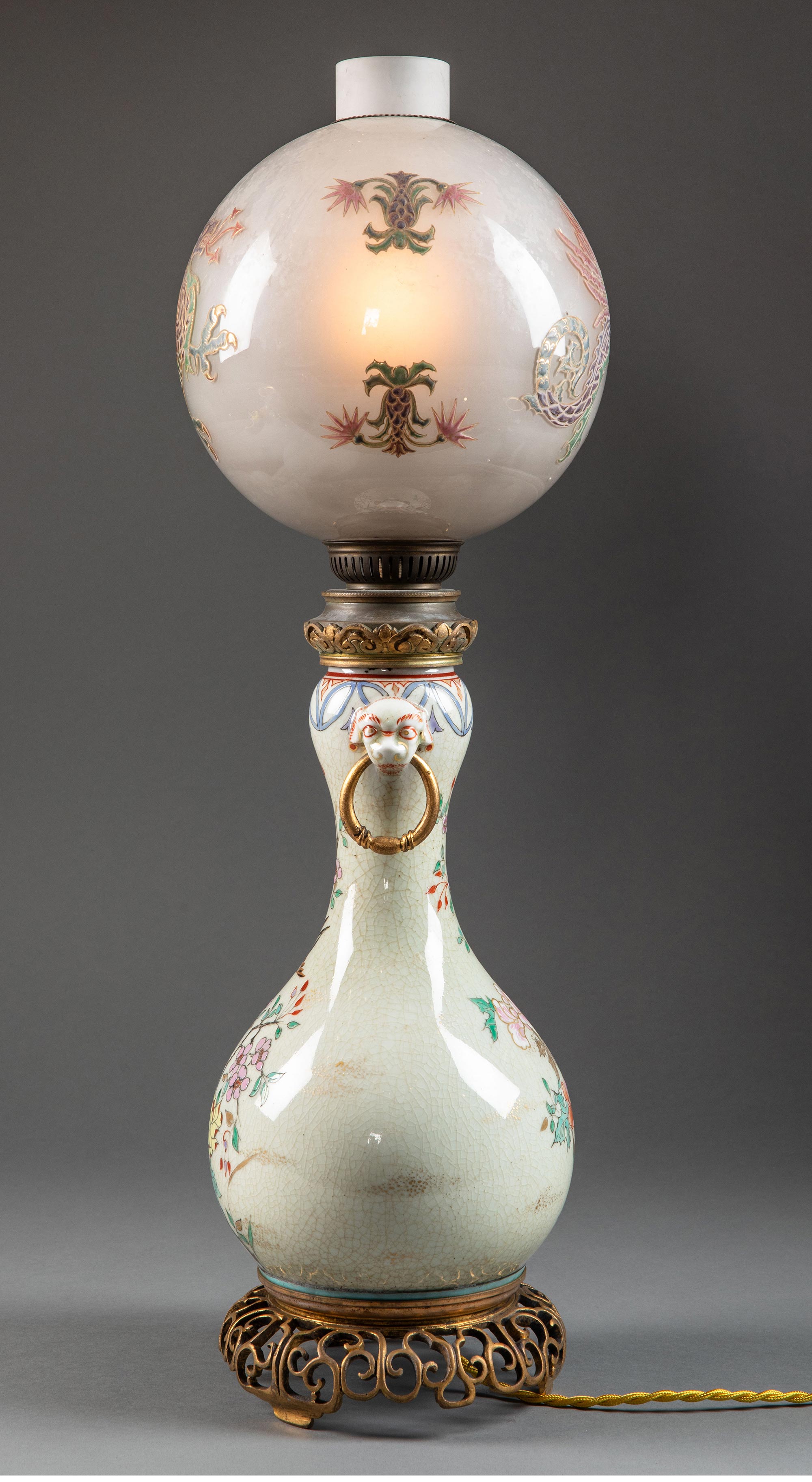 独角鹿西洋古董 1870年代法国出品东方风格铜鎏金精雕底座嵌龙纹珐琅彩绘水晶灯罩装饰「喜上梅梢」主题冰裂纹瓷瓶台灯一对